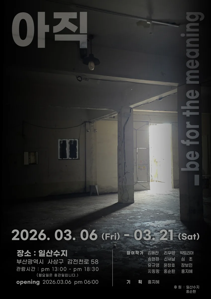 일산수지는 동아대학교 미술학과 석·박사 과정 작가들의 기획전 《아직 _ be for the meaning》을 개최합니다. 회화는 오랫동안 특정한 공간 구조 안에서 읽혀왔다. 균질한 벽과 통제된 빛, 중립적인 동선은 화면을 하나의 자율적 평면으로 인식하게 만드는 조건이었다. 그 구조는 회화를 보호하는 동시에, 읽는 방식을 규정해왔다. 이번 전시는 그 전제를 전면화하지 않는다. 대신 회화를 다른 조건 속에 둔다. 화면은 더 이상 배경과 분리된 독립적 장면으로만 존재하지 않는다. 공간과의 관계, 거리, 높이, 간격은 화면의 일부가 된다. 화이트큐브는 회화를 정제된 평면으로 안정시키는 장치였다면, 이 전시는 그 장치를 전제하지 않는다. 회화는 동일한 장르로 남아 있으면서도, 그 위치와 조건에 따라 다른 방식으로 드러난다. 공간은 더 이상 투명한 배경으로 기능하지 않는다. 화면은 독립된 이미지로만 존재하지 않고, 놓이는 방식과 관계 속에서 읽힌다. 회화는 스스로의 자율성에 기대기보다, 자신이 놓인 조건과 함께 구성된다. 《아직 _ be for the meaning》은 회화를 새로운 형식으로 재정의하지 않는다. 다만 회화를 둘러싼 공간 구조와 읽기 방식을 하나의 층위로 드러낸다. 그 안에서 회화는 다시 평면이 되고, 다시 대상이 된다. — 참여작가 김동찬 · 리우양 · 빅토리아 · 송현정 · 신새날 · 심초 유규영 · 윤창호 · 장보민 · 지핑핑 · 홍순환 · 홍지혜