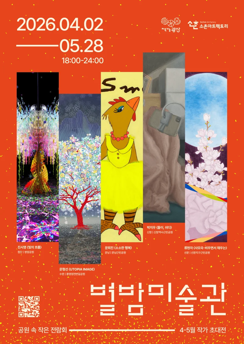🌙 공원 속 작은 전람회 ✨ 「별밤미술관」 4-5월 작가초대전 ✨ 📍 기간 2026. 4. 2.(목) ~ 5. 28.(목) 매일 18:00 ~ 24:00 (야간 운영) 📍 장소 별밤미술관 첨단 · 수완 · 운남 · 신창 · 선운 🎨 참여작가 문형선 · 진시영 · 문희진 · 박지우 · 류현자 — 🌌 첨단 | 진시영 작가 <빛의 흐름> 어둠 속에서 발현되는 빛의 에너지와 그 교차가 만들어내는 존재의 흐름 🌳 수완 | 문형선 작가 가상과 현실의 경계가 모호해진 오늘날, 내면 깊숙이 자리한 ‘유토피아’라는 이상향을 패턴화하여 긍정적 에너지를 화폭에 상징적으로 투사 🐥 운남 | 문희진 작가 <소소한 행복> 일상의 소소한 순간들을 매개로 위안과 행복의 메시지를 전하며, 각기 다른 조각들의 조화와 알록달록한 색채로 삶의 아름다운 풍경을 표현 🏠 신창 | 박지우 작가 <들이, 쉬다> 청년들의 1인 거주 공간을 통해 자유의 구조를 탐구 🌕 선운 | 류현자 작가 <사모곡-비우면서 채우는> 전통 버선을 소재로 어머니의 사랑을 그려낸 작품으로, 여백 속 세필 사경과 보름달 등의 장치를 통해 비움과 채움의 명상적 경지를 표현