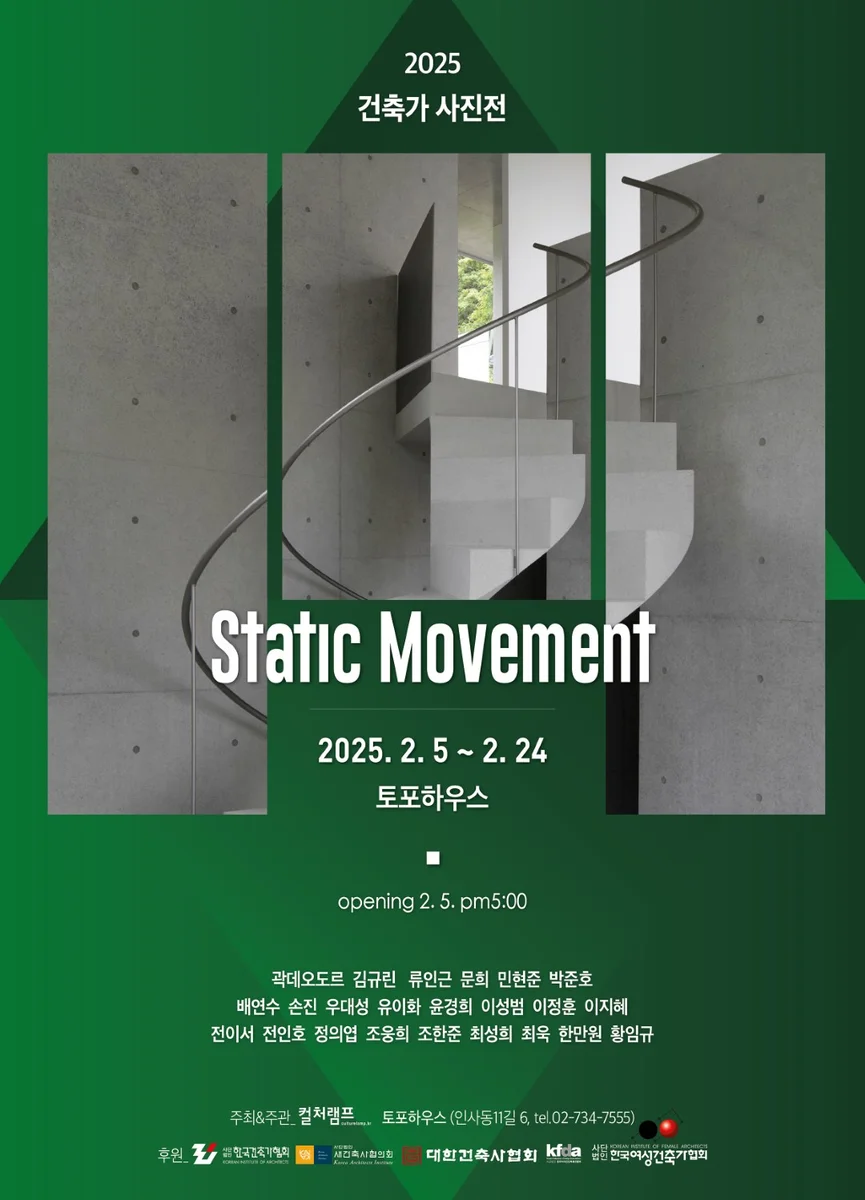 전시 개요 OVERVIEW 건축가에게 사진은 무엇보다도 중요한 매체입니다. 건축 작업이 시작되는 대상지 답사부터 구상단계 그리고 최종 결과물까지 사진으로 기록합니다. 실무영역에서 그리고 일상에서 기록을 위해 사진을 가까이하기도 하지만 진지하게 사진 작업을 하는 건축가들도 적지 않습니다. 이번 전시는 건축가들의 시선은 어디를 향하는지, 건축가들이 렌즈를 통해 본 세상은 어떠한지, 사진으로 표현하고자 하는 감성의 메세지는 무엇인지를 전시공간에서 오롯이 만나볼 수 있는 기회입니다. 다양한 사진을 통해 그동안 건축작품으로 만나왔던 건축가들의 색다름과 개별성을 발견할 수 있을 것입니다. 토포하우스 제3전시실 전시전경1 토포하우스 제3전시실 전시전경2 토포하우스 제3전시실 전시전경3 건축가들의 주된 작업인 설계를 위한 드로잉이 아닌 예술적 드로잉 작업을 보여주었던 지난 해의 ‘2024 건축가 드로잉전’(2024.1.24.~2.8)에 이어 건축가들의 사유방식에 접근하고, 건축에 대한 대중들의 친밀도를 높이기 위해 기획되었습니다.