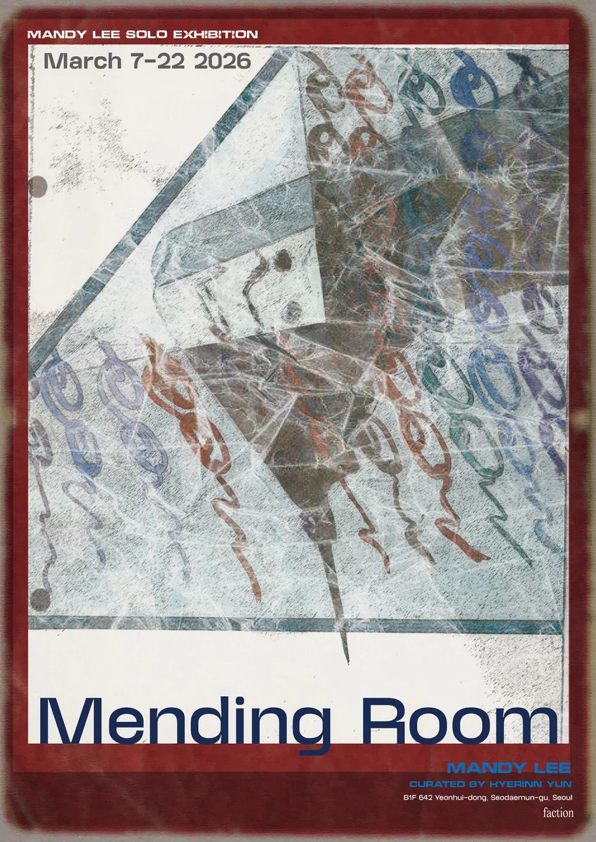 《맨딩룸 Mending Room》의 형태를 지탱하는 것은 잠정적 조건들이다. 밀랍을 입힌 섬유 조각들은 견고한 형상을 유지하면서도 가역적 고정 상태에 머문다. 형상을 세우는 힘은 동시에 해체의 가능성을 품는다. 저항과 마찰을 소거하며 스스로를 재편해가는 세계의 결 위에서 어긋남은 정렬되고, 틈새는 흔적도 없이 메워진다. 맨디리는 그 매끈한 세계 위에서 미끄러짐을 거듭하며 균열 사이를 표류한다. 굳히고, 녹이고, 접고, 구기고, 꿰매는 집요한 손길은 매끄러움으로 회귀하려는 흐름에 맞서는 수선의 태도이다. 공간을 부유하는 부표들은 한때 어긋남이 존재했던 자리의 표식이자 임시의 좌표가 된다. 기획: 윤혜린 작가: 맨디리 그래픽 디자인: 송이영 설치 도움: 장시재, 조수연 사진: 남서원, 김해인 출처: 팩션