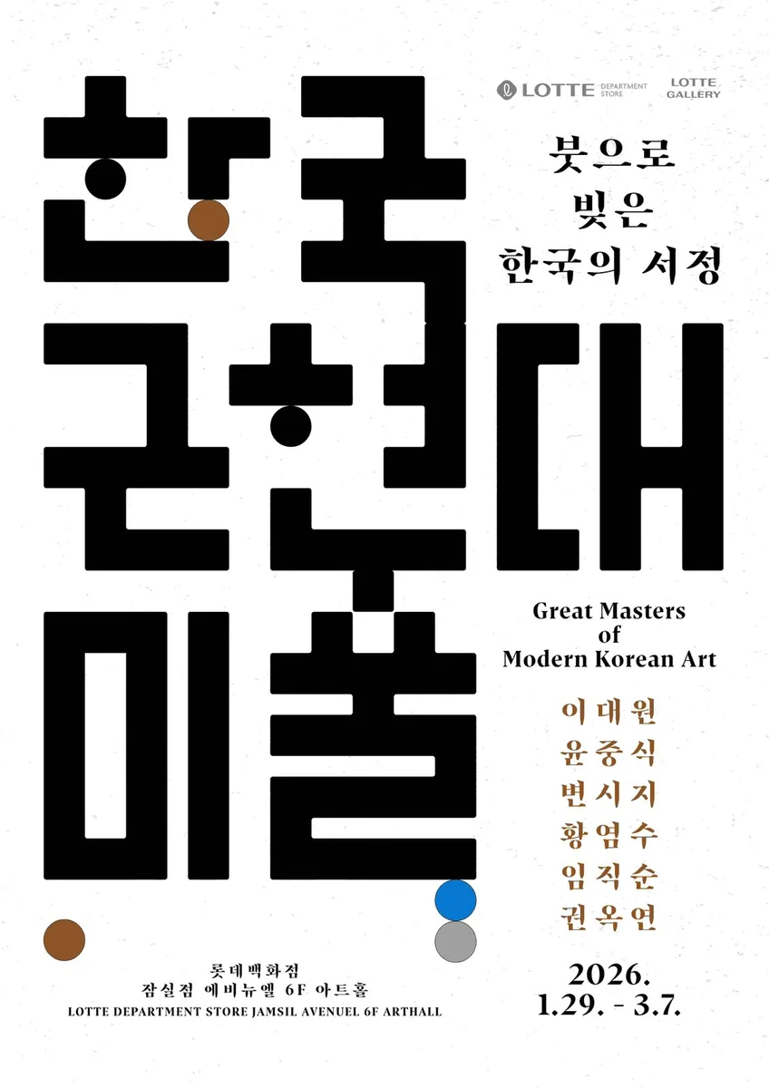 롯데갤러리는 2026년 새해를 여는 첫 전시로 <한국 근현대미술 : 붓으로 빚은 한국의 서정>展을 개최합니다. 한국 미술의 고유한 색을 만들어가던 1970년대와 그 이후, 한국 화단의 형성과 성장에 중요한 토대를 마련한 작가들이 있었습니다. 이번 전시는 이대원을 중심으로 윤중식, 변시지, 권옥연, 임직순, 황염수 등 한국 근현대기 주요 작가 6인의 구상회화를 재조명합니다. 이들 작가는 일제강점기와 한국전쟁이라는 격동의 시대를 통과하며, 일본을 통해 유입된 서구 미술을 어떻게 한국 고유의 조형언어로 전환할 것인가라는 질문과 마주했습니다. 1950년대 후반 본격화된 모더니즘 회화의 흐름 속에서도 이들은 추상 일변도의 경향을 따르기 보다, 우리 땅의 풍토와 정서, 삶의 체험에서 출발한 구상회화를 통해 자신만의 회화적 언어를 구축해 나갔습니다. 이대원의 작품은 강렬하면서도 절제된 색채와 짧고 리듬감 있는 붓질을 통해 자연의 생동과 조형적 질서를 동시에 담아냅니다. 그의 화면은 삶과 자연에 대한 찬미와 회화적 실험이 교차하며, 감각적이고 활기 넘치는 시각적 경험을 제공합니다. 특히 ‘농원’ 연작에서 펼쳐지는 생동감 있는 화면과 풍부한 색채의 향연은 그의 예술 세계의 정수를 보여줍니다. 윤중식의 작업은 실향민으로서의 기억과 상실의 정서를 바탕으로 개인적 체험을 넘어선 시대의 기록으로 읽힙니다. 대동강, 석양, 비둘기, 농촌 풍경 등 반복적으로 등장하는 소재는 갈 수 없는 고향에 대한 애틋한 그리움을 담고 있으며 보는 이로 하여금 깊은 향수를 불러일으킵니다. 한편 '폭풍의 화가'로 불리는 변시지는 제주를 배경으로 인간 존재의 고독과 내면적 사유를 탐구했으며 임직순과 황염수, 권옥연은 화면 안의 조형적 가능성을 확장하며 회화의 서정성과 깊이를 더합니다. 이들의 작업은 구상회화가 단순한 현실 재현에 머무르지 않고, 시대 인식과 미적 태도를 담아내는 의미 있는 표현 방식임을 보여줍니다. 본 전시는 한국 근현대기의 주옥 같은 작품들을 통해 당시의 구상회화가 지닌 미학적 깊이와 시대적 의미를 다시금 되짚고자 합니다. 이번 전시를 통해 한 시대를 살아낸 화가들의 붓끝을 따라가며, 오늘의 시점에서도 여전히 유효한 회화의 감동과 서정을 마주하는 시간이 되기를 바랍니다. *출처:롯데갤러리 잠실점 에비뉴엘아트