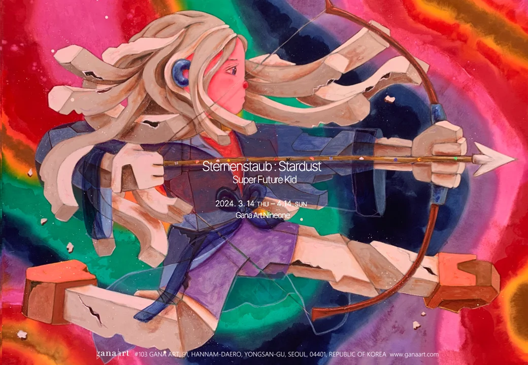 전시 개요 OVERVIEW 가나아트는 뉴욕 브루클린을 기반으로 활동하는 슈퍼 퓨처 키드(Super Future Kid, b. 1981-)의 개인전 《Sternenstaub : Stardust》를 개최한다. 베를린 장벽 붕괴 이전의 동독에서 태어난 슈퍼 퓨처 키드는 통일 이후 서독에서 유입된 비디오 게임, 음악, 초기 인터넷, 장난감과 같은 대중문화에서 영감을 받은 작업을 선보여 왔으며, 탕 컨템포러리 갤러리(Tang Contemporary Gallery, 홍콩, 베이징, 서울, 방콕), 오버 더 인플루언스(Over the Influence, 홍콩, 로스앤젤레스, 방콕, 파리), 쾨닉 갤러리(Koenig Galerie, 베를린, 멕시코 시티, 서울)와 같은 전 세계 유수 갤러리의 전시를 통해 소개된 바 있다. 본 전시는 한국에서 열리는 그녀의 첫 번째 개인전으로, 금이 가고 부서진 콘크리트의 몸을 가진 인간의 형상을 그려낸 7점의 신작을 조명하는 자리가 될 것이다. ‘슈테른슈타우브(Sternenstaub),’ 독일어로 ‘별먼지(stardust)’를 뜻하는 본 개인전의 제목처럼, 슈퍼 퓨처 키드의 신작은 필연적으로 죽음을 마주하는 모든 개체가 결국 우주를 구성하는 ‘별먼지’의 일부가 된다는 개념에서 시작되었다. 그의 신작에서 가장 눈에 띄는 것은 단연 부서져가는 콘크리트의 몸을 가진 인간의 형상인데, 이를 통해 작가는 육신이 지닌 취약함과 유한함을 상기시킨다. 이런 불완전한 육체를 가졌음에도, 그림 속 인물은 침착하고 강인한 모습으로 활을 쏘고, 산책을 하는 등 삶에 대한 의지를 보여준다. 또한 작가는 사랑, 자연, 행운 등을 상징하는 아이콘을 그림 속에 배치해 삶의 여러 요소를 암시하기도 한다. 이러한 요소들은 인간에 대한 작가의 따뜻한 시선과 애정이 반영된 것이다. 슈퍼 퓨처 키드는 작업을 통해 필멸의 존재로서의 인간을 냉소적으로 바라보는 것이 아닌, 보이지 않는 삶의 가치, 인간이 인간일 수 있는 이유에 대해 질문함으로써 되려 삶의 소중함을 역설한다.