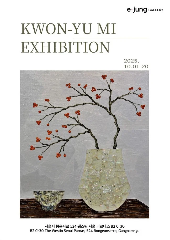 전시 개요 OVERVIEW 2025.10.01~10.20 권유미 개인전 자개와 금박을 활용해 조선 백자 달항아리를 현대적으로 재해석하는 권유미 작가의 개인전이 열립니다. 작가는 반복과 몰입의 행위를 통해 달항아리에 자신의 기(氣)와 도(道)를 담아내며, 작업 과정 속에서 마음의 정화와 에너지를 교류합니다. 화려한 꽃이 사라지고 가지와 항아리만 남은 화면은 단순하지만 깊은 울림을 전하며, 보는 이로 하여금 명상적인 사유의 공간으로 초대합니다. 📍 전시기간: 2025.10.01 – 10.20 📍 장소: 이정갤러리 (서울 강남구 봉은사로 524 웨스틴 서울 파르나스 B2 C-30) Artist Kwon-Yu Mi reinterprets the Joseon white porcelain “Moon Jar” with mother-of-pearl and gold leaf, infusing it with modern sensibilities. Through repetitive and meditative processes, her works embody both Qi (energy) and Dao (the way), creating a harmonious cycle of giving and receiving energy. What remains on her canvas is no longer abundant flowers, but simple branches and a moon jar — offering a quiet yet profound resonance, inviting viewers into a space of contemplation. 📍 Exhibition Dates: Oct 1 – 20, 2025 📍 Venue: E·jung Gallery (B2 C-30, The Westin Seoul Parnas, Bongeunsa-ro, Gangnam-gu, Seoul)