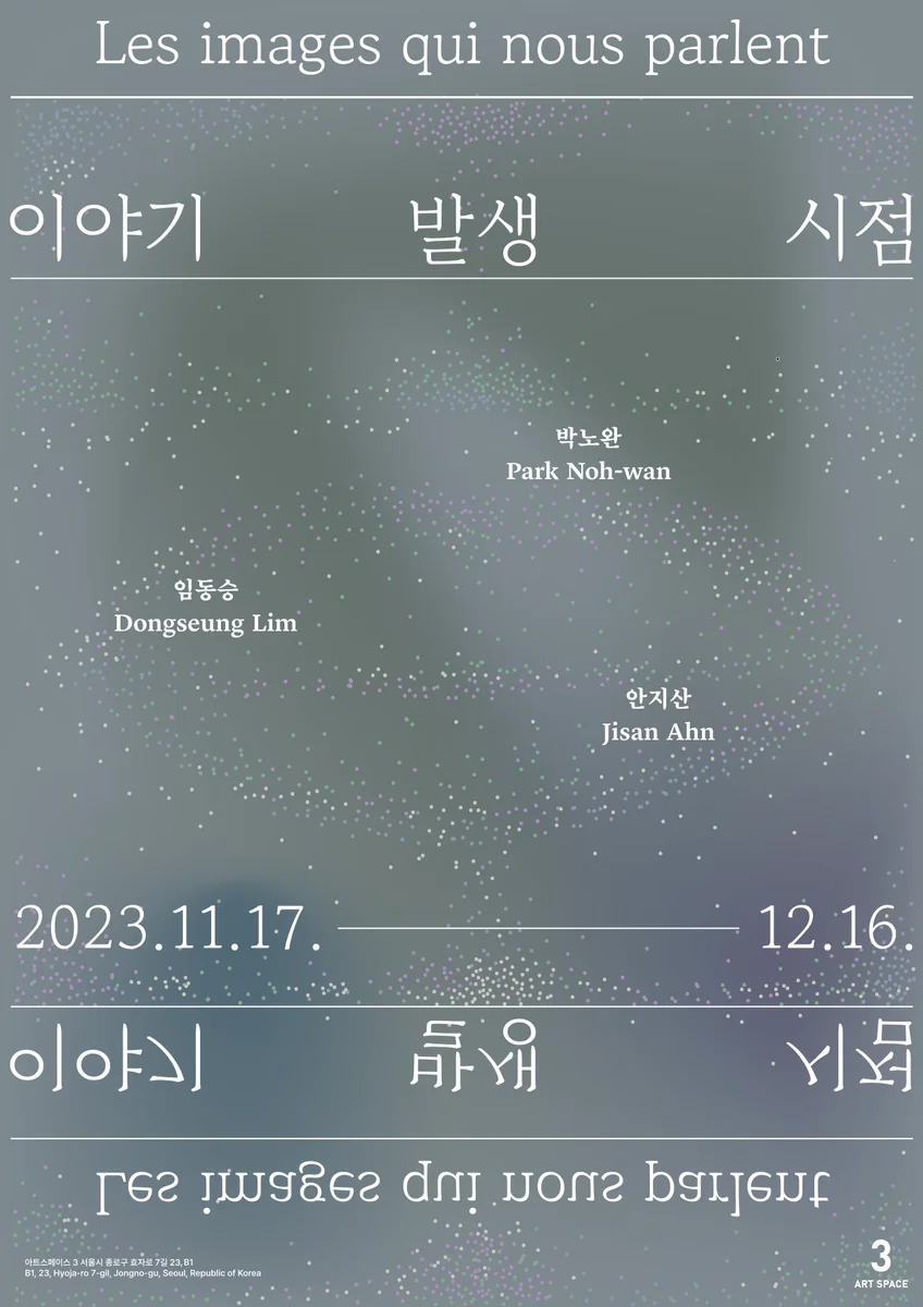 전시 개요 OVERVIEW 《이야기 발생 시점 Les images qui nous parlent》은 서로 다른 지점에서 이미지를 발생시키는 회화 작가 박노완, 안지산, 임동승이 참여하는 3인전으로, 이미지 시작 지점의 차이가 만들어 내는 서로 다른 표현과 우리가 이들의 이미지를 만날 때, 이들의 이미지가 서로를 만날 때, 촉발되는 새로운 사유를 쫓고자 한다. 이 전시 제목에서 사용된 ‘이야기’는 서사(narrative)로써의 이야기이기보다는 ‘대상과 나’ 사이의 이야기(dialogue)를 뜻한다. 작가에 의해 제시, 변주되는 조형적 요소들을 마주할 때, 우리의 사고는 자동발생적으로 여러 정보를 조합하여 이해를 시도하는데, 이 순간이 작품과의 내밀한 대화가 시작되는 지점이다. 우리에게 말을 건네는 이미지들(Les images qui nous parlent)과의 마주함을 통해 이야기가 발생한다. 이때 이야기의 확장과 소멸은 작품을 바라보는 관객에게 달려있다. 이 전시에서 선보이는 밀도 높고 너른 상상을 자극하는 작품들을 통해 다양하고 개별적인 이야기가 펼쳐지기를 기대한다. [Credit] 주최: 아트스페이스3 / 기획: 김지혜 / 디자인: 장윤아 / 사진: 전병철