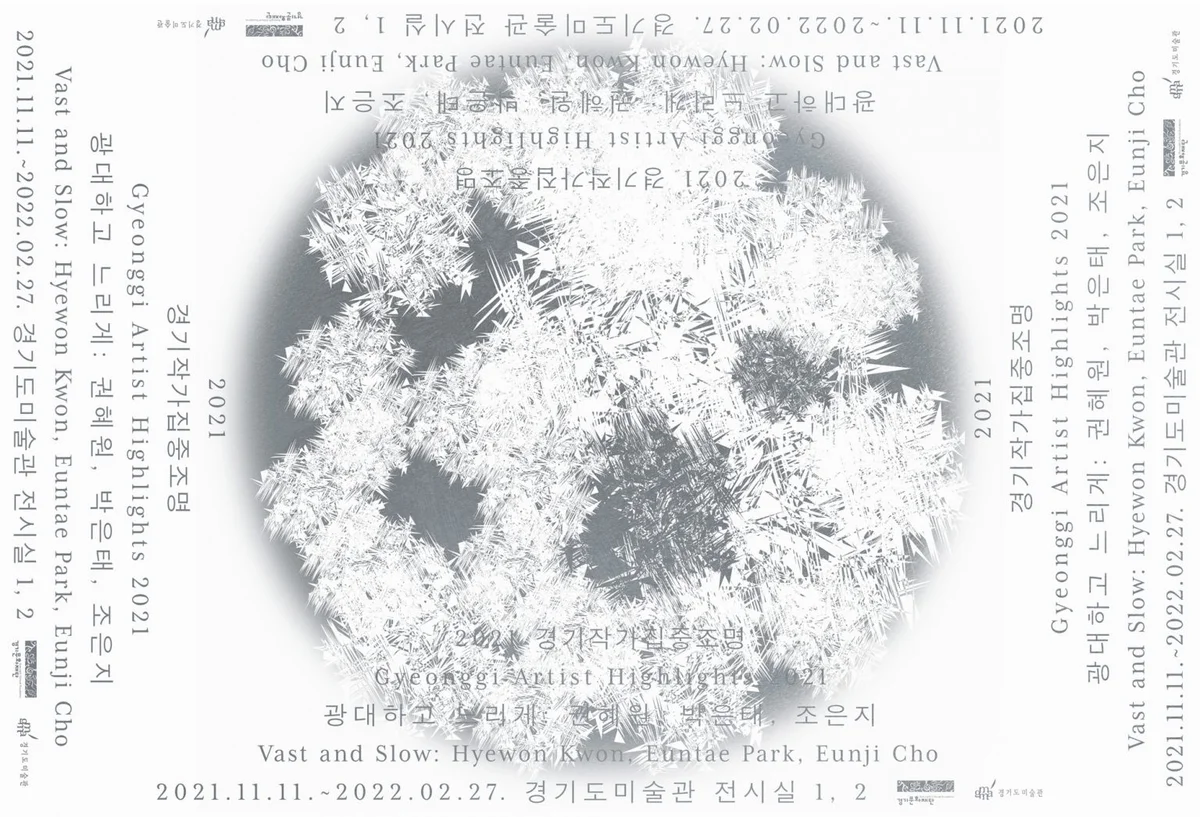 2021 경기작가집중조명 《광대하고 느리게: 권혜원, 박은태, 조은지》 2021. 11. 11. ~ 2022. 02. 27. 경기도미술관 전시실 1, 2 경기도미술관은 2021년 마지막 전시로 《광대하고 느리게: 권혜원, 박은태, 조은지》를 개최한다. 이번 전시는 경기도를 기반으로 활동하는 중진작가의 작품세계를 집중 조명하고자 마련되었다. 경기도미술관의 중진작가 지원에 대한 애정과 방향성이 경기문화재단 작가집중조명 초청공모와 결합하여 더욱 의미있는 첫 발걸음을 내디딘 이번 전시는 권혜원, 박은태, 조은지 3인 작가의 신작 발표 무대이기도 하다. 전시제목 《광대하고 느리게》는 SF 소설가 어슐러 K. 르 귄의 단편집 <바람의 열 두 방향> 중 ‘제국보다 더욱 광대하고 느리게’에서 영감을 얻었다. 전시에 참여하는 3인 작가가 긴 시간 동안 지속적으로 보여준 예술적 성취와 작업의 여정에 경의를 표하는 의미를 담았다. 그녀의 소설이 액션이나 모험을 다루는 대신 인간의 내면에서 어떤 일이 벌어지는지와 같은 정신세계에 관하여 이야기했듯이, 이 전시에서는 아무도 탐험하지 않은 숲을 탐험하는 3인 작가의 작업세계를 소개하고자 한다. 또한 그들의 신작을 통해 관람객이 자신만의 경험과 상상을 찾아가는 시간을 제공하고자 한다. 참여 작가 3인 – 권혜원, 박은태, 조은지 – 은 ‘인간과 비인간’, ‘물질과 비물질’, ‘인간과 노동’, 그 관계의 ‘사이’를 이해하는 방식을 탐구하고 고민하며 신작을 제작하였다. 《광대하고 느리게》는 인간과 노동, 인간과 동물, 언어와 비언어, 인간과 식물 사이의 대화를 인간 중심의 사유가 아닌, 대안적이고 급진적인 관점을 통해 경험하고 공유하는 전시플랫폼이 되기를 희망한다. 특히, 인류학의 관점에서 ‘타자를 바라볼 때 상대의 내면으로 깊숙이 녹아 들어가 관찰하는 방법론’을 차용하여 현재 우리 눈에 보이지 않는 세계를 상상하고, 그 속에 내재할 수밖에 없는 편견과 한계에 대해 함께 생각해보고자 한다. 그리하여 우리와 완전히 다른 문화의 요소 – 장소, 시간, 물질 – 가 처음 만났을 때 일어나는 충격과 갈등을 통해, ‘우리가 문제와 함께 살아간다는 것은 진실로 현재에 존재하기를 배우는 것‘임을 생각해보는 전시가 되기를 기대한다. ※ 이 전시는 경기문화재단의 지원사업 「2021 경기 시각예술 집중조명 프로젝트」 선정 작가의 신작발표전입니다. 장소 경기도미술관 전시실 1, 2 참여작가 권혜원, 박은태, 조은지 기획 김현정, 조은솔(협력) 주최·주관 경기문화재단, 경기도미술관 창작지원 경기문화재단 문화예술본부 예술진흥실