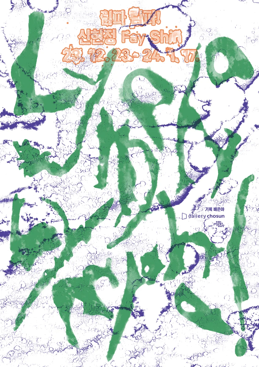 전시 개요 OVERVIEW 2023년 12월 23일부터 2024년 1월 17일까지 신현정 작가의 개인전 《림파 림파!》가 갤러리 조선 (서울시 종로구 소격동 125)에서 열린다. 《림파 림파!》는 가늘고 미미하지만 힘차게 생명을 이어가는 투명한 림프처럼, 물질과 신체 사이를 유연하게 헤엄쳐 나가는 신현정의 회화 표피들이 연주하는 색의 향연이다. 신현정은 회화의 구성요소로서 표면과 지지대를 해체하고 확장하는 독자적인 회화 언어를 구축해왔다. 특히 명상과 요가 수행을 통해 얻은 경험을 바탕으로 몸과 마음, 자연과 인공, 대상과 주체와 같은 이원론적 세계를 통합하는 내면의 집중에 몰입해왔다. 그러나 여전히 예측 불가능한 외부 환경에 노출되어 있는 인간의 한계 앞에서, 작가는 자신을 내려놓고 변화를 허용하는 확장된 주체로서 회화를 모색하기에 이른다. 이러한 연장선에서 본 전시는 ‘고정됨’없이 끊임없이 흐르고 변화하는 물의 생명력을 매개로 상호작용하는 물질의 결합과 충돌을 《림파 림파!》라는 리드미컬한 구호에 담아본다. 림파(Lympha)는 물을 의미하는 라틴어로 우리 몸의 길을 촘촘하게 연결하는 림프(Lymph)의 어원이다. 어느 누구도 모든 곳에 살지는 못한다. 누구나 어딘가에 산다. 어떤 것도 모든 것에 연결되지 않는다. 모든 것은 무언가와 연결된다. 도나 해러웨이, 『트러블과 함께 하기』 우리는 세상으로부터 주어진 조건 속에 살아간다. 너무나도 당연하게 느껴지는 명제 같지만, 나에게 주어진 조건이 만들어내는 세상과 당신에게 주어진 조건이 만들어내는 세상의 ‘다름’ 앞에서 우리는 어떻게 감히 ‘우리’ 라고 말 할 수 있을까. 되짚어 볼 수밖에 없다. 물질과 비물질, 인간과 비인간, 생명체와 비생명체, 자연과 비자연을 구분 짓는 이분법적 경계들은 사실 그들 각자가 처한 조건의 ‘취약함’ 앞에 비로소 평등하다. 신현정은 이러한 ‘우리’에게 주어진 삶의 트러블(trouble)을 마주하고 포용하는 서로 다른 객체로서 회화의 표면을 제안한다. 이는 예술의 견고함에 종속되어 있는 회화의 권위를 내려놓고 세상과 소통하고 상호 관계 속에 호흡하는 회화로서 그 자체의 전율을 위한 스코어(score)이다. 그렇다면 신현정이 추구하는 끊임없이 환경에 의해 변형되어 새롭게 접속하는 잠재체로서 회화, 쉼 없이 새로운 개체로 전이될 뿐 지금 여기 한 순간의 접촉으로서 회화란 무엇이며 어떻게 가능할까? 환경이 실제로 인간의 신체와 마음 내부에 있다는 것을, 그렇기에 세심한 관용을 베풀며 일상 생활 속에서 정치적으로, 기술적으로, 과학적으로 당신 안에서 전진하고 있음을 인정하라. 제인 베넷 , 『생동하는 물질』 《림파 림파!》에서 신현정은 자신의 몸과 물의 콜라보레이션으로 물감을 실어 나르고 천과 함께 춤추며 그 정동에 몸을 맡기는 사이–존재(In–between)로서 회화 공간을 선보인다. 작업 과정 속에 관습적으로 사용하는 물질과 맺는 사용자/피사용자의 관계를 전복하여, 작가는 물질이 자신의 삶과 어떤 관계를 맺고 있는지 그리고 어떤 영향을 끼칠 수 있는지에 대한 ‘관계적’ 전환을 시도한다. 작가는 생활 속에 쉽게 접할 수 있는 멀베리(뽕나무잎), 아크릴, 락스(탈색 작용)와 같은 염료가 물과 ‘만나며’ 생성되는 무늬와 흔적들을 세심하게 관찰하여 표면으로 옮겨온다. 멀베리, 아크릴, 락스는 각각 천연, 인공, 독성 성분을 내포하는 염료로서 삶의 환경을 통해 피부로, 호흡기로, 소화기에 영향을 주는 물질이다. 작가는 이들이 몸에 침투하여 세포와 반응하고 변형되어 다시 배출되는 현상에서 착안하여, 염료들이 물을 만나 자기의 습성대로 천 위에 창발할 수 있도록 사용자로서 손을 내려놓는다. 작가는 이를 ‘내맡김의 시간’ 이라고 하는데, 주체를 내려 놓고 물질들이 스스로 작동하고 상호 관계하며 조직화하도록 기다리는 객체 지향적 태도이다. 작가는 또한 우리가 입고 벗는 린넨, 실크, 텐실과 같은 다양한 천을 염색하고 스테인리스 스틸 지지대에 걸쳐 놓으면서, 회화를 일상의 공간 안으로 연결시킨다. 이와 같이 창작 활동의 주체