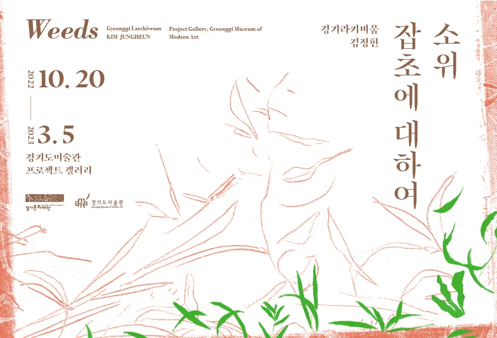 경기라키비움 김정헌 《소위 잡초에 대하여》 2022. 10. 20. ~ 2023. 03. 05. 경기도미술관 프로젝트 갤러리 경기도미술관은 올해부터 연구를 기반으로 한 전시 ‘경기라키비움’을 시작한다. 라키비움(Larchiveum)이란 도서관[Library], 기록보존소[Archives], 미술관[Museum]의 합성어로 이 기능들을 모두 제공하는 공간을 지칭한다. 경기라키비움은 미술관의 수집과 연구 기능을 심화하고 확장하는 과정에서 탄생한 신규프로젝트로, 작품을 하나의 완결된 절대적 가치로 보던 해석 방식에서 벗어나 작가의 전 생애를 구성하는 활동의 결과로서 바라볼 것을 제안한다. 경기라키비움의 첫 번째 초청작가 김정헌(金正憲, 1946~)은 우리나라 민중미술의 기수(旗手)로 꼽힌다. 그가 사회․문화적 격변의 한가운데에서 독창적인 작품세계를 완성하였을 뿐만 아니라, 교육자이자 행정가로서도 커다란 발자취를 남겼다는 데 이견이 없다. 그러나 작가로서의 반백 년 화업(畫業)을 총체적으로 살펴보기에는 이에 관한 연구가 충분하다 할 수 없다. 연구 대부분이 1979년 ‘현실과 발언’ 결성 이후에 집중되어 있고, 그전의 활동은 제대로 의미를 조명받지 못하였기 때문이다. 더욱이 김정헌이 작가로서 삶을 모색하며 교육자의 길을 걷기 시작한 1970년대에는 부족한 자료 탓에 그 면모를 파악하기 어려운 실정이다. 《소위 잡초에 대하여》는 그간 공백에 가까웠던 김정헌의 1970년대 활동에 주목하여 그의 초기 작업과 자료를 새로 발굴하고 한데 모았다. 출발점은 작가가 2021년 경기도미술관에 기증한 ‘잡초’ 연작 다섯 점이었다. ‘잡초’ 연작은 당대 한줄기 흐름을 형성했던 모더니즘 경향의 기하학적 추상화로, 기존에 알려진 김정헌의 작업과 유사성을 찾기란 쉽지 않다. 하지만 흩어진 기록을 모으고 추적하는 과정에서 1970년대 격동의 사회에 갓 발을 내디딘 신진작가의 고뇌와 독자적 조형 언어를 만들기 위한 부단한 노력의 결과를 찾을 수 있었다. 당시 1970년대에는 전통문화와 ‘한국성’에 관한 관심이 고조되었고, 미술계에서는 한국미술의 국제화를 꾀하고 있었다. 이 시기 김정헌은 동시대 조류의 수용을 두려워하지 않으면서도 본인의 작품세계를 구축하기 위한 실험을 거듭하였다. 그는 캔버스, 천, 비닐, 종이, 나무와 같이 여러 매체를 다루면서, 고구려 벽화와 백제의 산수문전, 신라의 곡옥과 같은 전통 요소의 조형미를 탐구하였다. 작가의 1970년대 작품들은 형식 면에서 매우 다양하지만, 주제는 일관되었다. 바로 현실의 삶이다. 김정헌은 1966년 창간한 계간 『창작과비평』에 연재된 아르놀트 하우저(Arnold Hauser, 1892~1987)의 『문학과 예술의 사회사』, 방영웅(方榮雄, 1942~2022)의 『분례기』 등을 읽으며 예술과 삶의 밀접한 관계를 자각하고, ‘리얼리즘’에 대해 고민하며 청년사(靑年社)의 책들을 탐독하였다. 1973년에는 ‘잡초’가 처음으로 작품에 등장한다. 그는 잡초가 가지는 군중성(群衆性), 무명성(無名性) 그리고 “밟힐수록 일어나 꽃을 피우는” 강한 생명력에 주목하였다. 이처럼 작가에게 잡초는 민중의 삶을 대변하는 모티프였다. 잡초를 그리던 때 김정헌은 오수환(吳受煥, 1946~), 원승덕(元承德, 1941~) 작가와 이른바 《잡초전[三人展]》(1975, 1977)을 꾸리기도 하였다. 변두리에서도 허세 없이 뿌리를 내리는 잡초는 국전[大韓民國美術展覽會]과 단색조 회화로 양분화된 미술계에서 막 활동을 시작한 신진작가들에게 필시 정서적 공감대로 작용하였을 것이다. 더불어 작가는 서울대학교 미술대학 졸업생이 주축이었던 ‘신체제(新體制)’, 《6인전(六人展)》(1978~1979)을 비롯하여 《한국실험작가전》(1974), 《대구현대미술제》(1974~1975) 등에 참여하며 새로운 시대에 걸맞은 미술의 활로를 모색하였다. 이번 전시를 준비하면서 이 시기 작가의 삶과 작업에 내밀히 다가가기 위하여 아카이브와 기록을 찾는 데 노력을 기울였다. 아카이브를 통해 비로소 그 의미가 드러나는 작업도 있었다. 산발적인 자료를 모으고 사실