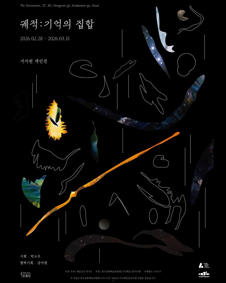 1. 포털(Portal) 건축학의 관점에서 ‘문’은 단순히 공간을 나누는 물리적인 벽의 일부가 아니다. 분할된 공간 속에 사용자의 동선과 선택적 의지를 투영하여 안과 밖의 출입을 유도하는 매개체다. 문을 통과한다는 것은 하나의 세계를 등지고 전혀 다른 맥락의 세계로 편입됨을 의미한다. 이러한 공간의 전이는 상상력 속에서 ‘포털(Portal)’이라는 개념과 연결되기도 한다. 게임 속의 포털, 우주의 블랙홀과 웜홀은 물리적 한계를 뛰어넘어 전혀 다른 시공간을 현재의 좌표로 소환한다. 이 지점에서 문은 단순한 통로를 넘어 일종의 ‘변곡점’이자, 존재의 상태를 전환하는 순환의 고리로 기능한다. 작가 서지원은 자신의 신체적 체험을 통해 수집한 잔상들로 화면을 채운다. 그는 캔버스라는 평면 공간에서 일종의 변주하는 포털처럼, 정체를 알 수 없는 조형적 파편들을 쏟아낸다. 이번 전시에서 관객은 화면 전체를 파악하기 위한 논리적 단서를 찾으려 애쓰게 되지만, 서지원의 세계에서는 작은 모듈이나 질서 정연한 구조보다 ‘잔상과 환영’이라는 개별적 경험의 충돌이 우선시된다. 그의 작업은 해석과 이해라는 이성적 접근을 거부한다. 대신, 가늠할 수 없이 먼 거리를 달려와 우리 눈에 닿은 밤하늘의 별빛처럼, 혹은 낮과 밤이 교차하는 그 짧은 찰나의 순간처럼, 가장 오래된 기억의 어휘들을 불쑥 내민다. 일인칭의 수행자 시점으로 변화하며 머릿속의 기억을 붙잡으려는 그의 시도는, 캔버스라는 문을 통해 새로운 세계로 진입할 수 있는 포문을 열어내고 있다. 2. 표류의 면적 서지원은 이번 전시 《궤적:기억의 집합》에 이르기까지 끊임없이 ‘표류’하는 자신의 상태를 응시했다. 그가 발을 딛고 있는 세계 속에서 기억은 외부의 관계항들과 부딪히며 부유했고, 작가는 그 안에서 들려오는 목소리에 집중해 왔다. 망망대해에 떠 있는 부표, 그 위를 흩날리는 색과 면의 격렬한 운동, 그리고 혼란스러운 이미지들은 그간 그가 겪어온 심리적 표류를 시각화한 것이었다. 구상과 추상의 경계, 혹은 그 둘의 교집합 안에서 물리적 공간에는 존재하지 않는 자신만의 영토를 찾아 나서는 이인칭 탐험가의 시선이 그간의 주된 시점이었다. 그러나 ‘예술공간 의식주’에서 열리는 이번 전시는 이전의 여정과는 조금은 다른 방향으로 전개된다. 작가는 더 이상 넓고 막막한 외부의 바다를 응시하지 않는다. 대신, 전시장이라는 ‘소박한 입방체’와 그 안의 ‘작은 공간’으로 시선을 돌린다. ‘알 수 없는 내일’에 대한 막연한 불안은 이제 좁고 내밀한 공간 안에서 응축된다. 주목할 점은 이 고립된 작은 공간이 결코 폐쇄적이지 않다는 사실이다. 서지원은 ‘1제곱미터’ 남짓한 아주 작은 표류 지점에서도 빅뱅과 같은 거대한 사건의 시작이 열릴 수 있음을 시사한다. 이는 물리적 크기의 문제가 아니라, 밀도의 문제다. 내일의 일렁이는 파도를 맞이하기 위해 아주 작은 것들로부터 세계를 다시 구축하려는 작가의 태도는, 표류하는 부표를 하나의 단단한 섬으로 치환하고 있다. 3. 섬광: 감정의 궤적 이번 전시의 키워드인 ‘섬광’은 감정을 대변하는 빛으로 은유 된다. 전시장 내부에 설치된 작업들은 풍경이나 오브제의 재현을 넘어서서, 특정한 기호적 형태가 삭제된 추상의 형태와 가깝다. 몇 해 전부터 그가 활용해 온 ‘스퀴즈(Squeeze)’ 기법의 면적이 확대된 것도 같은 맥락이다. 물감을 밀어내고 압착하여 캔버스 위에 흔적을 남기는 이 기법은, 행위의 결말을 미리 상정하지 않고 있다. 덕분에 어제에서 내일로 흐르는 선형적 시간은 서지원의 화면 안에서 부유한다. 그러나 여러 좌표에 파편화되어 흩어져 있던 기억, 신체의 흔적, 그리고 사건의 단서가 ‘우연’이라는 가능성의 축을 중심으로 재배치된다. 작가는 인위적인 시스템이나 보편적 카테고리에 포함되지 않는 ‘잉여의 이미지’가 탄생하기를 고대하며 항해를 멈추지 않는다. 그의 화면 속에서 솟구치는 ‘푸른 섬광’과 별의 무리는 창백하면서도 눈부시게 찬란하다. 이는 언젠가 도래할지 모르는 거대한 이야기를 위해 작가가 준비한 파편들의 향연이다. 그는 오늘도 자신의 영토 위에서 미완의 움직임을 관측하며, 가장 작은 것들로부터 가장 거대한 빛의 궤적을 그려내고 있다. 《궤적:기억의 집합》은 작가 서지원이 기억의 심해에서 건져 올린 잔상들을 어떻게 자신만의 영토로 편입시키는지를 보여주는 전시다. 작가는 단순히 이미지를 그리는 것이 아니라, 기억의 질량을 캔버스 위에 압착하여 새로운 시공간의 문을 만든다. 우리는 그가 만든 포털 앞에서 무수한 파편들을 마주하게 될 것이다. 이 문 뒤에서는 때로는 날카로운 비명이, 때로는 부드러운 별빛이 도래하지 않은 곳을 향해 궤적을 그려낼 것이다. 비록 삶이 여전히 표류 중일지라도, 아주 작은 것들로부터 시작되는 이 항해는 각자의 잠 속에 깃든 섬광을 깨우게 될 것이다.