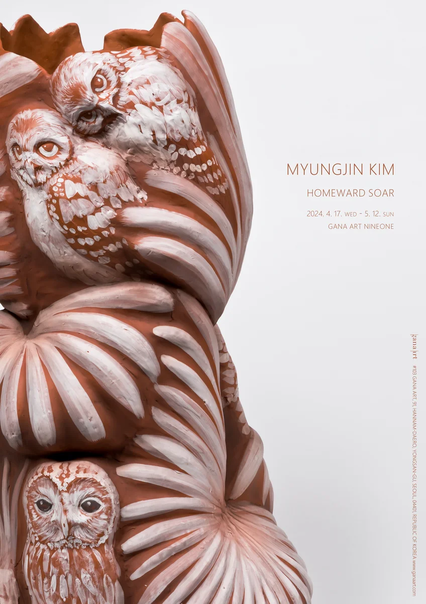 전시 개요 OVERVIEW 가나아트는 미국 로스앤젤레스를 기반으로 활동하며 흙을 재료로 하는 조각 작품을 선보이는 작가 김명진(Myungjin Kim, b. 1975-)의 개인전을 개최한다. 2002년 서울대학교 도자공예과 석사학위를 취득한 후 로스앤젤레스로 이주한 그는 한국, 미국, 멕시코 등 다양한 문화권에서 차용한 요소들을 하나의 작품 안에 접목하는 독자적인 예술 세계를 구축해왔다. 또한 레스닉 컬렉션(Resnick Collection, 캘리포니아), 콜럼버스 미술관의 피주티 컬렉션(Pizzuti Collection, Columbus Museum of Art, 오하이오), 조던 슈니처 미술관(Jordan Schnitzer Museum of Art, 오레곤), 미국 도예 박물관(American Museum of Ceramic Art, 캘리포니아) 등 유수한 기관에서 그의 작품을 소장하고 있다. “Homeward Soar”, 고향으로 향하는 날갯짓이라 명명한 본 전시명처럼, 20여 년 만에 고국에서 작품을 선보이는 이번 개인전이 다채로운 재료와 영감을 작품으로 승화한 그의 예술적 여정을 함께할 수 있는 자리가 될 것으로 기대한다. 김명진의 작품은 미국의 웅장한 자연환경에서 영감을 받은 역동적 형상과 흙 본연의 색이 자연스럽게 노출되는 멕시코 도자의 테라코타 기법의 사용이 특징적인데, 실상 작업의 개념적 뿌리는 한국의 전통 문화에 있다. 그는 부와 행운, 지혜의 상징인 부엉이와 생명력의 상징인 소철을 작품 속에 등장시켜 번영과 장수, 행복한 삶을 기원하는 주술적 개념을 담아낸다. 김명진은 이러한 상징적인 소재들을 통해 19세기 한국 민화의 한 종류인 화조도(花鳥圖)의 개념적 부분을 현대적으로 변용하여 그만의 ‘현대판 부적(Talisman)’을 탄생시켰다. 이처럼 동서양의 유구한 역사 안에서 발명된 여러 기법 및 다문화적 환경에서 얻은 영감을 가시화한 김명진의 작품에는 동서의 조화와 만인의 안녕을 기원하는 따스한 염원이 담겨 있다. 강인하고 생명력 넘치는 김명진의 작품을 소개하는 이번 전시가 현재를 살아가는 자들의 영혼을 위로하고 보호하는 휴식처가 되기를 바란다.