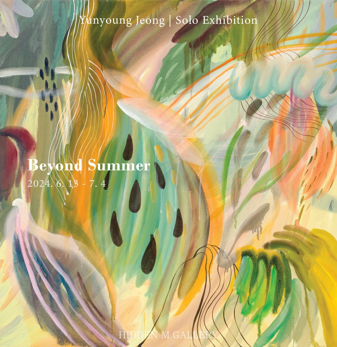 전시 개요 OVERVIEW Beyond Summer | 정윤영 개인전 히든엠갤러리는 6월 13일부터 7월 4일까지 정윤영작가의 개인전 《Beyond Summer》展을 개최한다. 정윤영(b.1987)은 동·서양의 회화적 특성을 넘나들며 밝은 색채와 섬세한 선묘가 돋보이는 추상 작품을 선보여 왔다. 정윤영작가의 주요 개인전으로는 《Layered Colors》(갤러리 채율, 서울, 2023), 《미완의 단면들》(영은미술관, 경기도 광주, 2021), 《어떤 그늘》(박수근미술관, 양구, 2021)이 있으며 주요 단체전으로는 《기부로 빛나는 예술》(사비나미술관, 2023), 《SUN ROOM》(Gallery BB&M, 2023), 《낯선 이웃들》(서울시립 북서울미술관, 2016), 《BUDDHAS》(불일미술관, 서울, 2016) 등이 있다. 여름의 시작을 알리는 6월, 히든엠갤러리에서 선보이는 이번 전시에서 작가는 화면 안에 부드럽게 스며든 색과 유기적인 형태, 식물의 줄기나 꽃의 단면을 연상시키는 관능적인 이미지를 통해 소멸과 회복을 반복하는 생명성에 대한 작가의 사유를 시각화하는 신작 회화를 소개한다. “나는 삶, 사는 것, 살게 하는 것 전부를 그린다. 이는 기본적으로 삶을 돌보는 태도에 대한 관심에서 출발한다.” -작업 노트 작가는 삶의 질곡(桎梏)속에서도 삶 자체에 감사하고 그 기쁨을 진실되게 추구하는 것을 매우 중요히 여긴다. 형체도 없고 빛깔도 뭉개진 작품들은 작가의 개인적 경험에서 이어진 불완전한 생의 단면, 그 상실과 결여로 얼룩진 미완의 상태를 이야기하고 있다. 작가의 작업은 궁극적으로 삶에 대한 새로운 태도를 갖추어 가는 과정이다. 예정된 의도 안에서 움직이며 완성을 향해 다가서는 대신, 화면 위의 만남과 어울림을 수렴하고 의미를 비껴가며 미지의 차원을 다시 열고 덧입힌다. 그의 화면은 아직 정돈되지 않은 모호한 대상들과 순응과 저항 사이의 미묘한 상태를 담아내고, 그리다 만 것 같은 미숙한 표현이지만 있는 그대로의 생명의 흔적을 형상화한 것이다. 오랜 기간 전통 배채기법(背彩技法)과 현대적 서양 회화 기법을 동시에 유지하면서 전통이 가진 시대성을 현대적인 색감의 추상 회화로 표현해 온 작가의 작품들은 물리적, 시간적 차이를 상정하면서 여러 겹의 회화적 이미지들이 발생시키는 모순적 감각을 통해 생명의 지속성을 시사한다. 이번 전시에서 선보이는 회화, 드로잉 등을 통해 그의 회화가 담고 있는 전통 회화 기법의 유려함과 회화의 층 사이에서 발생하는 부딪침으로 약동하는 역설적 생동감에 관해 이야기하고자 한다.