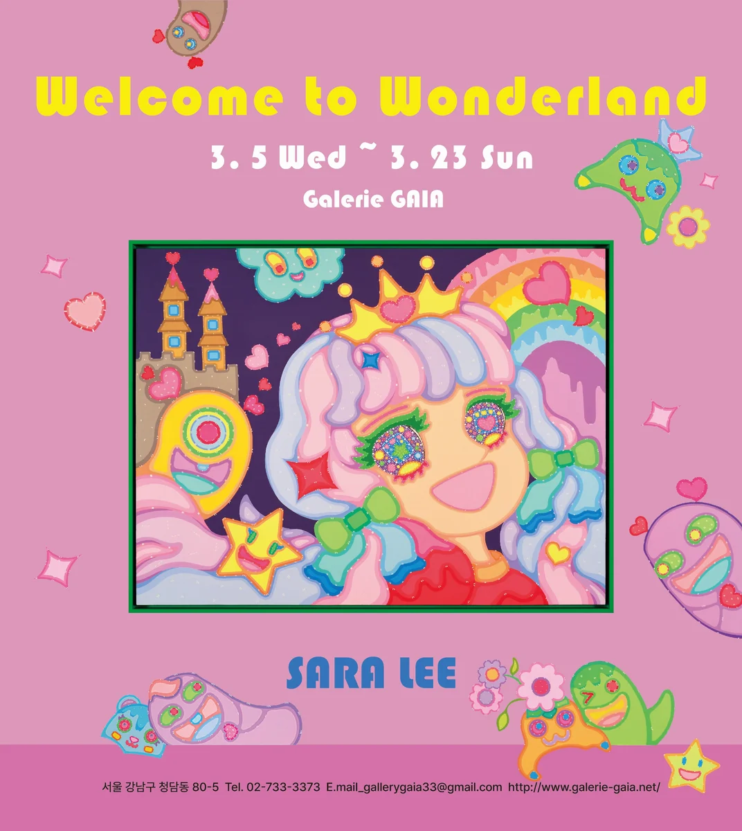 전시 개요 OVERVIEW [Welcome to Wonderland] 2025.03.05~03.23 갤러리가이아 *주소: 서울시 강남구 청담동 80-5 *전시시간: 월~토 10am~6pm / 일 11am~5pm *문의: 02-733-3373 *주차: 가능 [초대의 글] 이사라 작가는 홍익대학교에서 박사 학위를 취득한 후, 35회의 개인전을 비롯해 Art Miami, Art Taipei, KIAF 등 국내외 유명 아트페어에서 활발히 활동하며, 드라마와 TV에서도 다양한 작품을 선보인 아티스트입니다. 작품 <WONDERLAND> 속에는 블링블링한 소녀의 눈망울, 호기심 넘치는 몬스터 친구들의 장난스러운 표정, 귀부터 발끝까지 몽글몽글한 곰돌이의 모습까지, 캔디처럼 달콤한 희망과 꿈의 서사가 담겨 있습니다. 이사라의 유토피아인 <WONDERLAND>의 핵심은 ‘동심’입니다. 이곳은 모두가 행복하고 호기심 가득한 꿈의 세계이자, 작가의 순수한 마음이 발현되는 공간입니다. 작품 속 순진무구한 소녀는 우리를 유토피아로 초대하며, 잊고 지낸 어린 시절의 향수와 동심에 대한 성찰을 이끌어냅니다. 작가는 섬세한 스크래치 작업을 위해 천 캔버스 대신 나무 위에 여러 겹의 레이어를 쌓는 과정을 거쳐 특수한 캔버스를 만듭니다. 그 후 수차례의 사포질을 반복하는 과정을 통해 밀도 높고 매끈한 표면을 제작합니다. 그 위에 밝고 행복한 원더랜드 컬러를 얇게 여러 번 덧바른 후, 날카로운 칼날로 반복하여 긁어내는 과정은 일종의 수행과도 같습니다. 따스한 봄 갤러리가이아에서는 문학적 서사와 네오팝이 융합된 독특한 아트월드에서, 마음의 치유와 인간의 깊은 감성을 탐색하는 여정에 여러분을 초대합니다. 일상의 소란 속에서 잠시 동심의 세계로 돌아가고자 하는 분들에게 갤러리가이아에서 열리는 이사라 작가의 <Welcome to Wonderland> 전시회가 꿈과 희망, 그리고 무한한 상상력을 선사할 것입니다. [전시는 3월 23일(일)까지 지속되며 무료로 입장이 가능하다.]