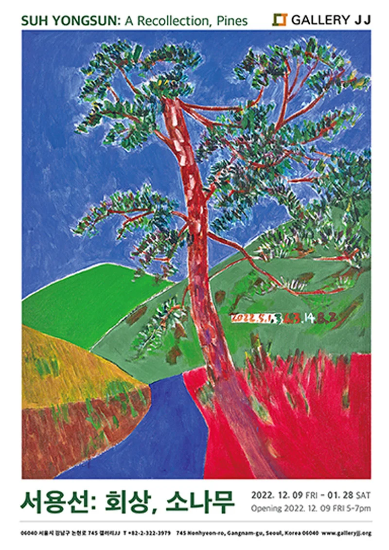 전시 개요 OVERVIEW 우리는 자연을 눈앞에 놓여진 대상으로 바라보기도 하지만 때론 몸과 하나된 자연 전체를 느끼고 그 열린 확장감을 경험한다. 갤러리JJ는 ‘그리기’를 중심으로 인간 탐구를 실천해오고 있는 작가 서용선의 개인전을 다시 마련하였다. 이번에는 소나무를 주제로 한다. 40여년전 그의 작업이 처음 널리 알려지기 시작한 것은 일련의 회화 연작으로, 그것은 오늘날 서용선 회화의 초석이자 출발선이라고도 할 수 있다. 지금까지 갤러리JJ에서 서용선의 전시로는 2018년에 자화상, 그 이듬해에 콜라주 및 오브제 입체 작업, 그리고 2020년에 약 1년 간의 빈 집 프로젝트를 진행하였고, 그 결과물이 2021년에 《서용선의 생각: 가루개 프로젝트》전시로 이어지고 책으로 출간이 되었다. 이들 전시는 각기 작가의 작업 방식을 다양한 각도에서 조망하였고, 이제 《서용선_회상, 소나무》 전시는 시간의 흐름을 거슬러 작업의 근원을 들여다 보고자 한다. 이번 전시에서는 드로잉 2점을 포함한 2022년의 신작 소나무 풍경 그림 9점을 새로 발표한다. 전시 구성은 데뷔작이라고 할 수 있는 초기 1983년 소나무 연작을 필두로, 80년대부터 최근 뉴욕에서 완성한 소나무 신작까지 19점을 선보인다. 또한 초기 드로잉들과 당시 작가가 찍은 소나무 사진 자료가 전시된다. 그동안 서용선의 ‘풍경’ 주제의 전시는 꽤 있었지만, 소나무 주제로는 이번 전시가 처음이며 초기 자료와 시기별 작품들을 한 자리에서 볼 수 있어 기대할 만하다. 전시는 초기 작가가 실험하고 모색하였던 회화적 비전으로 소나무 풍경이 어떻게 당대성을 획득했으며, 그것이 던지는 오늘날의 화두와 영향은 무엇인지 최근까지 전개된 변화 등에 주목한다. 데뷔 시기부터 현재에 이르기까지의 소나무 그림들 사이에서, 전시는 그동안 우리가 서용선 작업으로 익히 봐왔던 인물, 역사와 도시 삶의 이미지에서 한발짝 물러나서 어쩌면 ‘소나무’가 가진 상징성에, ‘산수’ 혹은 ‘풍경’ 그림에, 우리를 둘러싼 자연과 너머의 보이지 않는 먼 곳으로 우리의 시선을 잠시 돌리게 한다. 그림은 소나무 너머 우리가 몸담은 자연을 연결하고 광활한 우주로 확장된다. 지금까지 서용선의 작업은 인간 삶의 조건과 현실에 관한 주제에 천착하여, 투박한 형태와 강렬한 색채로 표현한 힘있는 화면으로 잘 알려져 있다. 그것은 역사화 연작과 도시사람들을 중심으로 신화와 전쟁, 풍경, 자화상 등으로 나타난다. 작가는 단종의 비극적 삶을 비롯하여 역사의 주변부 인물들과 오늘날 자신이 대면하는 현대도시 상황에 처해진 인간 존재, 부조리한 삶의 현장에 내재한 메커니즘과 보이지 않는 힘에 주목한다. 곧 역사 속 개인의 삶, 사회 시스템 속 특히 대도시인 서울, 뉴욕, 베를린, 멜버른 등 지구촌 사람들이 살아가는 모습을 끊임없이 탐색한다. 또한 ‘철암그리기’, ‘독도그리기’부터 현재 전남 신안군의 작은 섬 암태도의 농협창고에서 진행 중인 《암태소작항쟁 100년》 역사그리기까지 수많은 현장 프로젝트에 참여하여 공동체 간의 상호작용이나 삶의 현장 체험이 바탕이 되기도 한다. 이는 자신이 마주하여 몸에 새겨지는 현실이자 삶의 세계에서 인간이란 무엇인가에 대한 실존적 물음이라고 하겠다. 인문학적 성찰과 탄탄한 조형언어에 기초하여 80년대 이후 끈질기게 수행해온 이러한 독보적인 형상성의 작업은 한국현대미술사에서 중요하게 평가되며, 국립현대미술관을 비롯한 국내외 수많은 주요 미술관에 작품이 소장되어 있다. 현재 우리 삶의 현실을 파고드는 힘과 서사적 면모를 발휘하면서 그의 작업은 나날이 주목받으며 컬렉션의 영역이 넓어지고 있다. 1980년대 초반의 3년가량은 소나무 작업의 비중이 컸고 80년대 중반부터 를 비롯한 역사화와 도시인 연작들을 주로 내보이기 시작하면서 지금까지 현실 삶의 맥락에서 전개되어 왔다. 이번 전시에서 소나무 작업은 1991년에서 2009년으로 건너뛴다. 풍경을 테마로 하는 작업은 2009년부터 본격적으로 선보였기 때문이다. 당시 (리씨갤러리) 전시는 작가의 풍경을 전통적 산수의 관점으로 바라보았다. 작가가 그려온 풍경