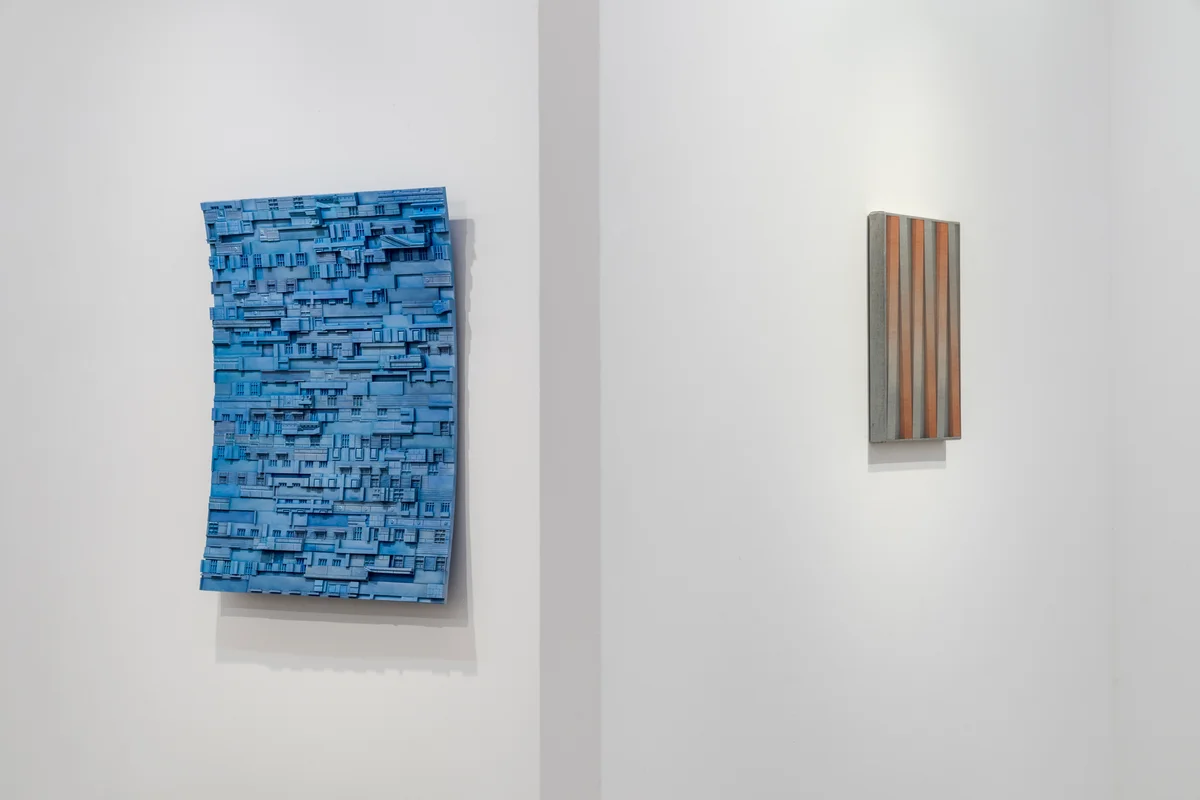 전시 개요 OVERVIEW 갤러리바톤은 김상균과 수잔 송의 2인전 《Lagrange Point (라그랑주 점)》을 2023년 4월 19일부터 5월 20일까지 한남동 전시 공간에서 개최한다. 이번 전시는 건축물의 일차적 특질(primary qualities)을 조각의 범주 안으로 끌어들인 일련의 부조 작업(김상균)과 인식의 영역에 존재하는 ‘공간’을 다양한 매체를 동원하여 환영적으로 재현(수잔 송)해 온 두 중견 작가의 작품을 한 공간에서 조망한다. 전시 제목은 이 전시가 이상적으로 지향하는 바를 암시하는데 해당 용어가 지구와 태양 사이에 실제 존재하는 “중력 상쇄 지점”을 나타내듯이, 두 작가의 작품이 어떠한 방식으로 각자의 독자적인 컨텍스트를 유지하며 상보적인 관계를 형성하는지 또한 흥미로운 지점이다. 특히, 수잔 송이 구현하는 개인적 연대기 안에서의 시공간에 대한 자각과 인식이, 김상균이 제시한 건축사적 유물의 차용과 조합을 통해 선택적으로 환원된 거시적인 시공간과 어떠한 맥락으로 얽히고 단일한 공간을 조화롭게 전유할 수 있는지를 질문한다. 김상균(b. 1967)은 현대 도심에서 과거를 환기하는 건축물을 매개로 그 안에 담긴 시대 정신과 헤게모니를 새롭게 해석한다. 20세기 초 제국주의 건축 양식을 기반으로 한 입체 및 평면 작업은 자신의 예술 철학의 기조인 후기 식민주의의 담론을 은연중에 드러낸다. 제국주의풍 파사드(façade)를 차용하여 축소된 크기의 콘크리트 패널로 생성한 후 이를 최소 단위로 분할하고 다시 조합하는 방식을 거쳐 완성된 작품은 고부조(high relief)와 저부조(low relief)가 혼용된 독특한 형태이다. 작가는 과거의 특정한 건물이 가졌던 아이덴티티를 해체하고 부여되었던 권위를 부정하는 접근법을 취해 혼성(hybrid)의 역사를 투사한다. 역사 속 건축물의 파사드와 동시대 건축물의 구조가 혼합된 작품들은, 전근대를 벗어나며 열강 체제가 열어젖힌 세계화의 초창기에 드리워졌던 인간의 꿈과 욕망을 다룬다. 작업의 주된 매체인 그라우트(grout), 우레탄 수지(urethane resin), 스테인리스강(stainless steel)은 산업화 및 근대 이후 건축의 토대를 이루는 핵심적인 소재이기도 하다. 이들의 물성(物性)과 외형적 특징을 빌려, 김상균은 과거를 선택적・순차적으로 전복해 오며 생성된 현대 사회의 단면과 사라져간 과거를 삼차원으로 환기한다. 2018년 개인전 <다시 쌓아올리기>에서 선보인 파편화된 그라우트가 집적된 무채색의 작업과 비교했을 때, 신작은 첨탑처럼 솟아있는 수직적 구조와 탈 평면화한 채색 부조의 시도가 특징적이다. 그간의 작업이 재료 그대로를 외양으로 드러냈다면, 신작 ‘Pattern Column’ 시리즈에서는 반복적인 공정을 거친 구조 위로 회화적 층위를 쌓아 올렸다. 출처가 불분명한 무한한 구조 속으로 색은 겹겹이 스며들어, 작가의 주관과 객관이 혼연한 새로운 조형적 질서를 만들어 낸다. 수잔 송(b.1974)은 비물질적 존재이자 관념적 대상인 ‘공간(Space)’에 대해 탐구한다. 자신의 인식 영역에 정립된 구체적 공간을 재현의 대상으로 삼아, 선과 절제된 색채를 사용한 회화 및 설치 작업을 전개하고 있다. 그녀는 기하학적 형태의 추상 회화를 통해 이차원 평면을 다면적인 차원으로 확장하고, 인식과 현실 사이에서 파생되는 이중성(duality)의 개념을 더욱 깊이 추구한다. 조형적 요소들의 연속적 상호작용을 유도하고자 트롱프뢰유(Trompe-l’oeil)를 비롯한 재료의 물성을 강조한 다양한 시각적 기법을 구현하고 있다. 수잔 송은 회화의 기본적인 요소인 색, 질감, 형태를 변주해 미묘한 아름다움을 형성한다. 캔버스 안에 적절한 균형비로 자리한 조형 요소들은 공간 대 공간, 선과 면, 수직과 수평 간의 관계에 활기를 부여한다. 수년간 이어온 비정형의 캔버스 작업은 수잔 송이 작품 속 여백의 공간을 추출해 분리하고 새로운 지각 형태로 변형시킨 결과이다. 기하학적 엄격성과 더불어 미니멀적 요소가 강조된 신작은 캔버스 공간 위로 색과 빛의 존재를 섬세