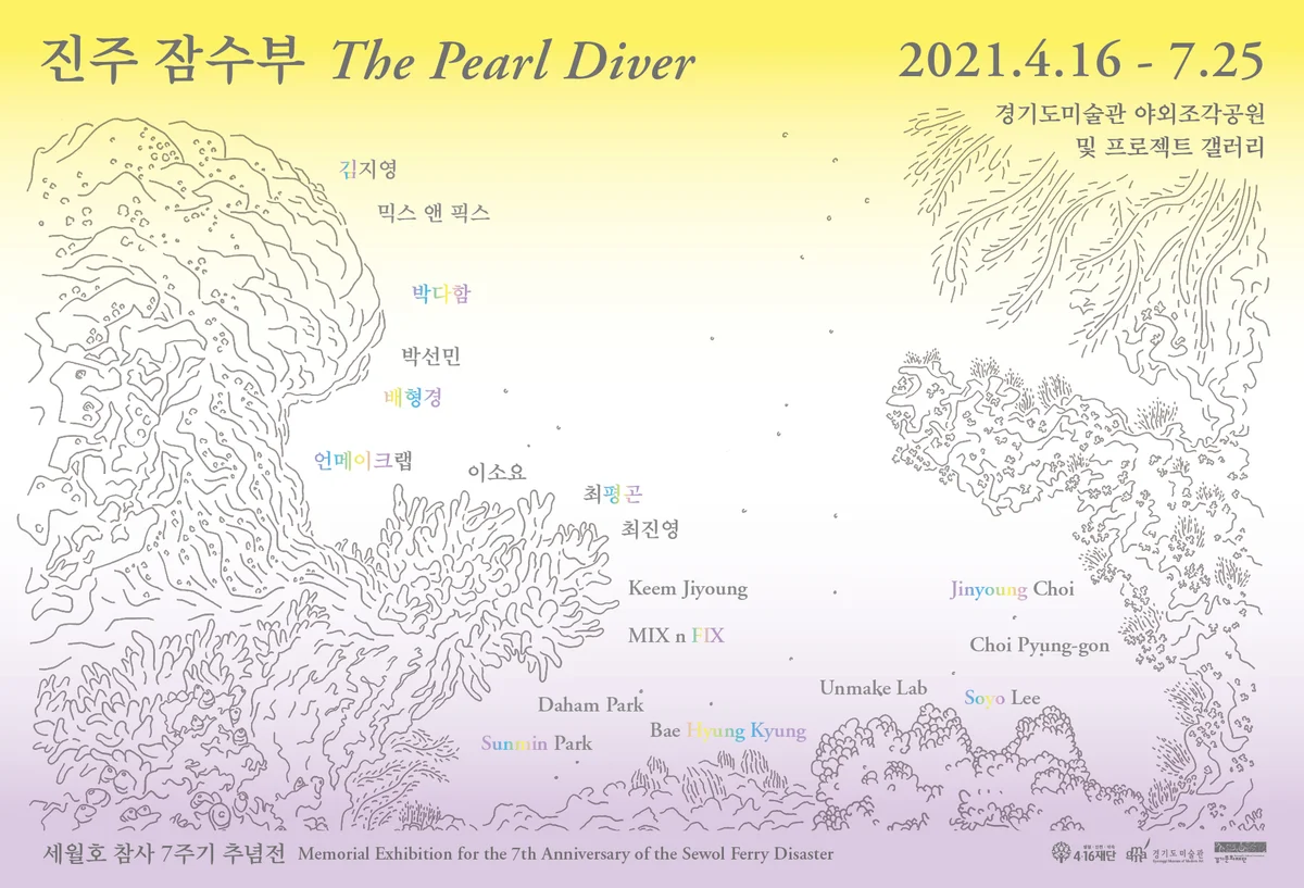 The Pearl Diver 《진주 잠수부》 2021. 04. 16. ~ 2021. 07. 25. 경기도미술관 야외조각공원 및 프로젝트 갤러리 《진주 잠수부》는 경기도미술관이 재단법인 4·16재단과 함께 주관하는 세월호 7주기 추념전이다. ‘진주 잠수부’라는 제목은 한나 아렌트(Hanna Arendt, 1906-1975)가 발터 벤야민(Walter Benjamin, 1892-1940)을 애도하면서 쓴 에세이의 소제목에서 가져온 것으로, 과거의 것들이 오래 기억되어 먼 미래에 그 의미를 건져 올릴 수 있기를 소망하는 뜻을 가지고 있다. 《진주 잠수부》는 야외에서 작업하는 것이 익숙한 작가들에게 세월호 합동 분향소가 있었던 경기도미술관의 앞마당을 내어주어 이 장소에 새겨진 기억들을 다시 불러낸다. 전시를 통해 우리의 애도의 과정과 그 마무리가 어떠했는지 깊이 생각해보며, 일상이 다시 펼쳐지고 있는 주변과 공동체를 다시 바라보고자 한다. 특별히, 전시를 계기로 자그마한 망대이자 기념비를 세워 이곳을 끝없는 기억과 증언 그리고 약속이 발생하는 의미있는 장소를 만들고자 한다. 우리가 겪는 수많은 재난과 그로 인한 상실감과 슬픔은 시간이 지나도 사라지지 않고 우리 곁을 맴돈다. 슬픔은 때로는 치밀어 오르는 분노로, 깊은 좌절감으로, 잊힐 것에 대한 두려움으로 그리고 결코 돌아오지 않을 것에 대한 기다림으로 그 모양을 바꿔가며 우리를 잠식한다. 예술은 물질을 통해서 이러한 슬픔의 다양한 형태들을 그려낼 수 있다. 이 과정은 타인의 아픔에 가장 깊숙이 공감하는 행위인 동시에 가장 강력한 연대와 증언이다. 아렌트는 재능 많고 예민했던 친구를 부조리한 전쟁의 상황 속에서 떠나보낸 깊은 슬픔 가운데서도 그가 세상에서 잊히는 것을 두려워했다. 《진주 잠수부》는 벤야민의 깊은 사유를 뜻하는 한편, 벤야민의 진주 같은 생각들이 바다 위로 캐 올릴 미래에 대한 간절한 소망이기도 하다. 우리도 아직 진행 중인 재난과 슬픔 속에서 시간을 인내하며, 치열하게 그 의미에 대해 질문하고 있다. ※ 경기도미술관은 COVID-19 상황에 따라 온라인 예약제를 통해 제한된 인원으로 관람할 수 있도록 하고 있습니다. 장소 경기도미술관 야외조각공원 및 프로젝트 갤러리 참여작가 김지영, 믹스 앤 픽스(구재회, 신익균, 권동현, 염철호, 최주원), 박다함, 박선민, 배형경, 언메이크랩, 이소요, 최평곤, 최진영 기획 이수영, 김현정(협력) 주최·주관 경기도미술관, 경기문화재단, 4·16재단 협찬 해양수산부, 한국목조건축협회, 삼화페인트, 경민산업주식회사 전시관람 예약 예약 바로가기