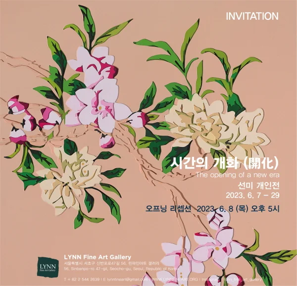 전시 개요 OVERVIEW 작가 선미가 2023년 6월 7일(수요일)부터 29일까지 린파인아트 갤러리에서 선미개인전 ‘시간의 개화(開化)’를 연다. 오랜 작업의 시간 동안 맨손으로 두꺼운 하드보드지를 오려내고 겹치면서 새로운 장면들을 만들어온 작가는 지난 전시에서 ‘사군자’를 철학적 주제로 다루면서 한층 의미가 두터워진 작업을 하고 있다. 이번 전시에서 선미는 10여점의 평면작품을 선보일 예정이며, 이 작업들은 조선시대 화조도를 재해석한 것이라 말할 수 있다. 작가는 조희룡의 매화도를 비롯해 여러 화조도에서 모티프를 얻은 작품들을 통해 매서운 겨울과 같던 팬데믹의 시간이 끝나고 새로운 희망의 시간이 찾아오리라는 메시지를 전달하고자 한다. 또한 작품을 바라보는 관객들의 아픔의 기억, 시간의 그늘이 꽃과 열매로 재탄생할 수 있음을 말한다. 따라서 선미의 작품에는 마냥 화사하고 아름다운 이미지만이 아니라 언제나 그것의 그림자가 공존한다. 그리고 단지 매혹적인 꽃의 이미지에서 멈추는 것이 아니라 그것이 품고 있는 세상을 이롭게 하는 열매의 가능성을 보여주고 있기도 하다. 따라서 우리는 선미의 작업에서 화려하지만 처연한 시간 그리고 하드보드지의 여러 레이어로 그림자를 품고 있으나 또 다른 삶을 품고 있는 열매의 시간과 마주할 수 있다. 아직도 끝나가는 것이 믿어지지 않는 기나긴 비대면의 시간을 보내는 우리에게 이러한 열매의 시간은 삶의 새로운 희망을 보여줄 것이다.