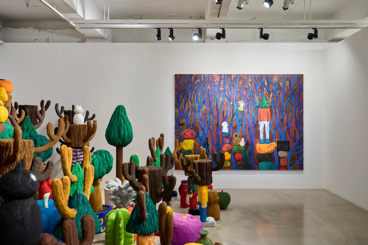 전시 개요 OVERVIEW 갤러리바톤은 유이치 히라코(Yuichi Hirako, b. 1982)의 개인전 《New Home》을 2024년 6월 5일부터 7월 13일까지 한남동 전시 공간에서 개최한다. 히라코는 자연, 동식물, 인간의 공존과 상호 의존적인 관계를 비유와 상징이 가득한 화풍으로 조명해왔다. 바톤과의 두 번째 개인전에서 작가는 회화, 조각 및 설치를 유기적으로 결합하여, 매체의 다양한 특질을 선택적으로 활용하여 작품 저변의 고유한 주제의식을 보다 입체적으로 구현해낸다. 히라코는 풍요로운 자연환경을 갖춘 일본 오카야마 현에서 태어나 유년기를 보냈다. 마을에 인접한 울창한 숲이 동식물이 의식주를 위탁하는 순환계의 구심임을 체득하며 성장한 작가는, 런던에서의 대학 생활 동안 도시의 녹지대와 인테리어용 식물의 주된 존재 이유가 인간의 정신적 위안에 치중되어 있음에 주목하게 된다. 인공적인 장소에 이식되어 기본적인 생육에 통제를 받다가 차례로 소멸하는 상황이 애초에 그들에게 주어진 운명일까 라는 작가의 문제 의식은 작품의 근간을 이루는 중심 주제로까지 발전하였다. 이는 모든 자연을 통일된 하나의 전체화된 개념에서 조망하는 심층 생태학(Deep ecology) 관점과도 연결되어 있는데, 히라코는 고유한 시각적 언어로 자연은 극복하거나 개척해야 하는 대상이 아닌 동등하게 대하고 존중해야 하는 독립적인 대상임을 설파해왔다. 파괴된 자연과 고통받는 동식물에 대한 적나라한 고발이 현대 환경 보호 운동의 효과적인 어젠다라면, 그는 미술의 매체적인 특성을 십분 활용하여 탈 제도적이고 온건한 방식으로 작품 자체의 미학적 가치에 더해 자신의 신념을 꾸준히 드러내오고 있다. 작업의 주요 등장 요소이자 근간을 이루는 하이브리드 캐릭터와 고양이, 강아지 등의 동식물은, 작품의 복합적인 서사성을 배가시키는 핵심적 역할을 하며 중심 주제에서 다층적으로 분화해가는 세부 스토리 라인을 구축한다. 이러한 보조 캐릭터의 등장은 유사한 시각매체인 애니메이션의 구성 기법에 있어 하나의 정석으로 여겨지는데, 장편 또는 시리즈에서 자칫 발생하기 쉬운 스토리의 단조로움을 피하고 장면의 정황 전달에 유용하기 때문이다. 메인 캐릭터와 같은 선상에서 항상 보호를 받는 설정은, 자연과 동물이라는 대상에 대해 작가가 품고 있는 연민을 상징하기도 한다. 작업 초기부터 큰 규모의 군락을 구상한 후 다양한 시행착오를 거치며 완성한 전시에서 가장 큰 비중을 차지하는 목제 조각들은, 동식물의 본성을 오랜 기간 관찰하고 자신의 작품에서 온전히 구현하고자 하였던 히라코의 의지가 보다 성숙한 단계로 들어섰음을 의미한다. 공통된 특질을 공유하기에 일견 유사해 보이지만 크기와 세부적인 부분에서 저마다의 부여된 차별성을 가진 조각들은, “동일한 집단 안에서의 설계된 세부 변이”라는 자연의 핵심적인 시스템적 특성을 시뮬레이션 한다. 전시명인 “New Home”은 인간의 관점에서 앞으로 펼쳐가야 할 미래의 이상적인 세계에 대한 작가의 대안적인 해답과도 같다. 북, 통기타, 랜턴 등 지난 세기를 상기하는 사물의 빈번한 등장은, 유한한 자원하에서 지구의 주기성에 맞춰 생육을 위해 자연과의 조화를 중시했던 시절을 연상시킨다. 자연이 순응과 극복의 대상이 아닌 극단적인 착취의 대상이 되어버린 현세의 지배적인 특징 중 하나는 과학적 합리성과 증명의 극단적인 신봉이고, 이런 관점에서 히라코의 작업은 하이브리드 캐릭터의 등장 만으로도 무척이나 초현실적이고 낯설어 보인다. 아이러니하게도 그 지점에서 히라코는 무수한 세월 동안 이어져왔던 자연과 인간의 암묵적인 공존의 역사가, 비정상적이고 퇴보로 치부되는 시대에 우리가 살고 있음을 위트 있고 때로는 의미심장하게 환기시킨다.