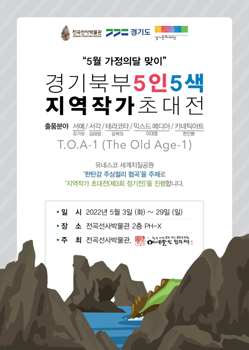 전시 소개글 전곡선사박물관과 한국 자연문화유산 보전을 위한 예술인협의체는 2022년 5월 한 달간 가정의 달을 맞이하여 ‘지역작가 초대전(제3회 정기전)’을 진행합니다. 경기 북부 지역을 근거지로 활동 중인 작가 5명이 제작한 5가지 분야의 작품 20여점으로 구성될 이번 전시는 박물관 2층 PH-X에서 5월 3일부터 20일까지 약 한 달간 전곡선사박물관을 찾는 관람객들에게 색다른 볼거리를 제공합니다. 전시는 ‘주상절리’를 주제로 ‘서예’, ‘서각’, ‘테라코타’, ‘믹스드 미디어’, ‘키네틱아트’ 5가지 분야의 작가들이 자신만의 작품세계 안에서 ‘주상절리’를 표현합니다. 특히, 이번 전시를 공동주최할 협의체는 경기 북부 지역의 지역 문화예술 활성화를 위해 연천과 동두천 등지에서 꾸준히 전시를 진행해오고 있으며, 전곡선사박물관에서의 전시는 2020년에 이어 이번이 두 번째입니다. 지역 예술단체와 함께하는 전곡선사박물관의 전시에 많은 참여부탁드립니다. #자연문화유산 # 경기북부 # 지역작가 이전 목록 다음 콘텐츠 정보에 만족하십니까? 만족 보통 불만족 확인