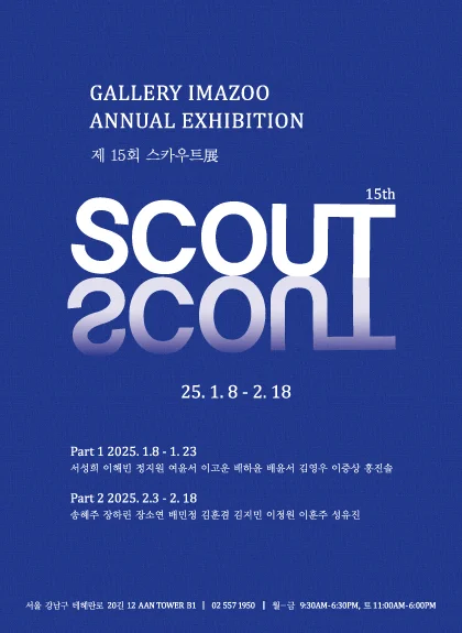 전시 개요 OVERVIEW 갤러리 이마주는 매년 뛰어난 재능을 가진 미대 졸업 예정자들을 선발해, 그들이 작가로서 첫발을 내딛을 수 있도록 지원하는 연례 기획전 <스카우트展>을 개최해왔다. 15회를 맞이한 이번 전시에서는 엄격한 심사를 거쳐 선정된 신진 작가들의 독창적인 작품들이 전시된다 이번 스카우트展은 작가들에게는 소중한 도약의 기회가, 관람객들에게는 신선한 예술적 영감을 받을 수 있는 시간이 될 것이다. 새로운 출발을 함께 축하하며 예비 작가들의 빛나는 재능을 만나보길 기대한다.