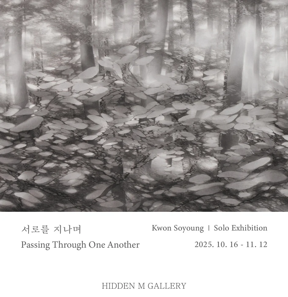 전시 개요 OVERVIEW 히든엠갤러리는 오는 10월 16일부터 11월 12일까지 권소영작가의 개인전 <Passing Through One Another>를 개최한다. 권소영작가는 직관적인 시선으로 자연을 인식하고, 이를 새롭게 변주된 풍경으로 화폭에 담아낸다. 자연과의 교감 속에서 내면 깊숙한 곳에 잠재된 감정과 감각이 깨어나는 순간을 포착하며, 실체와 비가시적 세계가 교차하는 풍경을 만들어낸다. 이는 단순한 자연의 재현을 넘어, 감각과 존재, 그리고 세계의 관계를 탐구하는 하나의 사유적 공간으로 확장된다. 이번 전시 <Passing Through One Another>에서 작가는 ‘존재의 관계성’을 중심에 둔다. 작가에게 자연은 단순한 배경이 아니라, ‘서로를 지나며 흔적을 남기는 존재들’이 만들어내는 유기적인 흐름이다. 바람과 빛, 바다와 같은 자연의 언어들은 작가에게 있어 감각을 깨우는 매개이자, 자신과 세계의 경계가 허물어지는 통로로 작용한다. 이 유동적인 순간 속에서 작가는 존재가 타자와의 관계 속에서 드러나고 변화하는 과정을 회화적으로 직조한다. 이번 개인전에서 제주라는 장소는 이번 작업에서 중요한 사유의 공간이 된다. 보이지 않지만 모든 생명을 통과하는 바람, 사라지는 것을 머무르게 하는 빛, 반복되는 파동 속의 바다는 작가에게 ‘존재의 방식’을 되묻게 하는 상징으로 다가왔다. 그 자연의 결을 따라 그려진 화면들은 시간과 기억, 감각과 감정이 포개지는 층위로 구성되며, 보이는 풍경 너머에 자리한 내면의 진동을 드러낸다. 권소영작가는 결국 ‘존재와 존재가 서로를 통과하며 남긴 흔적’의 기록이다. 그 흔적들은 사라지는 듯하지만 결코 지워지지 않는 결(結)로 남아, 관람자에게도 조용한 사유의 시간을 선사한다. 이번 전시는 자연과 인간, 세계와 나를 잇는 감응의 장(場)으로서, 우리가 서로를 지나며 남기는 보이지 않는 흔적의 의미를 다시금 되묻는다. 히든엠갤러리는 본 전시를 통해 권소영작가가 탐구해온 ‘존재의 관계성’이 한층 깊어진 시적 회화 세계를 조명하고자 한다. 작가의 작품을 통해 관람자 또한 자신을 스쳐간 기억과 감각의 결을 더듬으며, 세계와의 새로운 관계를 사유하게 되기를 바란다.