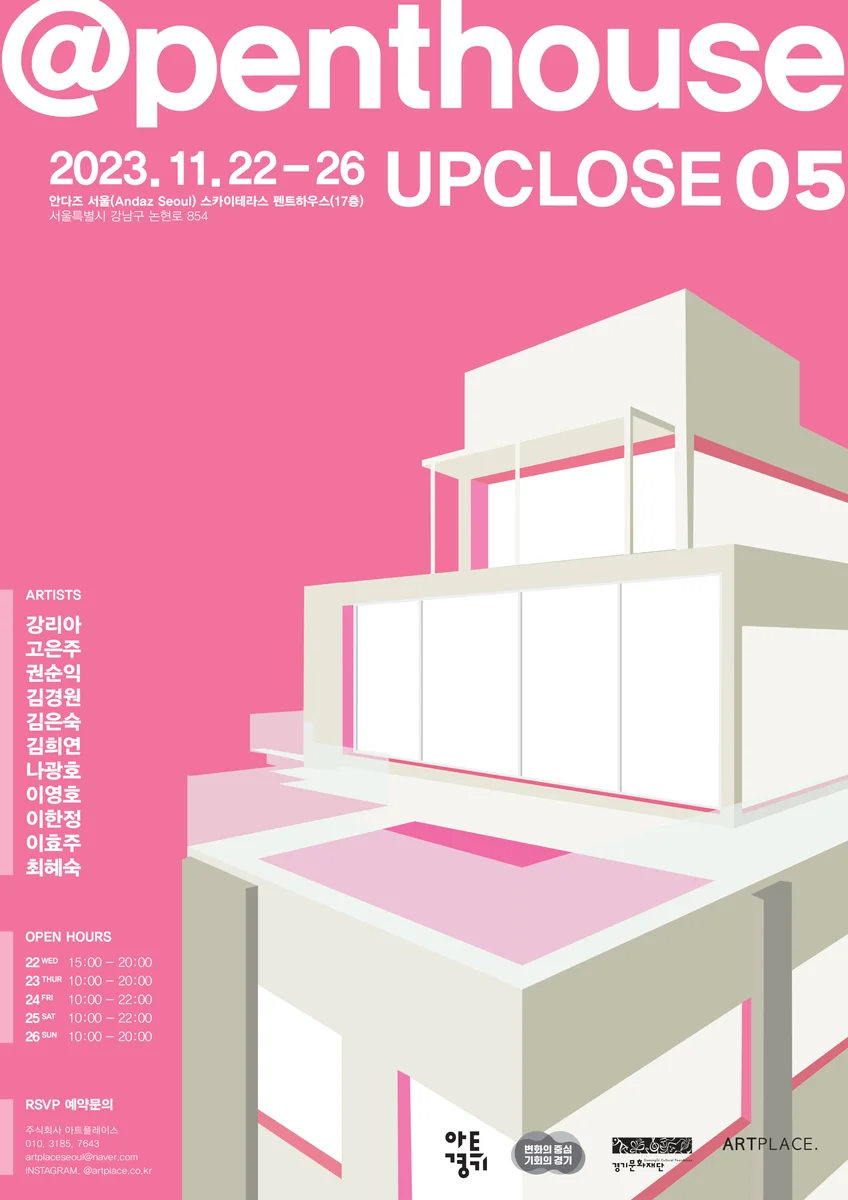 기간 2023-11-22(수) ~ 2023-11-26(일) 장소 안다즈 서울 스카이테라스 펜트하우스 기획 예술진흥실 참여작가 강리아, 고은주, 권순익, 김경원, 김은숙, 김희연, 나광호, 이영호, 이한정, 이효주, 최혜숙 주최/주관 경기도, 경기문화재단, 아트플레이스