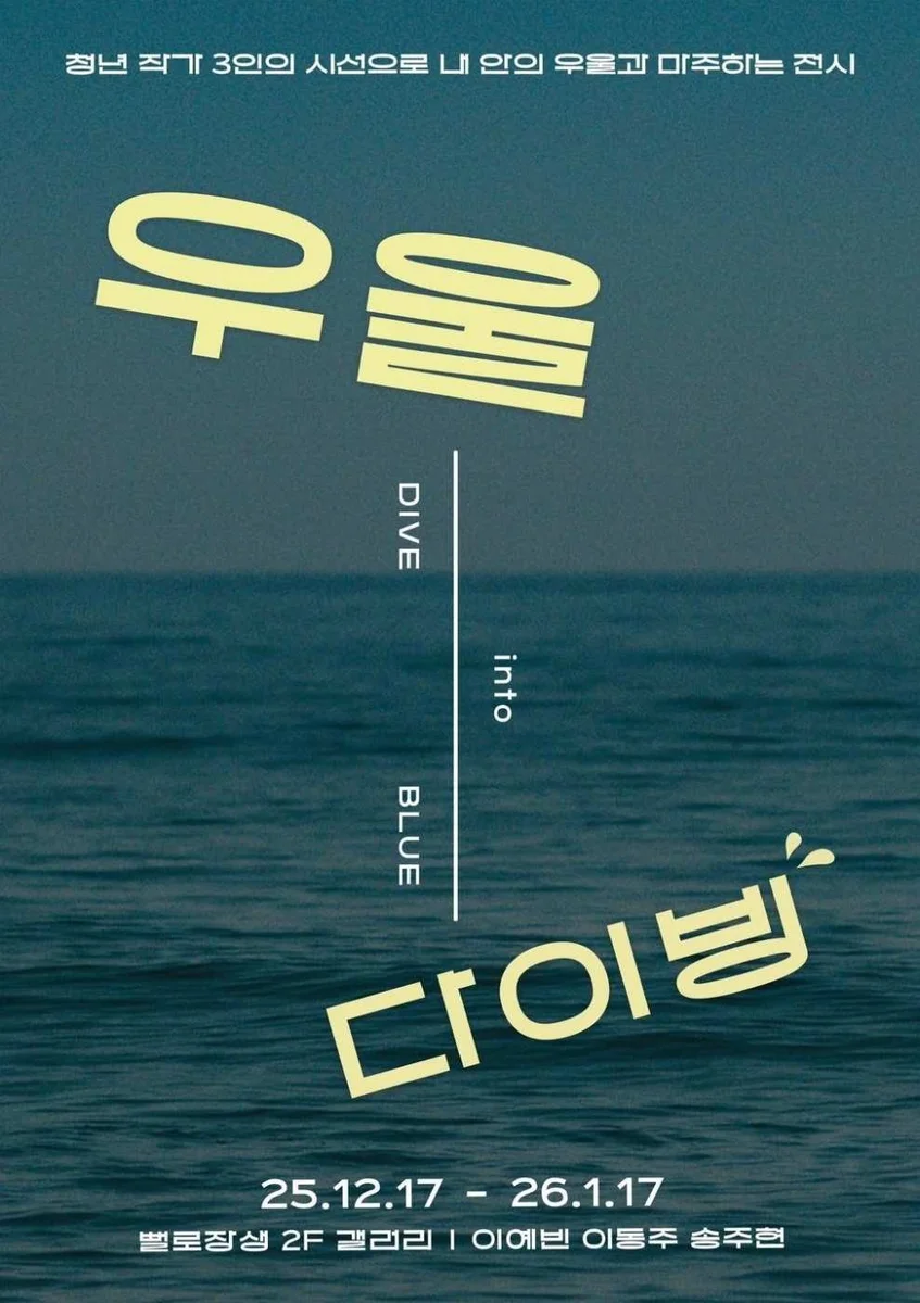 우울 다이빙 Dive into blue 우리는 살면서 다양한 형태의 우울을 마주하게 됩니다. 그러나 많은 사람이 여전히 ‘우울’이라는 감정을 애써 피하거나 숨기며, 마주하는 데 어려움을 느끼곤 합니다. 《우울 다이빙》은 우울에 깊이 다이빙해 보는 전시입니다 ? 우울을 경험한 세 작가의 시선을 통해 우울에서 회복으로 나아가는 과정을 단계별로 그려냈습니다. 이 공간에서만큼은 내 안의 우울을 마주하고, 감각하고, 수용하는 시간을 통해 내 안의 파란 마음을 자유로이 유영하는 시간이 되길 바랍니다 :) *출처: 뻘다방