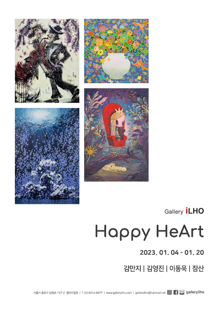 전시 개요 OVERVIEW 갤러리일호는 새해를 맞아 1월 4일부터 20일까지 Happy HeArt라는 주제로 감만지, 김영진, 이동욱, 잠산 4명의 작가와 함께 약 2주간 기획전을 진행합니다. 세상을 바라보는 작가만의 따뜻한 시선으로 먹의 갈필을 사용해 즉흥적인 붓질로 캐릭터화된 인물을 위트있게 그려내는 감만지 작가, 기쁜 소식을 상징하는 덩굴식물을 모티브로 하여 서로를 감아 올라 피어나는 덩굴의 군락처럼 더불어 사는 삶을 화폭에 담아내는 김영진 작가, 불안의 표상이자 그것을 해소하기 위한 매개물인 풍선을 세상을 바라보는 창틀로 여기며 연약하지만, 실체가 있는 희망의 뜻을 표현하는 이동욱 작가, 고정관념에 얽매이지 않고 서정적이고 아름다운 일러스트로 따뜻한 메시지를 전달하며 다양한 매체를 통해 대중들에게 알려진 컨셉아티스트 잠산 작가까지 4인의 작가와 함께합니다. 이번 전시를 통해 감만지, 김영진, 이동욱, 잠산 4인의 작품들을 한자리에서 감상하시고 Happy Heart, Happy Art라는 주제에 걸맞게 예술을 통해 일상에서 잠시나마 행복한 감정을 느끼며 의미 있는 시간이 되시길 바랍니다. 작가약력 감만지 | Gammanzi 개인전 2022 무심한 우리 Indifferent Humans, 정수아트센터, 서울 2022 Serendipity (세렌디피티), 갤러리엘르, 서울 2021 생각으로 바뀌는 기억 이야기, 정수아트센터, 서울 외 다수 그룹전 2022 MIAMI SCOPE, 마이애미, 미국 2022 작은 그림전, 갤러리벨비, 서울 2022 위안과 공감, 갤러리배누스, 서울 외 다수 김영진 | Kim Youngjin 개인전 2021 Kim young jin X 생활지음, 생활지음갤러리, 용인 2021 숨-결의 정원 (Life and nature), 스페이스 엄, 서울 2020 비익연리-Rendez-vous & Sweet flower, 갤러리다온, 서울 외 다수 그룹전 2022 크리스마스 소품전, 콜렉터제로원, 서울 2022 착한갤러리 12월 소품전, 착한갤러리 강남, 서울 2022 길리어드 희망갤러리 10주년 기념전, 갤러리 인사1010, 서울 외 다수 이동욱 | Lee Donguk 개인전 2022 블루, 그리고 다시 블루, 카라스갤러리, 서울 2022 이동욱 개인전, 아트리에본점, 경기 2018 풍선등화, 아트스페이스벤, 서울 외 다수 그룹전 2022 Youthful 22, 갤러리초이, 서울 2022 A poece of Hope 2, space R, 서울 2022 The Collection, 더현대서울, 서울 외 다수 잠산 | Jamsan 개인전 2021 잠산 개인전, 임페리얼펠리스 포월스갤러리, 서울 2020 잠산 개인전, 나우리아트갤러리, 서울 2019 잠산 개인전 빛과 그림자를 심다, L갤러리, 서울 외 다수 그룹전 2022 희수갤러리 13주년 감사선물전, 희수갤러리, 서울 2021 캐릭토피아 6인전, 성수 콜라스트갤러리, 서울 2021 Hello 이야기가 있는 미술관 3인전, 청주시립미술관 오창전시관, 청주 외 다수