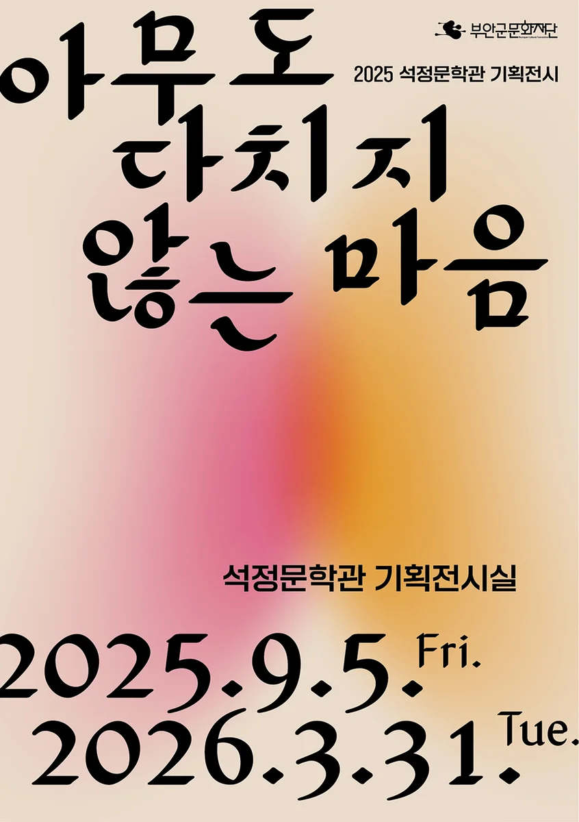 “신석정 시인의 문학 속에 담긴 따스한 감정들을 마주하다.” 2025 석정문학관 기획전시「아무도 다치지 않는 마음」 ·전시장소 : 석정문학관 기획전시실 ·전시일시 : 2025년 9월 5일 ~ 2026년 3월 31일 · 관람시간 : 10:00~18:00(매주 월요일 휴관) ·문의 : 063-584-6218(부안군문화재단 예술융합팀)