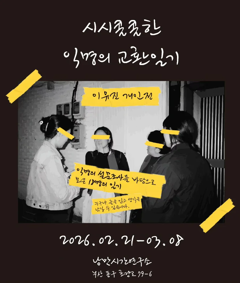 이유진 개인전-시시콜콜한 익명의 교환일기 우리 같이 교환일기 써볼래요? 부산의 예술 공간 낭만시간연구소가 2026년 새파란 공모작가 프로젝트 vol.3 선정 작가로 이유진 을 소개한다. 낭만시간연구소는 매년 청년작가의 첫 출발을 응원하며 개인전을 지원해 왔으며, 이번전시는 2002년생 이유진 작가의 새로운 시작을 알리는 자리다. 2026년 2월 21일부터 3월 8일까지 진행되는 이번 개인전 《시시콜콜한 익명의 교환일기》는 18명의 익명 응답자에게서 수집한 사적인 문장과 감정의 단서에서 출발해, 믿음과 의심이 반복되는 동시대의 심리 구조를 시각적으로 풀어낸다. 이번 전시에는 총 13점의 작품이 출품되며, 전 작품은 2026년 신작으로 구성된다. 전시장에는 하루 24시간을 24분으로 압축한 영상 작업이 반복 상영된다. 작가는 해가 뜨고 지는 시간의 흐름 속에서 매 시간 1분씩 촬영을 진행했다. 오프닝과 엔딩 없이 무한 반복되는 구조로 구성하여 관람객은 시작과 끝을 특정할 수 없다. 이는 삶이 특정 기점 없이 지속되는 시간의 감각을 환기한다. 작품 제목에 등장하는 <+1>, <-1>, <+5>, <-2>는 인간 심리의 편차를 도식화한 장치다. 작가는 평온한 상태를 ‘0’으로 설정하고, 세계와 가까워지는 맹신을 +1, 멀어지는 불신을 -1로 정의한다. 이는 응답자들이 언급한 반복되는 믿음과 의심의 진자운동을 수치화한 개념이다. 설치 작업에서는 두 개의 파이프가 각각 맹신과 불신의 주체로 등장하고, 그 사이의 벽은 0의 상태를 상징한다. 정확한 중간 지점에 도달할 수 있는가, 벽 너머에는 무엇이 존재하는가에 대한 질문은 구조와 거리의 문제로 치환된다. 〈압축된 시스템〉과 〈압축된 파이프 해부〉는 계단 아래의 독특한 문 구조에서 착안했다. 효율성을 극대화한 결과 날카로워진 형태는 현대 사회가 지향하는 ‘효율 중심의 삶’을 연상시킨다. 보이지 않는 벽 내부의 파이프는 얽혀 있는 심리와 관계를 은유하며, 건축적 해부를 통해 동시대의 긴장을 드러낸다. 《익명의 교환일기》는 관객 참여형 작업으로 확장된다. 관람객이 남기는 문장에 따라 작업의 결이 달라지며, 전시는 고정된 결과물이 아닌 생성 중인 상태로 존재한다. 누가 어떤 이야기를 적는가에 따라 전시는 미세하게 변주된다. 한편, 3월 1일(일) 오후 5시에는 작가와 직접 대화를 나누는 네트워킹 프로그램이 마련된다. 익명으로 시작된 시시콜콜한 이야기는 이 자리에서 대면의 관계로 전환된다. 보이지 않는 타인의 서사가 공간 안에서 익명으로 흐른다면, 네트워킹 시간은 그 거리를 잠시 좁히는 순간이다. 이는 작품이 제안하는 ‘거리’와 ‘관찰’의 태도를 실제 대화의 장으로 확장하는 계기가 될 예정이다. 이번 전시는 긍정과 부정의 판단을 유보한 채, 3인칭적 시선으로 자신과 세계를 관찰하는 방식을 제안한다. 사소하고 익명의 문장들로부터 시작된 질문은 결국 오늘을 살아가는 개인의 위치와 거리를 되묻는다.