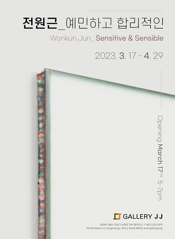 전시 개요 OVERVIEW “안료를 거의 물처럼 풀었을 때 컨트롤이 힘들다. 물감을 어린아이처럼 이해해야 비로소 물감을 다룰 수가 있다. 어쩌면 작가의 감각이나 느낌보다 이러한 ‘안료’가 더욱 예민하다.” – 전원근과의 대화 2023 우리는 무수한 색에 둘러싸여 살고 있다. 대상이 인간의 감각과 완전히 별개의 것이 아니라고 한다면, 색채 역시 인간의 감각과는 무관하게 존재하는 객관적 실체는 아니다. 전원근에게 있어서 색은 늘 감정을 동반한다. 갤러리JJ는 독일의 뒤셀도르프를 중심으로 활동하고 있으며, 감각적인 색-공간으로 회화를 탐구하는 전원근 작가의 개인전을 마련하였다. 작가는 자신이 경험하는 다양한 감정을 색을 통한 절제된 조형언어로 표현하고자 한다. 이번 전시 은 새롭게 발표하는 미색의 단색조 회화 작업을 중심으로, 백색 및 다양한 컬러의 모노크롬적 회화, 그리드와 원 이미지 시리즈의 신작들이 크기를 달리하여 함께 구성된다. 작품은 크기와 색상의 조화, 강약에 따라 고요하고 생동감 있는 분위기를 연출하며, 작업의 대표적 시리즈들을 통해 전시는 20년이라는 오랜 시간 실천해오고 있는 특유의 형식적 미를 기반으로 하는 작품세계의 독자성을 조명한다. 상호 침투하는 색채의 회화적 효과와 그 아름다운 변주가 기대된다. 전원근의 예술세계는 삶을 ‘색’으로 반향하는 그림으로 압축할 수 있을 것 같다. 그러기 위해서 그는 캔버스 위에서 새로운 색채를 찾아나간다. 우리에게 색면, 혹은 모노크롬적 추상회화로 친근한 그의 작업에는 독특한 아우라가 있다. 알다시피 작가는 반복적으로 색을 쌓고 ‘닦아내는’ 특유의 기법을 구축하였고 그것은 작업을 특별한 것으로 만든다. 곧, 다층적인 작업 방식으로 인해 화면은 두터운 물질성을 내보임과 동시에 표면이 투명한 듯 그 아래로 공간적인 깊이가 느껴진다. 색 이미지들은 모호하게 허공에 부유하며 힘의 강약 조절에 따라 닦고 남겨진 색들과 그 경계는 서로 부드럽게 스며들고 흐릿하게 보인다. 화면과 시각 사이에 일어나는 이러한 일들은 마치 시공간적으로 아득히 먼 것과 가까운 것이 동시에 현존하는 느낌을 준다. 그의 작업은 흔히 우리에게 차갑고 이성적인 작업으로 정형화된 미니멀리스트의 작품과는 차별적으로, 절제된 가운데 따뜻함까지 포용하면서 정서적으로 다가온다. 작가는 예술이 주는 위안과 치유의 힘을 믿으며, 이를 미학적 경험으로 안겨준다. 이렇게 전원근의 추상화는 가장 기본적 조형 요소인 점, 선, 면을 구성요소로 하며, 이성적인 동시에 수행과도 같은 오랜 시간의 반복과 누적의 과정을 동반하여 인간적인 흔적과 감성으로 동서양의 특징을 함께 담고 있다. 작가는 1998년부터 뒤셀도르프 예술아카데미에서 공부하고, 마이스터쉴러로서 헬무트 페더를레(Helmut Federle) 교수를 사사했다. 현재까지 뒤셀도르프에 거주하면서 작업하고 있으며 유럽을 중심으로 세계적으로 전시 활동을 하고 있다. 추상회화의 거장인 이미 크뇌벨(Imi Knoebel)이 전원근의 작품에 깊이 공감하면서 작품들을 소장하는 등 미술관을 비롯하여 국내외 수많은 컬렉터의 호응을 얻고 있다. 그의 작업은 모노크롬적 회화를 비롯하여, 다양한 색상을 한 화면 안에 연출하면서 사각형과 격자, 선, 원의 기하학적 형태로 전개해오고 있다. 전원근은 색으로 내면세계와의 합일을 꿈꿀진대, 그 열망은 새로운 색의 조화와 구조에 대한 치열한 탐색으로 실현되는 중이다. 우리의 내재된 미적 감각에 호소하는 예술적 방식, 마음을 움직이며 상상으로 이끄는 힘, 그의 예술이 주는 매력의 실체가 궁금해진다. 이번 전시에서 처음 선보이는 미색 모노크롬 작업은 그동안 전개해온 기하학적 이미지들을 거친 후 전원근 작업의 시작이자 대표적이라고 할 수 있는 흰색 모노크롬 작업이 회귀한 듯, 오히려 더 덜어내어 말을 아끼고 있다. “말을 아낄수록 더욱더 집약된 색들이 필요했다. 결국은 많은 설명이 한 화면에 필요하지 않음을 매번 깨닫게 된다.” – 작가노트 회화에서 단색의 추상적인 영역과 색의 관계에 대한 문제에 있어서 이브 클라인(Yves Klein)이나 마크 로스