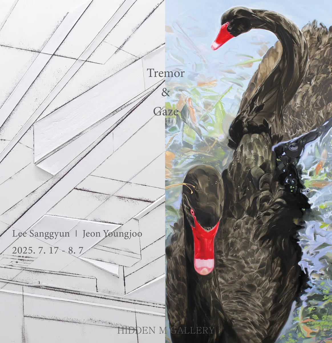 전시 개요 OVERVIEW 히든엠갤러리는 2025년 7월 17일부터 8월 7일까지 이상균, 전영주 작가의 2인전 <Tremor & Gaze>를 개최한다. 두 작가는 각자의 방식으로 구축해온 회화적 언어를 통해 물성과 감각를 탐색하며, 회화적 언어를 통한 작품을 선보인다. 전시 제목인 ‘Tremor’와 ‘Gaze’는 두 작가의 조형 개념과 회화를 통해 서로 다른 감각과 시선을 제시한다. 이상균은 거대한 건축 구조물의 규모, 다듬어지지 않은 외형, 물리적 감각에 주목한다. 작가는 직접 마주한 구조물의 압력과 중력, 그리고 그 안에서 느껴지는 재료의 저항을 감각적으로 포착하며, 회화 안에서의 물성과 시간성을 조형 언어로 구축해간다. 그가 주로 사용하는 먹줄은 건축 현장에서 직선을 긋기 위한 도구이지만, 작가는 충돌과 떨림의 흔적을 화면 위에 남기는 회화적 도구로 삼는다. 줄에 먹물을 머금게 한 뒤 바탕에 튕겨내며 발생하는 선은 예측 불가능한 흔들림을 지닌 채, 대상이 가진 힘과 균형, 긴장감을 주는 조형 요소로 작동한다. 최근 그는 색의 사용을 최대한 배제하며 티타늄 화이트색을 주로 사용하여 작업하고 있다. 작품의 색은 줄어들었지만 작가가 만들어낸 두터운 표현이 오히려 도드라지는 화면을 형성한다. 하얗고 중성적인 바탕 위를 가로지르는 먹선을 기준으로 접착된 흰색 물감의 두께와 각도를 조절하고 질감의 차이를 만든다. 직선적이고 두툼한 물질의 표현은 대형 구조물이 구축될 때 필요한 인공의 힘을 의식하며 작가가 정착한 방법이다. 건설 현장 내부에 직접 들어가 남긴 기록과 기억 속 구조물에 대한 경험은 먹선을 따라 만들어진다. 작가는 대상과 표현기법 자체를 동일시하는 태도가 반영되어 현재의 작품이 만들어졌다고 말한다. 이러한 물질의 형상은 붓질을 통한 재현과는 거리가 멀지만, 물질을 다루는 방식과 태도는 대상으로부터 가까워진다. 대상이 상기되는 그리기 방식과 색의 선택은 그에게 통제된 자율성을 부여하고, 그림을 그리고 있음을 잊지 않게끔 한다. 전영주작가는 익숙한 일상의 사물과 장면을 섬세하게 관찰하고, 작가만의 회화적 언어로 재구성한다. 작가는 여러 시점으로 촬영된 사진과 사소한 이미지의 파편들을 수집하고, 이를 해체하고 조합해 새로운 시각적 질서를 구축한다. 이때 핵심이 되는 감각은 ‘요철’이다. 요철은 이미지나 재료, 구성 안에서 작가가 마주한 미묘한 마찰의 지점이며, 평면과 입체, 구조와 내용, 매체와 회화의 경계를 만드는 요소가 된다. 이러한 ‘요철’에는 작가가 발견하는 이미지, 혹은 사용하는 매체에 매체에서 거슬리는 요소가 포함된다. 여기서 요철은 각각의 매체에서 다르게 작동한다. 평범한 장면이 가지는 긴장감이나 외부에서 발견하는 물감의 텍스처, 천의 결, 캔버스 틀의 두께 등 물리적 요소에서 찾는 물리적 요철이 있다. 작가는 이를 통해 일상적 장면에서 마찰을 일으키는 평면 작업과, 평면 작업에서 거슬리는 물성을 입체 매체의 방식인 캐스팅으로 구현하는 작업을 전개한다. 작가는 본인만의 시선으로 세계를 다시 재구축하기 위해 대상의 가장 단순한 차원인 여러 각도로 찍힌 2차원의 사진과 사건들을 대량으로 수집해 펼쳐본다. 주목받지 못해 종종 낯섦과 기이함을 품은 이미지들과 잃어버린 조각을 모아 하나의 모습을 상상한다. 조각난 마주침과 붓질이 모여 도상이 되는 과정은 추상에서부터 구상을 끌어오는 일과 같다. 그림을 눕혀 그리면 캔버스를 평행하게 세워둘 때와는 달리 화면을 수직으로 마주하며, 대각선으로 떨어지는 시선으로 그리는 과정을 거친다. 일부러 왜곡된 상태로 마주하고 온전히 볼 수 없는 이미지를 예측하며 그려나간다. 이는 작품의 일부분을 이루는 스트로크도 마찬가지며, 능숙함을 통해 우연적 효과의 모양을 미리 가늠해야만 한다. 작품의 최소 단위를 이루는 붓질은 파편화된 조각으로서, 구상적 도상을 향해 기워 맞추는 ‘패치워크’가 되어간다. 붓질 하나하나는 추상적 형태로의 가능성을 머금고 있다. 결핍을 보완하듯 파편들을 수집하고, 그 조각들을 맞춘다. 이는 회화 바깥의 물질성에도 주목한다. 캔버스 천의 결, 틀