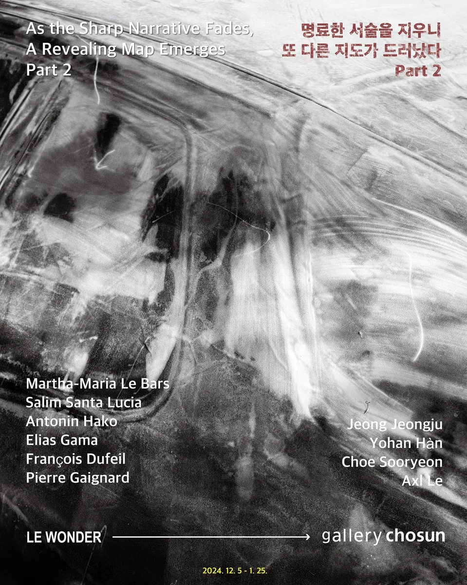 전시 개요 OVERVIEW 전시는 한국과 프랑스라는 두 영토 사이에서 지도 그리기를 시도한다. 프랑스의 비영리 단체 Le Wonder와 협력한 이번 전시는 2024년 상반기에 이어 진행하는 두 번째 교류다. 총 3회로 구성된 교류전에서 첫 번째 전시는 ‘일상과 예술’이라는 주제로 개별 작가들의 서로 다른 ‘명료한’ 세계관을 지우는 데 초점을 맞췄다. 한편 두 번째 교류전은 ‘가상성’을 주제로 개별 작가들이 공동의 지도를 그려내는 방식을 보여준다. 먼저 영토와 지도의 관계를 짚어보자. 영토는 한 국가의 통제권이 미치는 땅의 영역이다. 다시 말해 영토가 힘의 구역을 나누는 경계를 나타낸다면, 지도는 그 힘의 영역을 표상하는 이미지라고 할 수 있다. 우리는 왜 지도를 그리는가? 현실을 재현한 풍경 사진이나 그림과 달리, 지도는 서로 합의된 언어로 기호화 되며 표기된 위치 사이에 놓인 미확인 된 장소를 짚어낸다. 지도는 세계를 한 눈에 확인할 수 있는 장소로 환원시키는 지배적 욕망이 서려 있는 이미지인 한편, 그 사이 틈으로부터 알 수 없는 장소에 관한 낭만적 상상력을 추동하는 것이다. 전시는 각기 다른 지형 위에 놓인 10인의 작가들이 하나의 지도를 만들어가는 과정을 가시화 한다. 이때 지도는 명료하게 구획되는 이미지를 구현하지 않는다. 외려 애초에 구분된 땅과 땅을 펼쳐놓고 그 사이 미세하게 균열난 공간을 발굴하며, 빈틈을 찾기 위한 새로운 경로를 그려낸다. 말하자면 전시는 통합할 수 없는 각자의 영토 위에서 우리가 공동으로 딛을 수 있는 땅이 어디인지 확인하려는 시도이며, 지금의 세계로부터 또 다른 지형을 상상하기 위한 모험이 된다. Le Wonder는 프랑스에서 활동하는 작가를 중심으로 설립된 예술가 단체로서 작가가 직접 공간을 자생적으로 운영해 나가고 있다. 이 작가 컬렉티브는 파리 교외의 한 폐공장 건물을 주요 거점 삼아 다양한 실험을 개진한다. 다만, 일반적인 대안공간 운영 시스템과는 달리 개별 작가들은 각자 흩어진 상태로 활동하면서 조직된다. 약 60여 명이 활동하는 느슨한 공동체는 점차 그 규모를 확장해 현재는 전문 행정가를 대표로 두는 등 체계적인 시스템을 가진 일종의 기관으로 기능하고 있다. 그렇다면 왜 갤러리조선은 대안공간도, 단순한 작가 컬렉티브도 아닌 이들을 한국으로 초대하고 또 프랑스로 건너가길 준비하는가? 갤러리조선은 상업갤러리로서 한국의 현대미술 작가들을 소개해온 한편, 대형 화랑들 사이에서 퍼포먼스, 영상, 설치 등 다양한 매체들을 다루며 예술의 상품성과 갤러리의 기능에 관한 새로운 접근을 모색해왔다. 바꿔 말해 갤러리라는 공간의 정체성을 실험하는 방식으로 다양한 작가들과 협업해온 것이다. 이번 협력전은 위와 같은 공간의 성격으로부터 Le Wonder라는 단일 이름으로 규명할 수 없는 플랫폼과 접촉하기를 시도한다. 특히 작품의 유통 주체로서 갤러리의 역할을 다시 한번 점검하고, 하나의 커뮤니티로 확장해보기를 실천하는 것이다. 상품화를 지향하지 않으면서 자생적으로 시장에서 살아남을 수 있는 지형, 말하자면 지금에 없는 지도를 상상하면서 말이다. 한국과 프랑스를 오가는 이들은 흩어진 채로 뭉쳐 있는 몸집을 드러내고, 한 국가의 영토를 너머 새로운 지정학적 위치로부터 정치적인 실천들을 도모한다. 참여 작가는 한국작가 요한한, 정정주, 최수련 3인을 포함하여 중국과 노르웨이의 엑셀러(Axl Le), 프랑스의 마샤-마리아 르 바(Martha-Maria Le Bars), 살림 산타 루치아(Salim Santa Lucia), 안토닌 하코(Antonin Hako), 엘리아스 가마(Elias Gama), 프랑소와 뒤페(François Dufeil), 피에르 게너(Pierre Gaignard)까지 총 10인의 작가다. 이들은 서두에 밝힌 것처럼 ‘가상성’을 중심 주제로 한데 모였다. 지도가 힘의 구역을 경계 짓는 이미지인 동시에 가보지 못한 세계를 잠재적으로 상상하게 만드는 매개물이라고 할 때, 9인의 작가는 지도가 갖는 ‘가상성’에 집중해본다. ‘가상’(virtual)이라는 단어는 중세 라틴어