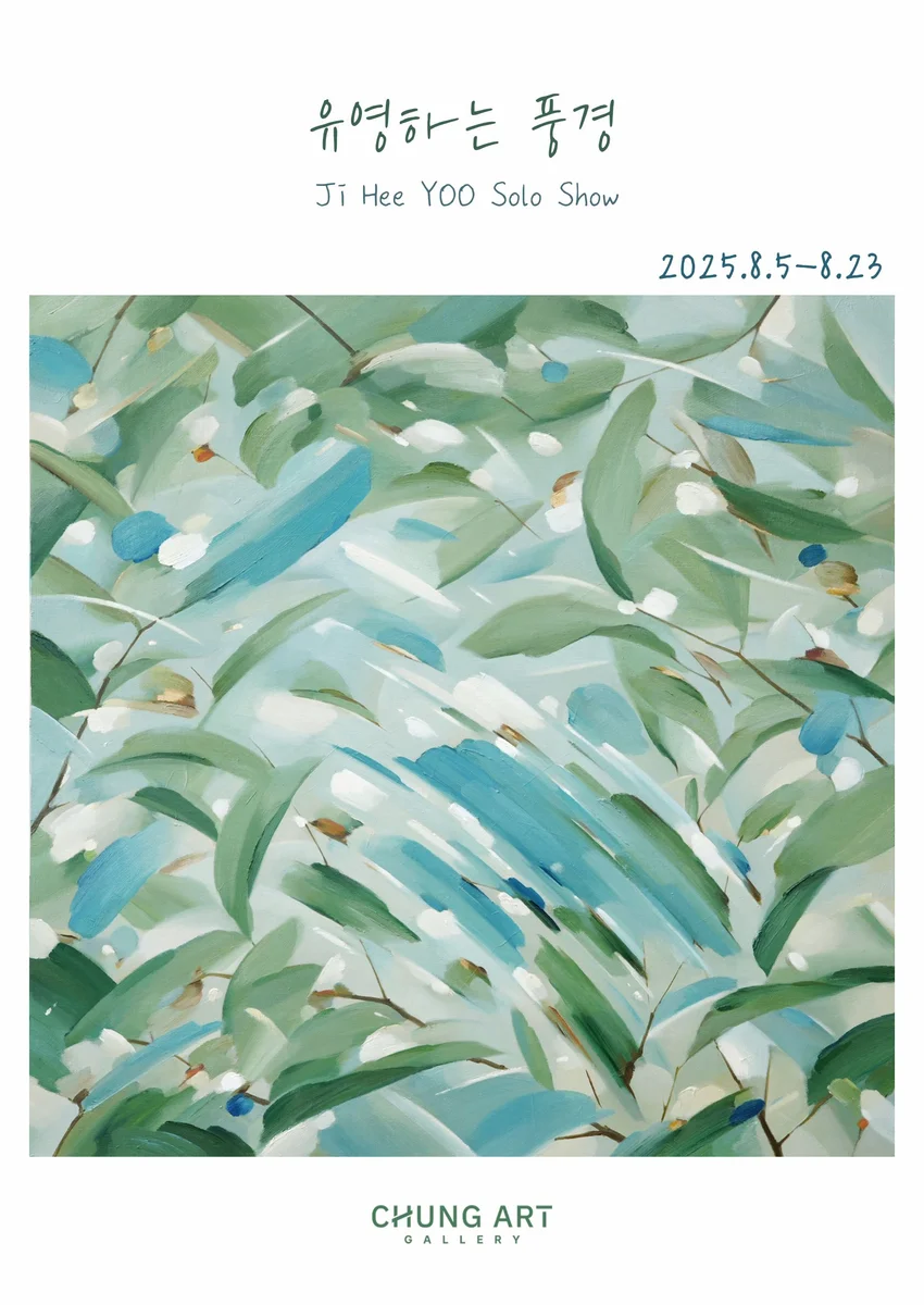 전시 개요 OVERVIEW 유영하는 풍경 전시제목: 유지희 개인전 <유영하는 풍경> 전시기간: 2025.8.5- 8.23 전시장소: 서울 강남구 삼성로 147길 4, 청화랑 작품문의: 02 543 1663, office@chungartgallery.com 청화랑은 8월 전시로 유지희 개인전: 유영하는 풍경 을 개최합니다. 88년생 유지희 작가는 홍대 회화과를 졸업하고 동대학원에서 회회과를 전공하였습니다. 청소년기 가족을 따라 해외살이를 해야했던 유지희 작가는 드넓은 자연에서 위로받고 평온했던 순간을 본인만의 반추상 방식으로 풀어냅니다. 푸르름이 가득한 작가의 작품에는 풀냄새, 나무냄새, 물과 바람, 자연이 느껴집니다. 관람자의 시각과 기분에 따라 물이되기도, 나뭇잎이 되기도 , 깊은 숲 속과 바람이 되기도 합니다. 생명력이 느껴지는 작가의 작품은 도심에서 생활하는 현대인에게 휴식 같은 시간을 선사합니다. 이번 8월 개인전을 위해 늦여름과 초가을에 어울리는 작품 스무점이 출품되었습니다. 작가의 작품속에서 자연의 향기를 느껴보시고, 마치 자연속으로 들어온 듯 평온한 시간이 되시길 바랍니다. 바람에 흔들리는 물결과 반영된 이미지들이 주는 추상적 색채와 형태에 매료되었던 순간을 시작으로 구상과 추상을 넘나드는 회화작업을 해나가고 있습니다. 끊임없이 움직이는 물의 이미지는 반복적으로 겹쳐올리는 물감과 색채의 붓터치, 리듬으로 표현됩니다. 물결 위로 투영된 풍경의 이미지들이 뒤섞이는 화면을 만들어내고 고정되지 않는 자연풍경의 순간을 캔버스 위에 붙잡아둡니다. 감각적 표현에 집중한 추상작품은 물 아래의 풍경과 물결, 수면에 비춰진 풍경이 보여주는 세가지 다른 이미지들의 겹침을 보여줍니다. 붓터치가 물결처럼 움직이고 바람에 흔들리는 잎사귀가 주는 형태와 리듬은 보는 이의 내면 속 자연의 기억과 감각을 불러일으킵니다. 화면 위를 떠다니는듯한 붓터치는 공기를 따라 흐르고 반복적 리듬이 되어 고요함 속 유동성과 몰입을 유도합니다. 건축적 구조 위로 유영하기도 하는 붓터치들은 프레임이 만들어내는 다층적 구조를 통해 마치 물을 바라보는 풍경처럼 서로 다른 시간대가 겹쳐지며 감각과 기억, 시간과 공간을 투영한 반추상적 풍경화로 재탄생합니다. 유지희 작가노트