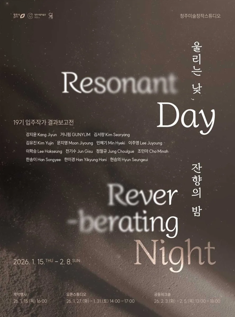 울리는 낮, 잔향의 밤 19기 입주작가 결과보고전 청주미술창작스튜디오 19기 결과보고전 《울리는 낮, 잔향의 밤》은 14인의 예술가가 입주기간 동안 서로의 시공간을 겹치며 공명했던 상호성과 창작의 기록이다. 작가들은 작업실과 전시실, 그리고 각자가 떠안은 현실의 문제를 오가면서도 집요하게 사유하고 감각하며 각자의 세계로 깊이 잠기는 과정을 반복했다. 그 지난한 과정 속에서도 작업실 벽을 맞댄 서로를 향해 귀를 기울이며 타인의 작업을 살피고 응답했다. 그 울림은 개별 작업에 머물지 않고, 관계와 대화, 공동의 경험으로 확장되었다. 지난해 릴레이 개인전을 통해 작가 개인의 성과를 집약적으로 선보였다면, 이번 결과보고전은 입주기간 전체의 과정에서 축적한 질문과 감각을 보여준다. 강지윤은 선명한 사실이라 일컬어지는 것들에 의문을 품으며, 흐릿하게 남는 잔상이 더 본질에 가까운 것이 아닌지 묻는다. 이제는 더 이상 손으로 온기를 감각할 수 없게 흔적으로 남은 존재들과 자신의 간극을 가늠하며 기억을 더듬고 바라본다. 거니림은 도시의 질서 속에서 이름을 잃은 생명들을 정면으로 바라보며, 우리가 무심히 통과해온 태도의 윤곽을 드러낸다. 인간이 마음 두지 않는 존재들에 대해 가차없는 현실을 파고들어 지속해서 질문을 남기며 기록하고 있다. 김서량은 도시를 구성하는 다양한 요소들이 객체로 분절되지 않은 채 하나의 흐름으로 얽히는 지점을 소리로 드러낸다. 청주의 여름과 소각장을 배경으로, 사라지고 생성되며 다시 흐르는 도시를 사운드스케이프로 펼쳐낸다. 김유진은 물이 머무르고 흐르는 순간을 통해, 시간이 개인의 내면에 스며드는 방식을 조용히 바라본다. 차와 찻자리를 매개로 이어진 그의 작업은 순환이라는 관념을 감정의 안식처이자 다시금 나아갈 시작점으로 되돌려 놓는다. 문지영은 장애와 돌봄의 전선에서 차오르는 감정의 균열과 질문들을 기반으로 더욱 돋아나는 애정을 화면 위로 끌어낸다. 구조의 문제점을 적시하는 것이 아니라, 더불어 살아가는 모든 이들을 오롯이 바라보는 태도로 포착한 가족의 일상을 담아낸다. 민혜기는 정교하게 설계한 기계장치들을 통해서 되려 세상을 이루는 최소 단위가 얼마나 불안정한지를 언급한다. 계산과 통제의 언어를 빌리되, 끝내 불완전한 영역으로 귀환하며 미시적인 요소들의 합으로 이루어진 이 세계를 다시 바라보게 한다. 이주영은 대상을 바라볼 때 아주 내밀한 감각들을 오래도록 쌓아 올리며 곁을 지킨다. 그의 작업 또한 그러한 시선을 닮은 밀도로 드러난다. 구조를 잡고 색을 절제했던 시기를 지나며 고요하지만 쉬이 떠날 수 없이 붙잡아 깊이를 남긴다. 이학승은 자신의 방식과 기준으로 타인을 해석하지 않고, 그들이 세계를 받아들이는 방식으로 스스로를 새롭게 리세팅하며 인식의 체계를 확장하려 시도한다. 소리를 매개로 한 그의 실천은 개인의 경험을 공동의 언어로 전환하며, 감각의 경계를 다시 쓰게 만든다. 전기수는 공동체 안에서 필연적으로 발생하는 마찰과 소음을 외면하지 않고, 그것을 최소화하려는 태도 자체를 작업의 중심에 둔다. 그는 옳고 그름을 단정하기보다 각자의 생존이 만들어내는 작용들을 들여다보며 다른 감각으로 치환한다. 정철규는 함부로 규정짓고 상처입힌 자들에 의해 숨겨지거나 조용히 감정을 삼켜내야했던 이들이 머물 수 있는 틈과 온기를 만들어낸다. 그의 작업은 사랑으로 환대받고자 하는 솔직한 욕망을 섬세하고 다양한 방식으로 풀어내고 품어낸다. 조민아는 갈등과 분열이 일상이 된 세계 한가운데서도, 아직 닫히지 않은 가능성의 지점을 조심스럽게 붙잡는다. 차분하고 신뢰 가능한 태도로 관계를 쌓아가듯, 그의 작업 역시 충돌과 불안을 과장하지 않고 세심하면서도 유쾌하게 삶의 유동적인 면을 그려낸다. 한송이는 현대사회 속에서 개인의 영역이 지켜지지 않는 경험으로 인해 자신만의 비밀을 간직할 기회를 박탈당했던 이들을 고려하며 보듬는다. 그의 작업에는 세밀함과 느슨한 리듬이 함께하는데 내면의 감각을 분명하게 남기면서도 언어화하지 않는 방식을 보인다. 한이경은 사소하고 다정한 감정들이 어떻게 구조화되고 소비되는지를 일상의 사물과 공간을 통해 천천히 드러낸다. 밝고 섬세한 정서를 바탕으로, 관람자가 무심히 지나쳤을 표식과 물성에 잠시 멈춰 서서 다시 바라보게 만드는 지점을 생성한다. 현승의는 낭만이라는 이름 아래에 침전된 방치와 폭력을 가시화한다. 정제된 무채색의 화면과 치밀한 구성 속에는 우리가 외면해 온 시간과 장소의 무게가 응축되어 있다. 위트 있는 요소들은 비극을 완화하지 않고 오히려 끝까지 시선을 붙든다. 활발했던 낮의 기록들은 축적한 감각과 질문들로 사라지지 않고, 잔향으로 남아 다음 시간을 예비한다. 《울리는 낮, 잔향의 밤》은 종결의 어둠이 아니라, 새로운 낮으로 향하는 숨결의 밤을 보낸다. 19기 입주작가 14인은 이번 전시로 레지던시를 마치고 각자의 낮을 향해 나아가지만, 이곳에서 형성된 태도와 감각은 이후의 작업 속에서도 지속적으로 호응할 것이다. 그들이 또 다
