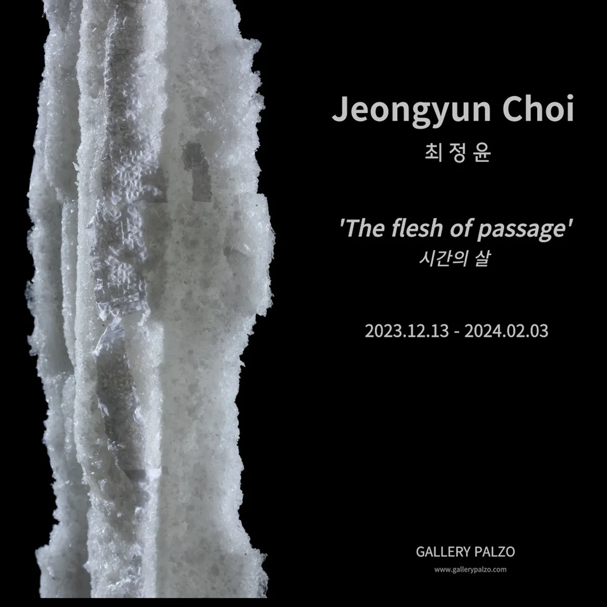 전시 개요 OVERVIEW 최정윤 작가는 예로부터 동양에서 권력의 상징이자 인간욕망의 역사적 실체였던 검의 본질적 속성을 재해석하는데 주력해왔고, 인간욕망의 허무한 관념적 실체를 시각적 대상물로 언어화하고자 하였다. 그가 선택한 초기 재료는 세라믹 이였지만 청동검을 재해석하는 방법론적 · 개념적 접근의 측면이 보편적 형식을 확장시키기에 한계가 있다고 느껴, 소금이라는 재료의 전환을 거쳐 현재는 꽃을 뜻하는 유기체를 통해서 형식의 변화와 은유적인 접근을 시도하고 있다. 그는 ’검과 꽃이 서로 상이한 듯 보이지만, 검의 형식에서 보여주는 직접적 · 보편적인 속성과, 꽃의 화려함 속에 교묘하게 감추어진 본질적인 욕망은 서로 관통하는 점이 있다고 본다. 그렇기 때문에 새로운 형식의 전환이 이루어지고 있을 뿐, 내용적으로는 개념적 유사성을 가지고 있는 작업이라고 할 수 있다.‘고 한다. 캔버스 작업은 삶의 무수한 고리 속에서 얽혀있는 인간사회의 현상을 여러 색상의 실로 구성한 것으로 흰색의 면 분할 구성 아래 감춰진 인간욕망의 현상을 시각적으로 언어화한 작품이다. Artist Jeongyun Choi has been concentrating on reimanaging(reinterpreting) the essential properties of the sword, which has been a symbol of power and a historical reality of human desire in the Orient since ancient times, and has tried to verbalize the futile abstract reality ideological substance of human desire into a visual object. The initial material he chose was ceramic, but he felt that the methodological or conceptual approach to reinterpreting the bronze sword had limitation in expanding the universal form. After that, through the conversion of salt as a material, he is currently attempting a metaphorical approach as well as a change in form through an organism called a flower. He said, ‘Although the sword and the flower seem to be different from each other, the direct and universal properties shown in the form of the sword and the essential desire skillfully hidden in the splendor of the flower seem to penetrate each other. Therefore, it can be said that it is a work that has conceptual similarities in terms of content, although a new format is being converted.’ Canvas work is a visual linguization of the phenomenon of human desire hidden under the split configuration of the white canvas by composing the phenomena of human society intertwined in the countless links of life with threads of various colors.