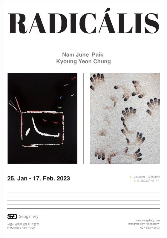 전시 개요 OVERVIEW 백남준, 정경연 그룹전 안녕하세요, 세오갤러리입니다. 새해 인사를 주고받은 것이 엊그제만 같은데, 벌써 1월의 중순입니다. 시대에 따라 가족의 의미가 계속 변화했지만 한 해의 시작을 알리는 날이 다가오면 한국인은 여전히 혈연, 민족이라는 울타리가 주는 삶과 뿌리 의식을 느낍니다. 세오갤러리는 2023년 첫 전시로 청년 시절 대부분을 타국에서 지내면서 한국인이라는 자기 뿌리를 잊지 않고 작품 소재로 승화시킨 백남준의 판화와 정경연의 섬유 작업을 준비했습니다. 첨단 테크놀리지 속에 자신의 전통문화와 사상, 한국인으로서의 뿌리 의식을 담아 화면을 구성한 백남준과 자식을 위해 기도하는 어머니의 손, 고된 유학 시절 손 보호를 위해 어머니께서 보내주신 면장갑을 통해 사랑과 그리움을 작품의 매개체로 사용하는 정경연, 그들의 작품들을 “뿌리”로 해석, 통합하여 의 주제로 가족들이 모이는 1월, 사랑을 담은 작품들의 세계로 초대합니다.
