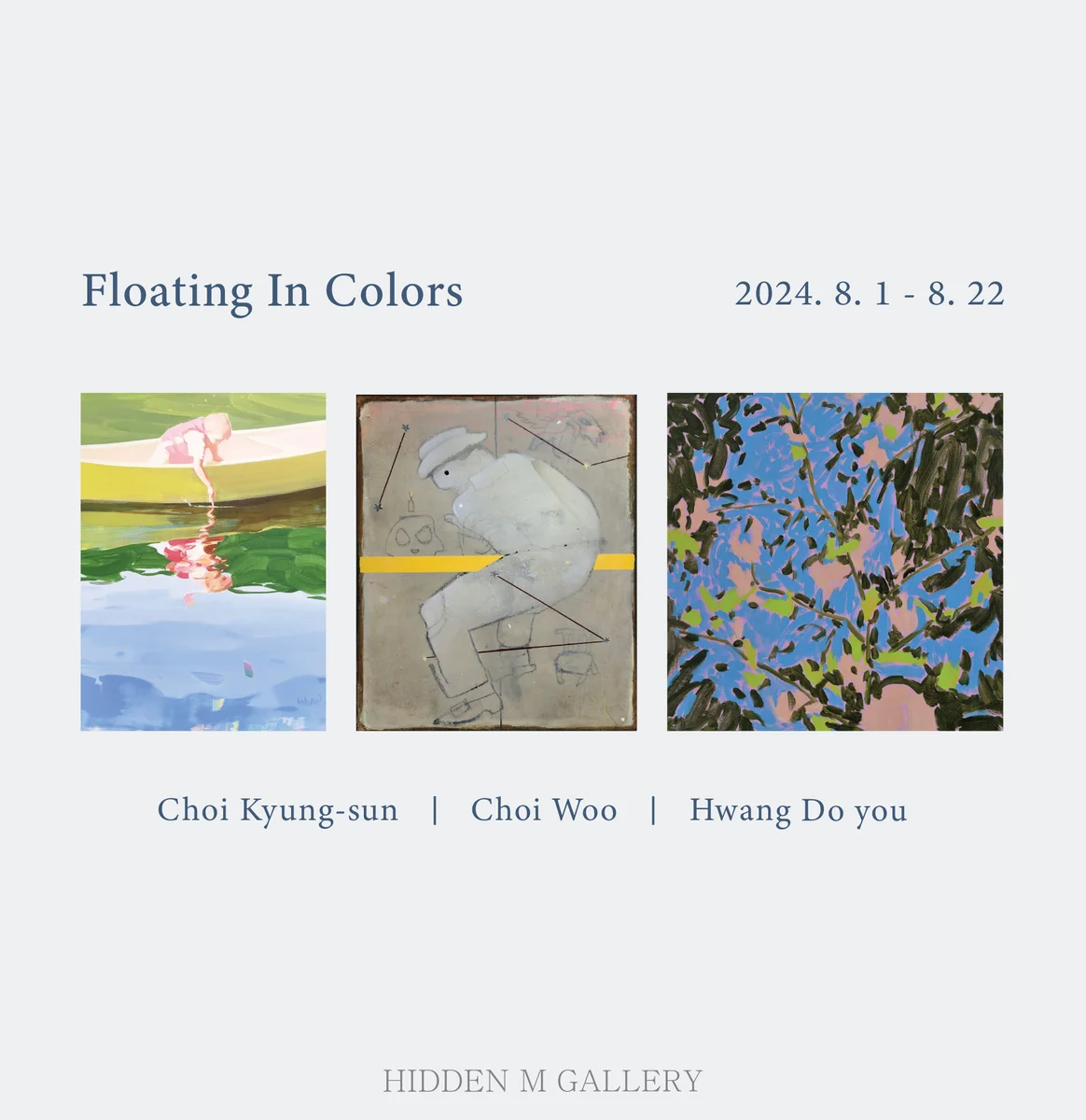 전시 개요 OVERVIEW 히든엠갤러리는 8월 1일부터 22일까지 최경선, 최우, 황도유작가의 3인전 <Floating In Colors>展을 개최한다. 이번 그룹전에서는 유동적인 색채의 흐름과 함께 다양한 매력을 엿볼 수 있는 세 작가들의 여러 작품이 소개된다. 최경선작가는 자연을 소재로 꾸준히 삶의 생동, 슬픔, 치유 등을 화폭에 담아왔다. 이번 전시에서 새롭게 선보이는 신작을 포함한 작품들은 ‘마음의 유영(遊泳)’을 표현한 작품들이다. 작가는 공중제비와 같은 마음의 동선에 대해 자주 사유한다. 고요한 수면, 야트막하게 핀 꽃, 흔들리는 풀숲, 아이의 몸짓, 동물의 콧잔등에서 마음이 물고기처럼 유연해진다고 믿는다. 작가는 공간을 누비는 마음이 이탈을 꿈꾸는 심상과는 거리가 있으며, 자신에게서 타인으로, 보이는 것에서 보이지 않는 것으로 건너가게 해주는 중심 리듬임을 밝힌다. 이는 기쁨, 낙심, 애도에 기꺼이 몸을 싣는 모양과도 같은듯하다. 계절의 변화가 갑자기 느껴지듯 고통이 슬픔으로 환기되는 미미한 전환의 순간에 작가는 특별히 감응한다. 대치되었던 모든 것들이 그 차이를 넘나드는 바로 그 때 생명의 언어가 태어나는 순간일지 모르기 때문이다. 또한 보는 이들로 하여금 작가는 부대낌이 있더라도 자연과 사람 안에 있는 태초의 명랑함을 볼 수 있는 삶의 리듬을 지니게 되기를 희망한다. 최우작가는 삶에 대해 끊임없이 질문하고 탐구한다. 작품을 통해 우리 삶의 불안과 고통을 직시하고, 그것을 통해 희망과 치유를 찾고자 한다. 작가는 고독한 삶의 여정을 지나는 이들, 그럼에도 불구하고 희망을 쫓는 이들을 화폭에 담아내고 있다. “살아가는 이들 중에는 사막을 여행하는 이들이 있다. 별들이 쏟아질 것 같은 바람 속에서 청한 거친 잠은 마법 같은 경험일 것이다. 그믐밤 둥근 천공에 은하수 흐르는 강가에는 세상을 떠난 영혼들도 앉아 논다. 삶의 여정을 계속하는 모든 이에게 평화의 강이 흐르듯.” – 최우 작가노트 중 황도유작가는 특유의 감각적인 색채와 분위기의 ‘이상한 나라의 앨리스’ 연작과 ‘서른세송이’ 연작을 주축으로 작품활동을 이어오고 있다. 작가는 자신의 작품들이 소재보다는 표현을 중시하고 있는 편이라고 말한다. 그는 같은 소재를 사용하더라도 새로운 기법과 표현세계를 향해 조금씩 전진해 나가고 있다. 이전부터 소재로 삼아온 대상들을 어떤 방식으로 새롭게 꾸밀지, 어떤 의미를 새로이 더할 수 있을지 연구하며 표현의 변화가 보는 이들에게 가져올 감상의 변화를 탐구한다. 시간과 노력의 축적으로 작품을 자연스럽게 변화시키고자 하며, 이를 통해 더 나은 그림을 위한 열망을 이루고자 한다. 특히 현재까지 활발히 진행중인 ‘서른세송이’연작은 손이 지닌 불완전한 기능이 오히려 미완의 미감을 드러낼 수도 있다는 점에서 착안되었다. 기존 작품 제작 방법과는 달리 스케치를 배제하고 붓칠 횟수를 줄이는 등 그 과정이 과감히 생략되었는데, 이를 통해 완성된 화면이 물감의 겹층이 아닌 단순한 풍경으로 보일 수 있도록 하는 작가의 고심을 엿볼 수 있다. 작가는 위 과정의 반복적인 연마를 토대로 회화적 순수미를 추구한다.