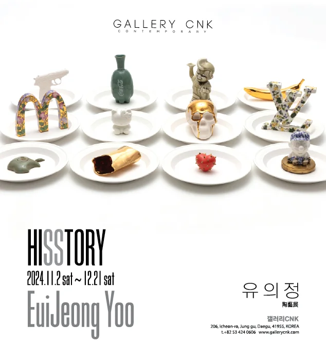 전시 개요 OVERVIEW 유의정 Euijeong YOO (b. 1981) 2024.11. 2~ 12.21 갤러리CNK는 유구한 도자예술의 축적된 전통 형식을 취하되 어느 작품보다 현대적인 한국 감성을 가지고 있으며 조각보다 더 조각적이고 회화보다 더 회화적인 입체 작품의 완성을 보여주는 유의정 작가의 개인전을 가진다. 전시타이틀 <HISSTORY>는 ‘어떤 이의 이야기’(his story)들이 모여 하나의 역사(history)가 된다는 의미를 중의적으로 담아낸 것이다. 거시적 형식의 방대한 도자사가 미시적 관점으로는 한 개인의 이야기를 기록하여 제작한 작품들이 모인 것이라는 것을 바탕으로, 작가는 개인의 이야기를 기록하듯 작업들을 제작한다. ‘거대한 도시개발과 산업화가 진행되는 중심에 서 있던 서양의 한 철학자는 삶의 터전이 급격히 변화되는 비현실적 풍경을 그저 거닐 듯 바라볼 수밖에 없는 자신을 산책자(Flâneur/walker)에 비유하였다. 그때와는 다르게 수차례 거듭된 변화로 이미 첨단의 끝을 달리는 세상에 익숙해져 버린 나는 도리어 ‘인류의 가장 오래된 예술인 도예’를 마주하고 경험하였을 때, 그 철학자의 비유처럼 눈앞에 펼쳐진 비현실적인 사물을 그저 거닐 듯 바라볼 수밖에 없었다. 근대화와 함께 시작된 ‘자연주의’적 사고 속에서 인간은 ‘현실 세계’에 기반한 기술과 도구의 고도화로 삶의 효율성을 극대화하였다. 그러나 이러한 ‘합리적 사고’로의 이행이 오히려 상상의 범위를 ‘현실’이라는 영역 속에 가두게 된 건 아닌지 스스로 반문하며, 은유와 상징으로 가득 찬 도자예술의 조형언어를 탐구함으로써 비로소 지금 내가 감각하고 있는 물질의 유연함과 잠재성을 발견할 수 있었다. ……… 누군가 ‘창조는 무(無)에서 만들어지는 것이 아니라, 어떤 한계 상황을 돌파하기 위한 의지와 변형들로부터 비롯된다’고 하였다. 나에게 ‘도자예술’이란 무엇인가‘라는 질문에 대한 답을 찾아가는 과정은 주로 박물관에서 출발해 내가 살고있는 ‘지금 시대’에 대한 관찰로 이어지게 되었다. 박물관에서 전시 중인 도자기는 시간에 맞설 수 있는 태생적인 강인함으로 고대의 사회상을 담아 현재의 시간까지 전하고 있다. 남겨진 도자기들은 시간성 및 지역성에 대한 지표로 활용된다. 도자기의 색과 형태, 문양 등을 통하여 당대의 사상과 유행 등 인간의 내세적, 현세적 욕구를 반영하고 있음을 알 수 있다. ‘유물’로서의 도자에 대한 나의 학습과 경험은 자연스레 현재의 사회적 환경에 대한 관찰과 남겨질 것들에 대한 연구로 확장되었다. 시간의 흐름을 통해 형성된 사회적, 문화적 형식들을 접목하고 조합하여, 동시대 도자예술의 조형 가능성을 탐구하고 있다.‘ – 유의정 이번 전시의 작품들은 그의 작품에서 지켜지는 전통의 우아함과 현실의 다양함이 절묘하게 조화되어있다. 박물관의 한 벽을 옮겨온 듯한 1층의 신-백자 작품들은 현재의 감각적인 컬러위에 유물이 내려앉은 듯 청렴한 사대부의 붓끝이 느껴진다. 스킵프로어의 대형 ‘Poem for Clay’ 작품을 지나 통창을 통해 외부와 연결되는 2층 공간에는 ‘Treasures of Daily Life’시리즈가 설치되며 현실의 풍경과 상징적인 이미지를 담은 작품들이 조화를 이룬다. 3층 큐브 공간에는 그의 회화적 테크닉과 뛰어난 공예의 정신이 돋보이는 청화백자 시리즈를 전시함으로써 천년의 역사를 바탕으로 지난한 연구와 반복만이 창조해 낼 수 있는 유의정만의 시각 언어를 담아낸다. 주요 전시로 2011년 서울현대도예공모전 대상 수상에 이어 <청주국제공예비엔날레>(2015), 영국 빅토리아 앨버트 박물관(Victoria & AlbertMuseum)<Contemporary Korean Ceramics>(2017), <Korean Contemporary Ceramic Art > Ceramic Art Andenne 2022, 벨기에 앙덴느,<Hidden Colours : Korean Contemporary Ceramic Art>라피신 미술관, 프랑스 루베(2022), <2022 Taiwan Ceramics Bienn