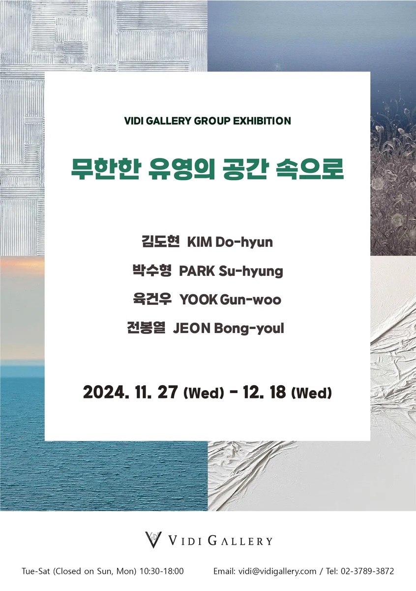 전시 개요 OVERVIEW 비디갤러리에서는 11월 27일부터 12월 18일까지 김도현, 박수형, 육건우, 전봉열 작가의 초대 4인전인 <무한한 유영의 공간 속으로>를 진행한다. 김도현 작가는 휴식(休息)과 회복(恢復)의 내적 안정을 평면의 캔버스 위에 시각적으로 표현한다. 또한 반복되는 선과 면으로 구성되어 있는 입체적 화면과 겹겹이 쌓이고 채워진 색채의 리듬감 속에서 자유로운 형태와 색, 그리고 단조로운 공간의 질서를 구축한다. 이러한 색과 형태, 질감의 조화를 통해 문자적인 표현을 뛰어넘는 고요함을 전달하며, 캔버스를 가득 채우는 추상적인 형태는 평화롭고 우아한 움직임을 만들어 그 깊이 속으로 빠져들게 한다. 심리적으로 안정을 주는 색채를 사용하여 공간에 스며드는 분위기를 조성함과 동시에 질감은 단순하지만 반복적인 터치로 재료가 가지고 있는 그대로의 물성을 표현하여 안락함의 감정을 더하고 있다. 박수형 작가의 작업은 주위 환경으로부터의 경험과 사유를 혼합한 결과물이다. 캔버스 위의 점, 선, 면은 식물의 이미지로 치환되며, 작가는 이러한 식물 이미지를 통해 사회상을 은유하고 있다. 여름날의 식물과 겨울 식물들의 모습을 관찰하여 매년을 주기로 반복되는 영원한 반복성을 표현한다. 마치 우리가 사는 세상이 만겁의 세월 속의 찰나인 듯 풀의 짧은 주기를 통해 우리들의 삶을 반추해보며, 식물의 역동적 모습을 통해 사소하지만 강인한 생명력을 작품에 담아내고 있다. “continuous play” 시리즈 작업은 주로 인공 진주가루와 은색을 중심적인 색채로 사용한다. 여러 가지 이유 중 하나로 물감이 지니고 있는 자체의 색 외에, 주위 광원과 환경에 영향을 받아 빛이 반사되어 다시금 새로운 색으로 나타나기 때문이다. 이러한 표면은 주위 환경과 사회에 의해 개인의 의지와 상관없이 변화, 적응하는 동시대인의 모습을 표현한 시도이기도 하다. 육건우 작가는 패브릭을 주요 소재로 심리적 추상을 이미지화 하는 설치 미술가로, 천연섬유와 젯소를 주로 사용하여 평면 위 레이아웃을 구성하고 백색의 다양한 주름을 변주시킨다. 그는 이러한 기법을 사용한 4가지 주제(intension, tension, beyond, layer upon layer)를 통해 심리를 묘사하고자 한다. 최근에는 백색을 주로 사용하던 것에서 벗어나 다양한 컬러를 활용하며 그가 다루는 심리묘사를 더욱 다각화하고 있다. 작가는 감정의 극한과 그 사이로 울려 퍼지는 감각에 기인하여 패브릭 소재가 가진 불완전하지만, 가장 온전한 찰나의 순간을 포착한다. 장력이 주는 긴장감은 극한의 감정을 만들고, 반복된 주름의 드레이프는 몽환적 번뇌의 내면세계를 연출하기도 한다. 이렇듯 물성을 거슬러 완성된 실루엣은 빛과 그림자로 인한 직관적이고 새로운 감정의 해석을 감상자에게 전달한다. 전봉열 작가는 바다를 소재로 색의 배열과 미세한 질감에 의한 감수성을 담아낸 단순한 색・면 형식의 작업을 진행하고 있다. 넓고 푸른 바다를 멍하니 바라보고 있을 때면 어느 순간 시선이 수평선에 고정되고 깊은 생각에 잠길 때가 있다. 그러한 생각에 잠기는 지점은 곧 자기 자신과 조우하는 순간이며, 작가는 부유하는 생각들이 자신을 더 내밀하게 알 수 있도록 하는 소중한 경험이 되어 준다고 이야기한다. 또 이러한 시간들이 누적될수록 점차 선명해지는 자신의 모습이 바로 자기 정체성일 것이다. 즉 전봉열 작가의 작업은 나 자신, 더 나아가 한 사람의 정체성 형성에 대한 의미를 담고 있다. 세상의 흐름 속에서 잠시 스스로 큰 쉼표를 찍어 자신과 마주하는 시간을 경험하고, 그 시간의 밀도만큼 자기 주도적인 삶으로 이어지길 바라는 마음을 작품을 통해 전달하고 있다.