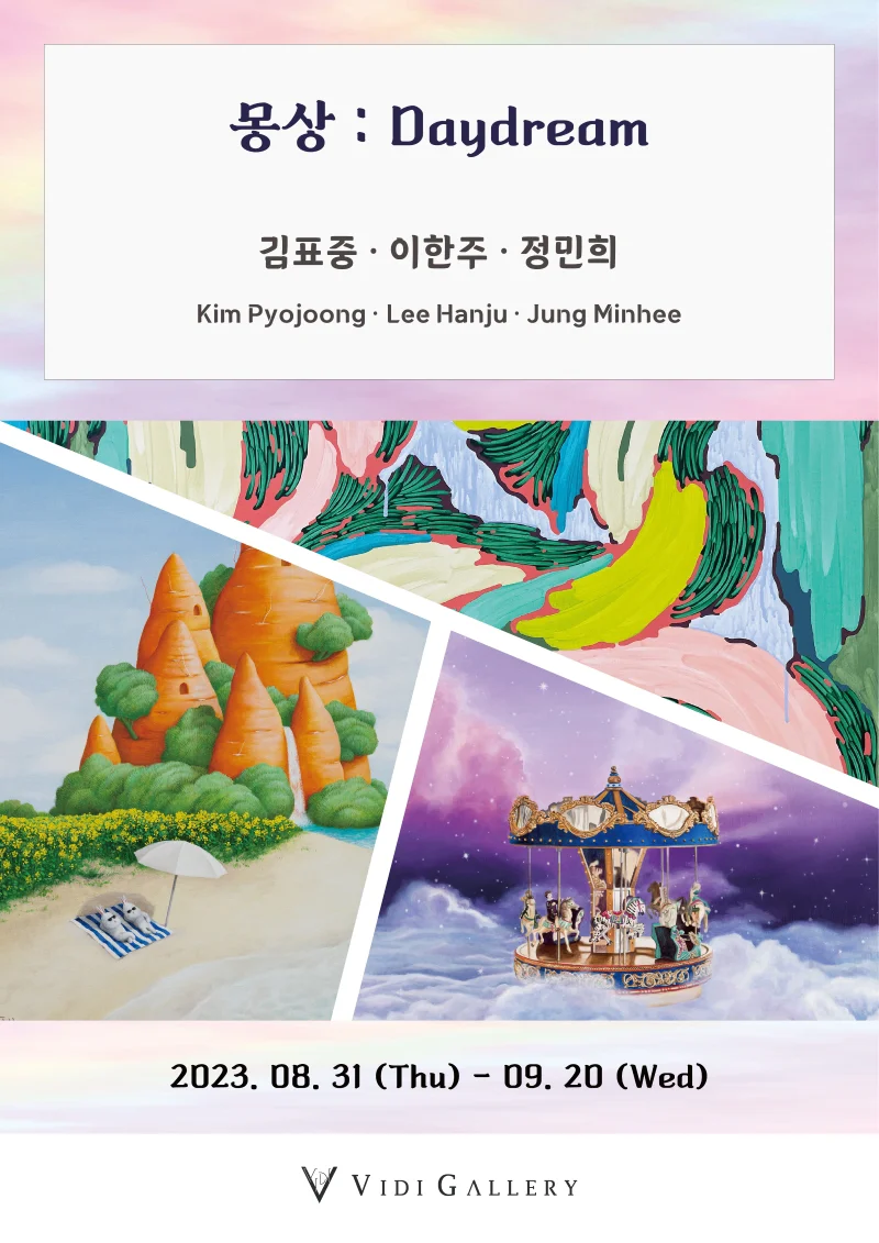 전시 개요 OVERVIEW 비디갤러리에서는 08월 31일부터 09월 20일까지 김표중, 이한주, 정민희 작가의 3인 기획 초대전인 [몽상 : Daydream]을 진행한다. 김표중 작가가 풀어내는 작업의 주된 소재인 ‘캐롯토피아(Carrotopia)’는 당근으로 만들어진 유토피아를 의미하며, 토끼가 답답한 현실을 벗어나 이상향의 세계를 여행하는 이야기가 묘사되어 있다. 토끼는 본래 예민한 동물로 정신적으로 지쳐 긴장 속에 살아가는 현대인들과 닮아있다. 뿐만 아니라 토끼는 물과 그리 친하지 않은 동물이지만, 캐롯토피아 속의 토끼는 커다란 당근성과 폭포, 그리고 바닷가를 넘나들며 휴식을 즐기고 있다. 이는 감상자에게 긍정적인 에너지를 전달함과 동시에, 그림 속 토끼처럼 숨 막히는 현실에서 벗어나 일상 속 작은 삶의 여유를 가지길 바란다는 작가의 메시지가 담겨있다. 이한주 작가가 그려낸 상상 속 유토피아의 공간은 어떠한 풍경 그대로의 모습이 아닌 재구성된 자연으로 여러 가지 판타지적인 요소를 지니고 있다. 이곳에서의 문은 안과 밖을 차단하고 있지만, 그 경계를 연결하는 역할을 하기도 한다. 일상과 환상은 아주 멀리 있는 듯하지만 가만히 들여다보면 모두가 가진 특별함이 있고, 문을 여는 조금의 변화로 그 경계가 허물어진다. 문 앞에 잠든 고양이, 동화 속에서 나온 듯한 동물들. 작품 속 생명들은 여리지만 경계 없이 평화롭다. 이처럼 작가는 유토피아를 통해 한 차원 더 편안한 쉼, 숨, 안락함, 고요함 등을 표현하고자 하였고, 일상과 환상의 경계에서 재창조된 초현실적 공간과 시선으로 무수한 이야기를 만들어간다. 정민희 작가는 자본주의 사회구조 속 일상생활에서 겪게 되는 소외를 극복하기 위한 방법 중 하나로, 익숙한 공간으로부터 순간적으로 낯설게 다가오는 것들을 새롭게 발견하고 찾아간다. 특히 산책 중 마주하게 되는 길게 늘어선 가로수, 그리고 도심 속 자연이라 불리는 공원 숲길 등의 장소에서 영감을 받은 작가는 그러한 자연의 일부분을 확대하고 축소하며 정원을 가꾸듯 가상의 공간을 만들어낸다. 또한 일정하면서도 무질서한 자연의 패턴을 수집하고, 연결되고 끊어지는 지점에서 반복적으로 보여지는 나뭇잎 사이사이의 공간들을 찾아 그것을 캔버스에 담아낸다. 이렇게 반복되고, 다시 미세하게 달라지는 것들을 기록하며 발견된 비-일상의 순간들은 외부적으로 발생되는 소외와 불안을 극복하게 해줄 수 있다고 작가는 이야기한다.