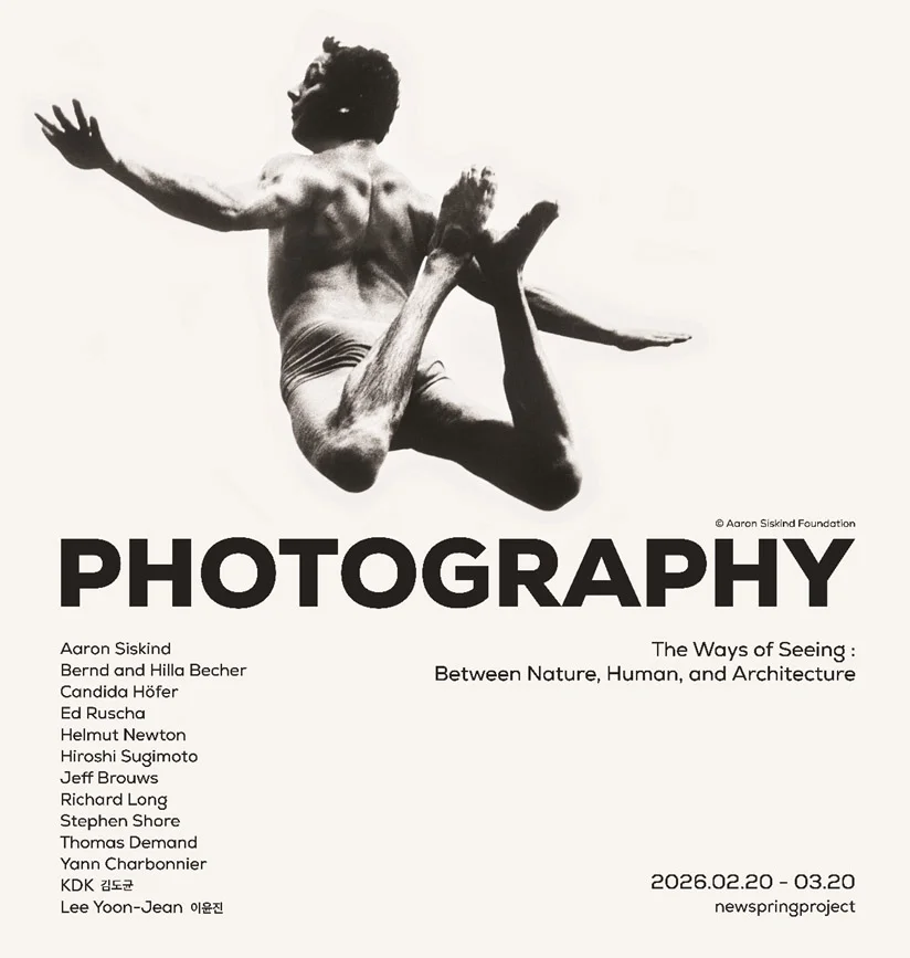 뉴스프링프로젝트는 2026년을 여는 첫 전시로 《The Ways of Seeing: Between Nature, Human, and Architecture》를 개최한다. 본 전시는 개관 이후 처음으로 사진 매체에 초점을 둔 기획으로, 사진을 통해 세계를 인식하는 다양한 방식과 그 가능성을 탐구하고자 한다. 우리는 세계를 있는 그대로 바라보고 있다고 믿지만, 보는 행위는 언제나 특정한 조건과 관계 속에서 이루어진다. 시선은 단순히 대상을 포착하는 감각이 아니라, 무엇을 중요하게 인식할 것인가를 선택하고 구성하는 하나의 방식이다. 이미지는 대상의 외형을 전달하는 데 그치지 않고, 그것이 놓인 맥락과 위치, 그리고 생산·유통되는 조건에 따라 끊임없이 새로운 의미를 형성한다. 즉, 우리가 인식하는 세계는 언제나 하나의 해석된 세계라 할 수 있다. 사진은 이러한 인식을 다시 생각하게 만드는 매체다. 한 순간을 포착하지만, 프레임 안으로 포함되거나 배제된 대상, 선택된 거리와 시점, 시간의 응축은 우리가 익숙하게 받아들여 온 세계의 질서를 흔들고, 보이지 않던 관계와 구조를 드러낸다. 사진은 현실을 단순히 재현하기보다, 세계를 바라보는 방식을 재구성하는 시각적 장치로 기능한다. 이번 전시는 사진이라는 매체를 통해 세계를 바라보는 서로 다른 방식, 다시 말해 ‘보는 행위’ 그 자체를 질문한다. 사진을 단순한 이미지 생산의 결과가 아니라, 자연과 인간, 건축이라는 세계의 층위들을 새롭게 사유하게 만드는 시선이자 방법으로 제시한다. 1950년대부터 현재까지, 사진은 재현의 문제를 넘어 세계를 인식하는 새로운 구조를 실험해 왔다. 본 전시는 이러한 흐름 속에서 활동한 작가들의 작업을 중심으로, 사진 매체의 확장된 가능성을 살펴본다. 미국, 유럽, 아시아를 기반으로 활동하는 13인, 총 40점의 작품이 전시되며, 애론 시스킨드, 베른트 & 힐라 베허, 에드 루샤, 리차드 롱, 히로시 스기모토, 헬무트 뉴턴, 캔디다 회퍼, 제프 브라우스, 스티븐 쇼어, 토마스 데만트, 얀 샤르보니에, KDK 김도균, 이윤진의 작업이 포함된다. 이들은 사진이 회화, 조각, 개념미술, 퍼포먼스 등과 교차하며 형성해 온 미학적 지형을 보여주며, 사진이 동시대 미술에서 핵심적 사유의 장으로 기능해 왔음을 드러낸다. 전시는 자연, 인간, 건축이라는 세 축을 따라 흐르는 다양한 시선을 보여준다. 리차드 롱은 ⟨African Walk⟩에서 걷기를 통해 자연을 경험의 시간으로 전환하고, 애론 시스킨드 ⟨Pleasures and Terrors of Levitation⟩ 연작은 신체의 움직임으로 인간 존재의 긴장과 희열을 추상화한다. 에드 루샤 ⟨Swimming Pool⟩과 ⟨Parking Lot⟩ 시리즈는 일상의 도시 풍경을 거리감 있는 구도로 담아 공간을 구조와 기호의 문제로 전환하며, 베른트 & 힐라 베허는 산업 건축을 유형학적으로 기록해 건축을 이미지 체계로 바라보게 한다. 히로시 스기모토 ⟨Theater⟩는 빛의 흐름을 통해 시간성과 현실의 감각을 재조정하며, 사진이 현실을 재현하는 동시에 허구를 만들어 내는 방식을 보여준다. 《The Ways of Seeing: Between Nature, Human, and Architecture》는 자연을 풍경으로, 인간을 주체로, 건축을 배경으로 고정해 온 기존 시각적 질서에서 벗어나, 이들 사이의 관계를 새롭게 바라보도록 제안한다. 사진을 단순한 장르로 규정하지 않고, 동시대 미술 안에서 세계를 인식하고 해석하는 하나의 방식으로 제시하며, 우리가 무엇을 보고 어떻게 보고 있는지를 질문하는 계기가 된다. 참여 작가: Aaron Siskind, Bernd & Hilla Becher, Candida Höfer, Ed Ruscha, Helmut Newton, Hiroshi Sugimoto, Jeff Brouws, Richard Long, Stephen Shore, Thomas Demand, Yann Charbonnier, KDK 김도균, Lee Yoon-Jean 이윤진 전시 주최: 뉴스프링프로젝트