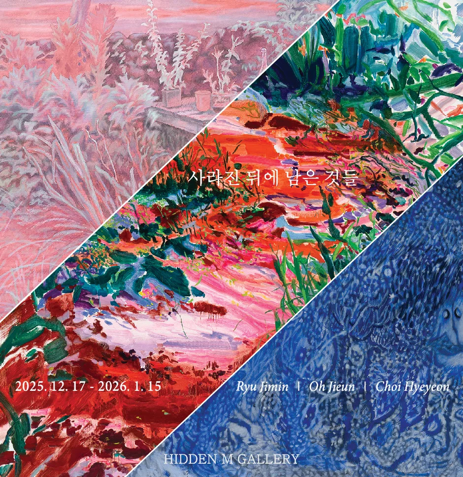 전시 개요 OVERVIEW 히든엠갤러리는 오는 12월 17일부터 2026년 1월 15일까지 류지민, 오지은, 최혜연 작가의 3인전 <사라진 뒤에 남은 것들>을 개최합니다. 이번 전시는 일상의 순간, 감정의 잔향, 무의식의 흔적처럼 쉽게 소멸되거나 포착하기 어려운 것들을 작품으로 풀어내는 세 작가의 시선을 조명한다. 사라지는 장면과 흐릿해진 기억, 내면의 깊은 층위에서 떠오른 형상들은 서로 교차하며, 현실과 비현실, 의식과 무의식, 감정과 잔상 사이의 경계를 확장한다. 서로 다른 작업 방식을 지닌 세 작가는 모두 개인의 경험과 기억, 내면의 감정에서 출발한다. 그러나 찰나의 풍경을 언어와 이미지의 층위로 재구성하는 방식, 감정과 시간을 색과 리듬으로 환원하는 태도, 개인과 사회의 무의식을 은유적 공간에 투영하는 접근은 각기 다른 결을 드러낸다. 이 차이는 하나의 주제 안에서 느슨하게 연결되며, 사라진 이후에도 남아 있는 감각과 기억의 다양한 모습을 드러낸다. 류지민작가는 일상 속에서 무심히 스쳐 지나가는 찰나의 장면과 사물에 시선을 머문다. 산책 중 마주친 식물, 버려진 사물, 고인 물에 비친 반사와 같은 대상들은 고정되지 않은 채 변화하며 쉽게 잊힌다. 작가는 이러한 장면에 잠시 깃든 정서를 붙잡아, 찰나가 머무는 고요한 공간을 작품으로 옮긴다. 작업은 관찰된 현실에서 언어와 가상의 이미지를 거쳐 다시 작품으로 귀결되는 다층적인 과정을 따른다. 단어와 문장으로 추출된 장면은 생성형 AI를 통해 가상의 이미지로 시각화되고, 이를 다시 작품으로 옮기며 현실과 환상이 중첩된 이미지를 만들어낸다. 자연스러워 보이지만 실재하지 않는 이 이미지들은 영원해 보이면서도 결코 영원할 수 없는 것들의 속성을 품고 있다. 작가는 가상의 시공간과 현실의 기억을 겹치며, 실재와 비실재가 공존하는 세계를 탐구한다. 오지은작가는 직접적인 경험에서 비롯된 이미지와 감정이 겹쳐지며 구성된다. 작품에는 소재와 색채, 터치라는 가시적 요소와 개인적인 감정과 서사라는 비가시적 계기가 한 점으로 포개어진다. 단단하게 느껴지는 작품은 물감의 물성과 자유로운 붓질을 통해 서서히 풀리며, 감정이 스며든 공간으로 확장된다. 긋고, 밀고, 흘리고, 휘두르는 붓질은 전형적인 구도와 원근에서 벗어나 리듬을 만들어내고, 작품은 마치 소리가 들리는 듯한 생명력을 획득한다. 사물은 정물로 머무르지 않고 풍경처럼 진동하며, 지나간 시간을 은유하는 장치가 된다. 작가의 작업은 흐릿해진 기억과 감정을 붙잡고자 하는 태도이자, 감정이 다시 호흡하는 과정을 담아낸다. 최혜연작가는 작업실 인근의 숲을 출발점으로 개인과 사회의 무의식, 트라우마적 기억을 다뤄왔다. 작가에게 숲은 치유의 이미지 이전에, 경쟁과 긴장이 공존하는 야만적인 공간이다. 정돈되지 않은 숲의 구조는 개인의 기억과 사회적 폭력성이 겹쳐지는 공간으로 나타나며, 작가는 이 숲에 인간이 감추어 온 본능과 집단적 무의식을 투사한다. 특히 집단적 비극의 경험은 그의 작업에 중요한 전환점이 되었다. 개인의 공포와 무력함은 집단의 무의식 속에서 분리될 수 없으며, 이는 작품 속 숲의 구조와 형상으로 이어진다. 단순화된 획으로 구성된 숲 위에 우연적인 흔적을 남기고, 그 안에서 떠오르는 형상을 길어 올리듯 완성해 나가는 방식은 고정되지 않은 자아와 끊임없이 변화하는 존재를 사유하게 한다. 최혜연의 숲은 억압된 기억과 감정이 표면으로 떠오르는 서사의 공간이다. 이번 전시는 사라짐 이후에 남는 감각과 기억의 층위를 작품을 통해 다시 마주하게 한다. 서로 다른 시선으로 구축된 세 작가의 작품은 사라진 것들이 단일한 의미로 고정되지 않고, 다양한 감각과 해석의 층위로 확장될 수 있음을 보여준다. 이는 관객으로 하여금 이미 지나간 장면들 속에서 여전히 남아 있는 미세한 감정과 기억을 다시 더듬어 보게 하며, 사라진 뒤에도 지속되는 감각의 여운을 천천히 바라보는 시간을 제안한다.
