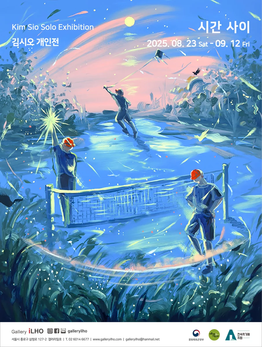 전시 개요 OVERVIEW • 전시제목: 시간 사이 • 참여작가: 김시오 • 전시기간: 2025. 08. 23 (토) – 09. 12 (금) • 관람시간: 10:30 – 18:00 (일, 월 휴관) • 전시장소: 서울시 종로구 삼청로 127-2, 갤러리일호 • 작품목록: https://blog.naver.com/galleryilho/223972271654 • 전시개요 「초-일상(超日常)의 정념 : ‘지금’을 초월하는 방법」 강지민 ‘초-일상(超日常)’의 정념 쏟아지는 햇살에 부서지는 강물, 뛰노는 아이들이 해질녘 그림자처럼 무럭무럭 자라는 모습, 새들이 푸닥거리는 모양, 커다란 등나무 아래로 떨어지는 빛 방울, 바닷물에 아스러지는 파도에 섞인 갈매기들의 울음. 평범한 모든 순간이 비범하고 찬란하다. 작품은 초현실적인 상상보다는, 익숙한 일상에 대한 감각적 이탈을 시도한다 작가가 포착하는 것은 비일상이 아니라, 지나치게 섬세하게 관찰된 ‘초-일상(超日常)’의 정념이다. 작품 속 장면은 환상이 아니다. 익숙한 것들이 너무 가까이에서 너무 오래 바라보일 때 드러나는 일종의 감각적 이탈이다. 작가는 어린이의 페르소나로 세계를 마주한다. 그는 빛의 조각들 사이를 유영하며, 현실과 상상의 경계를 넘나드는 존재로서 유니콘의 형상을 따른다. 김시오의 회화는 ‘비일상’이 아니라, 과하게 섬세하게 포착된 ‘초-일상’의 정념을 그린다. 그것은 세계를 새롭게 보게 하는 시선이 아니라, 이미 알고 있던 풍경이 느닷없이 낯설게 다가오는 감정의 역류에 가깝다. 감각의 두께, ‘지금’의 밀도 현실의 시간은 흘러가지만, 감각은 그 순간을 붙들어 맨다. 메를로퐁티는(Maurice Merleau-Ponty) 지각이 단지 외부 세계를 받아들이는 수동적 과정이 아니라, 신체를 매개로 세계와 엮이는 ‘살(flesh)의 교차점’이라고 보았다. 우리는 세계를 바라보는 주체인 동시에, 세계의 일부로서 감각되는 존재다. 이러한 감각의 상호 얽힘은 어떤 장면이 단순히 ‘보이는 것’을 넘어서 체험되고, 기억되며, 재구성되는 하나의 ‘두께’를 형성하게 한다. 김시오의 회화는 바로 이 두께의 층위를 시각적으로 구현한다. 유니콘이 풀숲을 가로지르고, 아이들이 물속으로 뛰어들며 저녁노을이 수면을 스치는 장면들은 모두 일정한 현실의 궤도에서 살짝 이탈한 상태에 머문다. 그것은 과거의 회상이거나, 현재의 몽상이며, 동시에 지금 이 순간의 감각적 실재다. 2023년 <From near and far> 시리즈는 일상적 감각의 흐름을 느슨하게 엮으며, 빛과 움직임의 순환 속에서 감정의 결을 따라간다. 반면 2025년 <Losing Game> 시리즈에서는 동일한 형상들이 더 응축된 감각의 단층으로 등장한다. 화면의 리듬은 조용하지만, 붓질은 더욱 반복되고, 색채는 중첩을 통해 깊이를 만들어낸다. 감각은 더 이상 흘러가는 것이 아니라, 응고되고, 뭉쳐지고, 잔존하는 ‘밀도’로 작동한다. 이는 메를로퐁티가 말한 ‘보는 자와 보이는 자’의 교차, 신체와 세계의 경계가 흐려지는 ‘감각의 장’과도 닮아 있다. 김시오의 회화는 바로 그 경계에서 일어나는 감각의 진동을 기록한다. 붓질과 색은 감각의 궤도를 따라 움직이며, 그 궤도는 지각의 시간 ― ‘지금’의 밀도로 이어진다. 감각으로 짜이는 세계, 회화로 엮이는 현실 김시오의 회화는 단순히 지나간 한순간을 추억하거나, 일상의 정서를 그림으로 번역하는 방식이 아니다. 그의 화면은 감각이 세계를 구성해 내는 과정, 다시 말해 ‘지각이 곧 세계를 짓는 행위’라는 메를로퐁티의 철학적 통찰을 실감 나게 드러낸다. 퐁티는 세계를 미리 정해진 객관적 구조로 보지 않았다. 오히려 세계는 우리가 감각을 통해 얽히고 스며드는 과정에서 점차 생겨나는 것으로 본다. 이 관점에서 김시오의 회화는 마치 하나의 감각적 사건처럼 작동한다. 별빛이 깔린 수풀 사이를 유영하는 유니콘, 분수처럼 퍼지는 물의 입자들, 어린아이가 줄을 넘으며 손끝으로 밤하늘을 긋는 장면은 모두 현실의 장면이라기보다는 감각의 응축이 만들어낸 또 다른 현실이다.