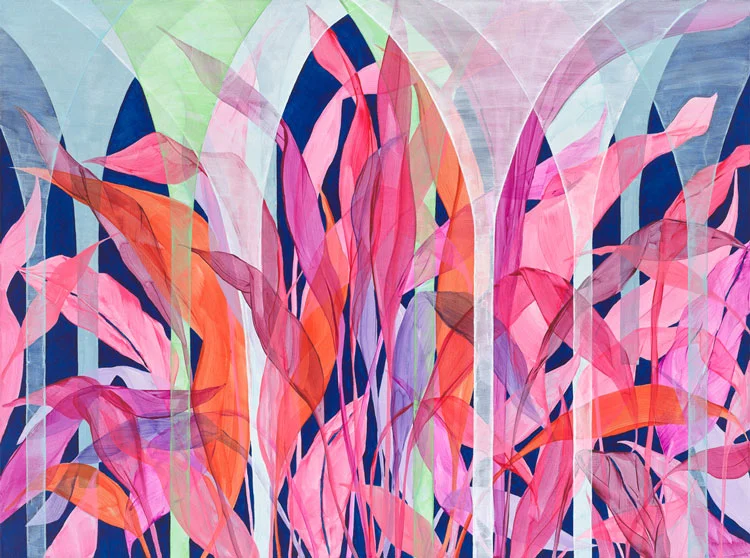 전시 개요 OVERVIEW 김미라가 표현해 낸 형상은 사실적이면서 추상에 가깝다. 외형이 있지만 정확히 보여주지 않는다. 안과 밖의 구별이 불분명한 경계를 가지며 기하학적인 면에서 사물들이 등장한다. 투명하게 번지는 색채를 사용하여 안을 들여다볼 수 있게 만드는 구성이 작업의 매력이다. 그런 작가가 이번엔 식물의 형상을 들고 나왔다. 아름답게 화면을 채우기 위해 잎은 섬세하게 선이 모이고 색은 겹치면서 또 다른 색을 보여준다. 공간의 형성보다는 보다 가깝게 평면에서 추상적으로 나타난다. 반복되지만 모호하게 잎은 여기서 기억을 환기시킨다. 오랜 시간 일관되게 주장해 온 소재로 기억은 포괄적이지만 분명하게 때로는 불분명한 성격이 있다. 화려한 색채가 있지만 현란하지 않으며 몽환적인 느낌에서 장면이 연출된다. 자연스레 흐르는 시간처럼 이렇다 할 결론 없이 작가는 잎을 그려 넣는다. 전작이 공간의 깊이감을 비틀어 기리코(Giorgio de Chirico)의 작품처럼 초현실 성격에서 무엇이 나타났다면 최근에 발견된 식물은 현실적 느낌이 강하다. 겹치고 교차되는 시선 속에 어떤 것을 덮어버리는 일로서 숨김과 감춤이 있다. 어느 날 찾아오는 감성으로 형상이 구사되지만 근접할수록 다른 것을 연상하게 만드는 것이다. 특별한 양식이나 틀도 없는 것이 현대회화의 매력인 것처럼 화면은 물감층을 전제로 장면을 선사한다. 기억으로 여겨지는 표현은 있지만 재현은 잘 드러나지 않는다. 담담한 시선 속에 표상적 사물을 만들어내는 과정이며 베르그송(Henri-Louis Bergson)의 물질과 기억은 여기서 시간의 지속성을 전제로 한다. 당시의 기억을 불러오지만 정확한 연결보다는 시간의 흐름을 전개시키는 양상이다. 순간 떠오른 기억이 현재 본인의 심리상태와 연결 되고, 하나의 지속적인 존재로서 자신의 삶을 확인받고자 한다. 작가의 식물은 과거를 거슬러 올라가는 여행이며, 재구성된 기억은 본인의 삶을 창조하는 수단이 된다. 삶이 지속된다는 증명으로 잠시 잊었다가도 어느 날 기억으로 등장하는 것이 그러한 이미지들을 통해 순간들을 확인하는 희열이 이런 창작 활동을 만들게 했다. 갈수록 빠르게 변화되는 세상 속에서 인간은 이상과 현실 사이에서 갈등하기 마련이다. 기억은 이 두 의미 사이에서 얼마만큼의 비중을 차지할까. 삶이 있는 한 반복되며 어쩌면 자신이라는 존재를 확인받는 유일한 것인지도 모르겠다. The image expressed by KIM Mi-ra is realistic and close to abstract. It has an appearance, but it doesn’t show exactly. The distinction between inside and outside has an unclear boundary, and objects appear in terms of geometry. The charm of the work is the composition that allows you to look inside using transparent spreading colors. The artist presents the shape of plants this time. In order to fill the screen beautifully, the leaves show another color as the lines gather delicately and the colors overlap. Rather than forming space, it appears abstractly on the canvas closer to it. Repeatedly but vaguely, the leaves evoke memories here. It is a material that has been consistently used for a long time, and memory is comprehensive, but clearly sometimes unclear. Although there are colorful colors, the scene is pr