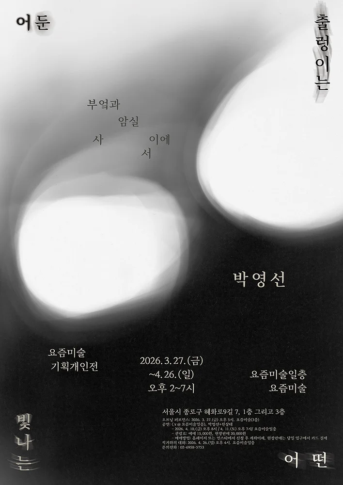 박영선은 자연과 생생을 따르는 동아시아의 산수적 세계관 전통, 그리고 수학적 연산과 사진적 재현기술로 세계를 구성/재구성하는 서유럽 근대성 사이 심연에서 진동하며 창작과 연구를 병행해왔다. 카메라 장치를 배제하고 사진 매체에 잠재된 물질적 유동성과 탈주체성을 비인간 행위자들의 참여에 기대어 탐색하는 암실 작업, 그리고 아날로그/디지털사진과 영상, 글, 소리, 냄새 등 여러 매체를 충돌시키며 그 사이 여백을 찾는 탈장르적 설치와 퍼포먼스를 장소특정성에 연결지어 시도하는 중이다. 그럼으로써 작가의 주체성과 개인성을 덜어내고 장소-관객-청중과 함께 물질-비물질 행위자들이 생생하는 찰나적 사건과 조우하는 어떤 (불)가능한 체험-이야기를 모색한다. 중고 올림푸스팬 하프 사이즈 카메라로 만든 짝틀사진들을 발표하며 미술계에 데뷔하여 6회의 개인전을 열었고, 몇몇 기획전과 공연에 참여했다. 사진 미디어와 카메라 장치를 둘러싼 문화 현상, 그리고 사진과 카메라를 창작 매체로 사용하는 작가들의 예술실천에 관한 평문과 논문 들을 썼다. 공연: 〈x@요즘미술일층〉 참가: 박영선, 진상태 일시: 2026. 4. 10.(금) 오후 8시 / 4. 11.(토) 오후 7시 장소: 요즘미술일층 관람료 예매: 15,000원, 현장판매 20,000원 예매방법: 홈페이지 , 인스타로 신청 후 계좌이체, 현장판매는 당일 입구에서 카드 결제 참여작가: 박영선 기획: 요즘미술