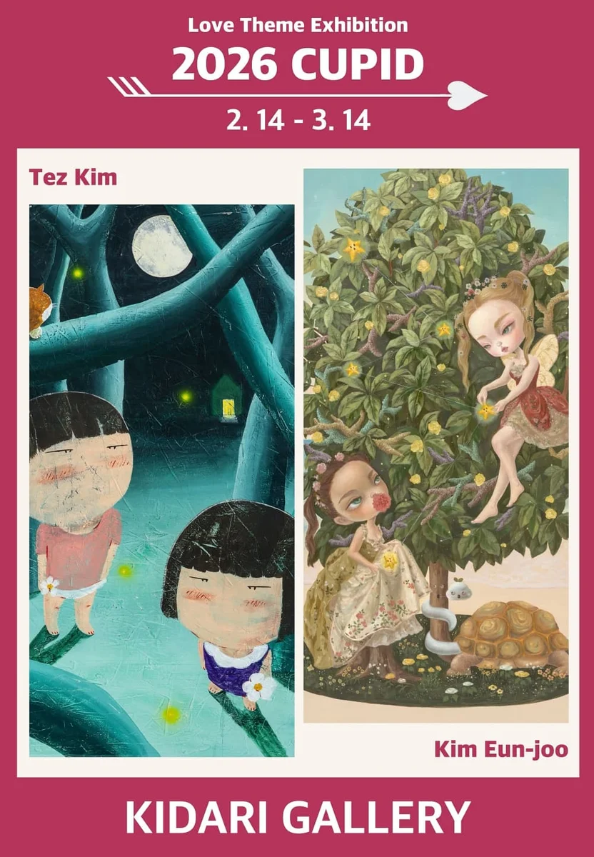키다리갤러리가 오는 2월 14일부터 3월 14일까지 러브테마 기획전 '2026 큐피트'를 개최한다. 큐피트 전시는 매년 발렌타인데이와 화이트데이 시즌을 기념해 사랑을 주제로 한 작품들을 전시하며 관람객들에게 '사랑'의 정의에 대한 생각과 메시지를 전하는 테마 전시로 올해 12회째를 맞이한다. '사랑'이라는 보편적인 주제를 예술적인 시각으로 꾸준히 재해석하며 관람객에게 따뜻한 감동을 전해줄 수 있는 작가의 작품들로 선정하여 전시 공간을 꾸미는 올해 큐피트 전시에는 테즈킴, 김은주 작가가 참여하며 각기 다른 온도의 사랑과 관계에 대한 이야기를 펼쳐낸다. ᅠ 테즈킴 작가는 과학과 이성의 시대에서 사랑이라는 위치를 냉철하면서도 따뜻한 시선으로 바라본다. 작가는 사랑이 종족 번식을 위한 유전적 명령이나 호르몬의 작용이라는 과학적 사실의 낭만적 해석이라는 것을 부정하지 않는다. 그는 그럼에도 불구하고 인간이 이러한 생물학적 메커니즘 위에 무조건적이고 이타적인 사랑이라는 숭고함을 예술을 통해 덧입히는 행위에 집중한다. 작가는 존재하지 않는 것을 믿고 가치를 부여하는 인간의 상상력이야말로 가장 인간적인 행위라고 정의한다. 또한 사랑이라는 허구적 판타지를 공유하고 믿음으로써 그것을 현실로 만들어가는 과정을 통해 비로소 인간적임이라는 말이 사랑스럽다는 말과 동격이 되는 시대가 올 것이라 믿으며 그런 마음을 작품에 담아냈다. 김은주 작가의 작품에는 마법소녀가 등장하는데 이 소녀들은 영웅적인 상징보다는 결핍과 욕망, 취약함과 차이를 지닌 채 세계와 관계를 맺는 존재에 가깝다. 신화적 서사와 자연의 이미지는 개인의 내면과 동시대의 정서를 연결하는 매개로 작동하며, 그 연결은 완결이 아닌 진행형으로 남는다. 이번 전시에서 작가는 사랑을 달콤한 결말로 표현하기보단 타인에게 닿고자 하는 마음이 만들어내는 방향과 거리, 그리고 그 사이의 망설임과 충돌에 주목한다. 큐피트의 화살은 상처를 내기보다는 관계가 시작되는 순간 생겨나는 균열과 감각의 통로처럼 보이기도 한다. 'Red Thread' 연작에서는 화면을 가로지르는 붉은 선을 통해 연결과 긴장이라는 감정을 시각화하며, 사랑은 때로는 매끄럽게 이어지기보단 다른 감각과 위치가 한 장면 안에 공존할 때 드러나는 어긋남의 결로 남는다. 'Sea Constellation' 연작에서는 같은 하늘 아래 다른 방향을 보는 개인들이 서로의 별이 될 수 있음을 보여준다. 작가는 타인을 바라보는 시선, 자신을 확인하는 시선, 그리고 눈을 감고 감각으로 이동하는 세 가지 태도를 통해 사랑이 지닌 여러 방식으로 지속되는 관계의 형식에 대해 이야기한다. 이번 전시를 기획하고, 작가를 선정한 키다리 갤러리 김민석 대표는 '2026 큐피트'전의 전시 기간이 발런타인데이에 시작해서 화이트데이에 끝나는 설정처럼 사랑의 큐피트 화살이 양방향으로 오고가서 서로의 마음이 전해지며 가슴 따뜻하고, 설레이는 관람 공간이 될 수 있기를 바란다고 전했다. 이번 큐피트 전시에는 닮은 듯하면서도 다른 테즈킴, 김은주 두 작가의 회화 작품 총 14점이 전시된다. KIDARI GALLERY will host the love-themed exhibition “2026 Cupid” from 14 February to 14 March. The Cupid exhibition, now in its twelfth year, is a themed display held annually to commemorate the Valentine's Day and White Day season. It showcases works centred on love, conveying thoughts and messages about the definition of “love” to visitors. This year's Cupid exhibition, which consistently reinterprets the universal theme of “love” through an artistic lens and curates works by artists capable of conveying warm emotion to visitors, features artists Tez KIM and Kim Eun-joo. They will each unfold stories about love and relationships at different temperatures. Tez KIM the author observes the position of love in the age of science and reason with a gaze that is both coolly detached and warmly compassionate. The author does not deny that love is a romantic interpretation of scientific facts a genetic imperative for species propagation or the workings of hormones. Nevertheless, he focuses on the act of humans, through art, overlaying the sublime quality of unconditional and selfless love upon these biological mechanisms. The artist defines the human imagination believing in and assigning value to the non-existent as the most quintessentially human act. He believes an era will come when the term “humanity” becomes synonymous with “loving,” achieved through sharing and believing in the fictional fantasy of love, thereby transforming it into reality. This sentiment is captured in his work. Kim Eun-joo's works feature magical girls, yet these figures are less heroic symbols than beings who engage with the world bearing deficiencies and desires, vulnerability and difference. Mythical narratives and images of nature function as mediators connecting the individual psyche with the sentiments of the contemporary era, and this connection remains an ongoing process rather than a conclusion. In this exhibition, the artist focuses less on depicting love with a sweet ending and more on the direction and distance created by the desire to reach another person, along with the hesitation and conflict that arise in between. Cupid's arrow seems less like a wound and more like a crack and a sensory passageway that emerges at the very moment a relationship begins. In the ‘Red Thread’ series, emotions of connection a