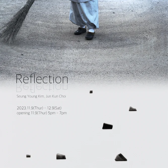 전시 개요 OVERVIEW opening 11. 9(Thur) 5-7pm 예술은 현실을 반영함과 동시에 이상향을 드러내는 수단이기도 하다. 그렇기에 예술은 우리가 살아 숨 쉬는 현재뿐만 아니라 경험하지 못한 과거와 경험하지 않은 미래를 담곤 한다. <Reflection>은 김승영, 최준근 작가가 스스로를 투영한 작품을 통해 간접적으로 작가의 시간과 철학을 느낄 수 있는 자리를 마련한다. 김승영 작가의 설치작품은 가을날의 공기를 떠올리게 한다. 새벽녘 스님의 비질 소리와 사각거리는 종이 소리가 더욱 그렇다. 작가는 이처럼 구체적인 기억과 경험 그로 인해 파생된 감정을 작품에 직접적이고 적극적으로 반영한다. 그 수단으로써 사용된 공간은 삶의 자취를 시각적으로 감각하여 각성할 수 있는 토대로서 작용한다. 최준근 작가는 흰 바탕에 제주도의 검은 현무암이 무심히 자리 잡힌 풍경을 탄생시킨다. 한 붓씩 먹 층을 쌓아 올리는 시간이 축적될수록 작가의 감정과 상념이 작품에 반영되어 그야말로 공(空)간의 서사를 만들어낸다. 원근이 존재하지 않는 작품 속 무한한 공간은 자체적으로 생명력을 얻어 감상자의 내면까지 확장된다. 두 작가의 작품은 형식의 교집합이 크지 않지만 결론적으로 명상적 체험을 제공하며, 정서적인 교감을 다룬다는 유사점을 가지고 있다. <Reflection>에서 다른 듯 같은 두 작가를 한자리에서 만남으로써 고유한 경험을 재 사유하고 더 나아가 확장하고 치환할 수 있는 차원을 마주할 수 있길 바란다. More Info