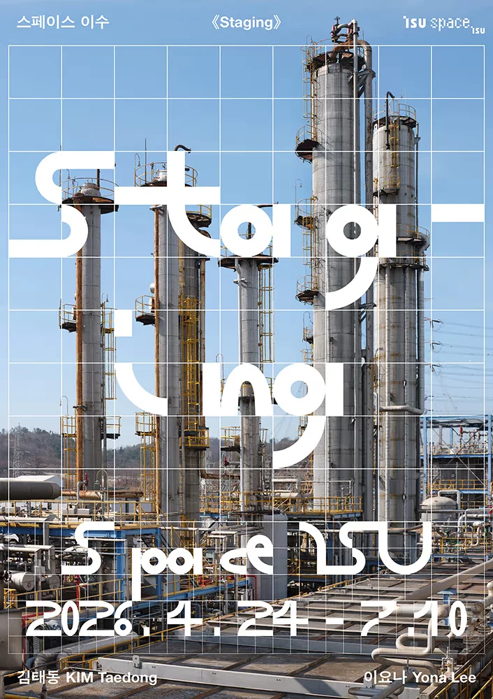 Staging 무엇인가를 기념하는 행위는 시간을 잠시 멈춰 세운다. 끝없이 흐르는 시간의 한 부분을 현재로 삼아 과거를 되돌아보며 미래에도 기억할 만한 것들을 헤아려본다. 한 기업의 출범을 기념하는 일도 마찬가지다. 그동안의 성과를 살피고 더 나은 미래를 다짐한다. 이수그룹 출범 30주년 기념전 《Staging》은 이러한 일반적인 기념의 방식에서 벗어나 기념을 기업이 다양한 관계와 요소들이 서로 연결되어 변화를 거듭하는 상태에 놓여 있는 존재임을 드러내는 지점으로 삼고자 한다. 이를 위해 전시는 프랑스의 과학기술학자 브뤼노 라투르(Bruno Latour)의 행위자-네트워크 이론(Actor-Network Theory; ANT)의 몇 가지 사유를 빌려온다. ‘무대 연출’을 뜻하는 전시 제목 ‘Staging’은 라투르가 어떠한 존재와 사실이 우리 앞에 드러나게 되는 특정한 상황을 설명할 때 사용하는 용어이다. 그에게 존재는 새롭게 발견되는 것이 아니라, 여러 행위자와 조건이 만들어내는 상황 속에서 모습을 드러내는 것이다. 이와 같은 사유를 전시라는 매체와 연결지어 행위자들과 그들이 구성하는 네트워크가 가시화되는 무대가 되고자 하는 《Staging》은 김태동과 이요나에게 이수그룹의 30년의 시간을 다루는 작품을 제안하였다. 작가들은 이수그룹의 여러 현장을 살피고, 구성원들이 사용하던 물품과 기록을 수집하여 이를 작품의 출발점이자 재료로 삼았다. 김태동은 이수화학 온산공장의 건설 과정을 담은 기록사진과 최근 공장을 방문해 촬영한 사진과 함께 배치하고, 이수페타시스 대구공장에서 생산되는 PCB(인쇄회로기판) 제조 과정을 담은 사진, 이수건설의 아파트 브랜드 ‘브라운스톤’ 앞에 자리한 공공조형물을 촬영한 사진으로 구성된 〈프로젝트 이수〉를 선보인다. 아무것도 존재하지 않았던 빈 부지에 공장 타워가 세워지는 과정을 담은 과거 사진부터 복잡하게 얽힌 파이프라인 사이로 불빛과 연기를 내뿜는 현재의 이수화학 공장 모습이 병치된 〈프로젝트 이수〉는 과거와 현재를 동시에 감각하게 한다. 또한, 이 작품은 원통형 탱크와 배관, 다양한 공장의 설비와 핸드휠을 돌리는 근로자의 모습을 통해 공장을 움직이게 하는 요소와 시간을 드러내는데, 근로자의 손을 통해 반복적으로 회전해온 핸드휠은 근로자의 행위와 결합되어 공장의 작동을 가능하게 하는 비인간 행위자로 참여하고 있다. 수많은 절연판들이 이동하고 겹쳐지며 회로가 새겨지는 PCB 제작 과정을 포착한 작업은 전자기기 내부에 자리해 보이지 않지만 우리의 사고와 행동에 영향을 미쳐온 PCB를 또 다른 비인간 행위자로서 드러낸다. 한편, 브라운스톤의 공공조형물을 담아낸 작업은 사진에 직접 드러나지 않는 주변 거주자들과 공공조형물이 형성해온 관계, 그리고 공공조형물이 놓인 장소와 주변 건물이 맺는 관계를 환기한다. 전시장 중앙에 위치한 이요나의 작품 〈창고(Load Bearing)〉는 스테인리스스틸 파이프와 이수화학, 페타시스, 건설, 앱지스 등 이수그룹의 여러 계열사에서 모은 물품으로 이루어진 설치 작업이다. 이요나의 작업에서 파이프는 열차, 버스, 지하철 등 전 세계 도시의 공공장소에서 인간의 움직임에 개입하거나 시계와 램프 같은 일상의 사물과 연결되며 공적 공간과 사적 공간의 경계를 흐리는 요소로 작동해왔다. 또한 파이프가 건물 내부에서 물과 가스, 오물이 오고 가는 통로로 사용된다는 점은 작가의 작업에서 이동과 연결을 떠올리게 하는 중요한 요소로 작용한다. 이번 전시에 사용된 파이프는 주변에 설치된 김태동의 사진 속 배관과 연결되며 산업 재료로서의 인상을 강화한다. 동시에 이 파이프 구조물은 공장에서 사용되는 팔레트와 폐기계 및 장비, 실험 도구와 작업복, 상패와 청소 도구 등을 떠받치는 좌대이자, 내부의 사다리를 통해 여러 시간과 행위가 겹쳐진 오브제를 만날 수 있는 수장고이자 다락방으로 기능한다. 하나의 거대한 덩어리를 이루는 물품들을 지탱하고 있는 이 설치 작업은 멀리서 보았을 때 기념비적 스케일을 지닌다. 동시에 관람자를 구조물 중앙에 자리한 사다리로 이끌고, 기업을 이루는 요소로 쉽게 인식되지 않을 수도 있는 사소하고 일상적인 물품들을 마주하게 하며 기존의 위계를 흔든다. 이는 선형적 시간이나 수직적 구조에서는 포착되지 않는 근로자와 그들이 사용하던 물품, 과거의 기술과 기계, 그리고 기억과 경험이 서로 얽혀 형성된 기업의 네트워크를 드러낸다. 김태동과 이요나의 작품이 놓인 《Staging》이 행하는 기념은 견고하게 구축된 구조와 시간을 지닌 기업을 끊임없이 변화하는 네트워크로 바라보고, 그 안에서 인간과 비인간 행위자가 만나 변화를 만들어내는 과정을 전달하는 일에 가깝다. 전시가 진행되는 동안 작품과 관람자는 서로를 마주하며 변형되고, 다양한 행위자들로 구성된 기업의 네트워크와 연결되며 예기치 못한 관계의 형성을 이어갈 수 있을 것이다. *출처: 스페이스 이수