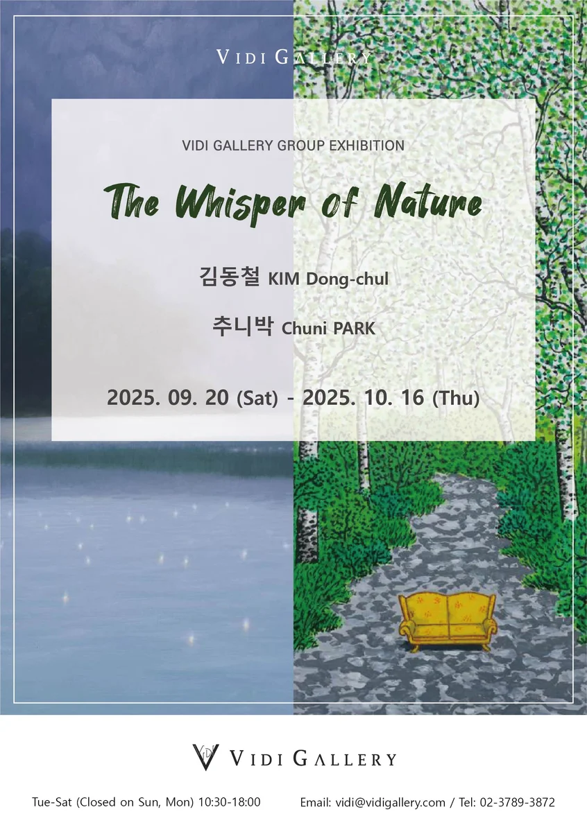 전시 개요 OVERVIEW 비디갤러리에서는 09월 20일부터 10월 16일까지 김동철, 추니박 작가의 2인전인 <The Whisper of Nature>를 진행한다. 두 작가는 자연을 바라보는 독창적 시각과 다각적인 관점에 대해 모색하며, 그 아름다움에 대한 새로운 해석을 제시한다. 아울러 자연의 한 장면을 포착하여 서로 다른 화풍으로 감상자에게 자연으로부터의 경험과 영감, 내면의 이야기를 전한다. 김동철 작가는 자연풍경을 그린다. 그러니 풍경화가이다. 하지만 막상 그의 풍경화를 보면 단순히 풍경화라고 동의하기 어렵다. 우리의 눈에 익은 자연주의 및 사실주의나 인상주의 화풍과는 다르기 때문이다. 기존의 어느 표현의 양식에도 선뜻 대입하기가 어려운 독자적인 관점이 반영해 있다는 점에서 독특하다. 독특하다는 것은 주관적인 시각이 형성해 있음을 의미한다. 그렇다. 그는 자연을 보는 방식이 남다르다. 마음의 우유 빛 유리를 통해 세상과 만난다. 우유 빛 유리를 통하면 구체적인 형태가 걸러짐으로써 희미한 안개 풍경과 같은 이미지만이 남는다. 그는 이처럼 구체적인 형태미를 여과하여 실루엣처럼 흐릿하게 처리한다. 이처럼 그의 시선은 자연의 외적인 형태의 아름다움을 찬미하는 일반적인 풍경화의 형식을 벗어나 있다. 이는 시각적인 이해의 울타리 바깥에 자리하는 미묘한 자연현상을 주시하려는 것이다. 다시 말해 시시각으로 낱낱이 파악할 수 있는 실체가 아닌 정서적인 감응을 유도하는 자연현상을 포착하려는 것이다. 물론 안개나 물 비늘, 수면에서 반사하는 햇빛 따위는 시시각으로 분별할 수 있는 자연현상이다. 하지만 그와 같은 자연현상에서는 시각적인 이해보다 감정적인 반응이 선행한다. 정서적인 감응이 먼저 일어나는 것이다. 그는 바로 이와 같은 정서적인 효과를 극대화한다. (미술평론가 신항섭) 추니박 작가는 한국의 아름다운 사계절을 현대적인 감각으로 재 탄생시킬 방법에 대해 오랜 기간 연구해왔다. 이러한 고민은 작가가 ‘동양화’라는 특수한 전공을 선택한 것으로부터 시작되었다. 동양화과에서 학생들이 배우는 것은 전통적인 필법과 화론이었고, 소재에 있어서도 매우 한정된 범위 안에서 선택되었다. 그 결과로 당시 동양화는 현대적으로 변화하는 도시의 건축물들과 어울리지 않게 되었고, 그런 공간에서 살아가는 현대인들에게는 무척 낯선 미술로 받아들여지는 것이 현실이었다. 작가는 그 문제에 대해 늘 고민하며, 새로운 장르의 동양화, 그러니까 먹과 한지를 이용한 새로운 스타일의 그림을 창조해내고자 하였다. 1996년 첫 개인전을 시작으로 작가는 풍경을 다양하게 해석하고, 해체하고 다시 구성하면서 조형과 개념에 대해 지속적으로 의문을 던지는 작업을 진행해왔다. 최근에는 한국의 풍경을 벗어나 미국과 유럽, 호주 등 다양한 나라의 자연을 한지 위에 그리는 작업을 진행하고 있다. 동양화의 붓은 서양의 붓에 비해 붓 털이 길고 가는 편이다. 작가는 그러한 붓의 장점과 특징을 살려 세계의 풍경을 독자적인 시각과 기법으로 재해석해 내는데 집중하고 있으며, 그런 필법과 강열한 채색을 혼합한 자신만의 화풍을 만들어 나가는 것에 중점을 두고 있다.