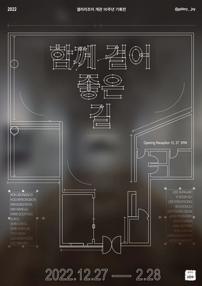 전시 개요 OVERVIEW 2012년 개관하여 2022년 10주년을 맞았다. 갤러리조이와 함께 긴 시간 묵묵히 걸어 온 작가들께 감사의 마음을 전하며 22명의 작가들과 꽃길 같은 -함께 걸어 좋은 길-로 잔치를 시작한다. 최근 포스트 코로나와 경제 위기 상황 속에서 미술시장도 변화를 모색하며 새로운 활로를 찾고 있다. 온라인 뷰잉룸을 비롯한 메타버스를 활용한 NFT와 신종 아트테크들, 그리고 MZ세대를 겨냥한 흥미롭고 조화로우며 독창성 있는 작품들로 가치를 창출하려는 움직임이 활발하게 일어나고 있다. 이 모든 것에 순응하며 시류에 편승하되 주체 의식을 잃지 않고, 현재와 미래의 교차지점에서 새로운 감각을 일깨워, 삶과 예술의 상호적 감응을 바탕으로 상황에 흔들리지 않고 변화로부터 만들어지는 새로운 예술을 꿈꾼다. 우리가 함께라면 없던 길도 만들고, 내가 가면 길이 된다는 당당함으로 갤러리조이는 언제나 신선한 감각으로 더 다양하고, 더 광범위하고, 더 깊숙이 소통과 공감의 대중미술을 이끌어 갈 것이다. 다사다난 했던 한해를 정리하고 감사함으로 마무리 하며, 갤러리조이와 함께 한 작가들과 그림을 사랑하는 모든 이들에게 기쁨과 행운이 넘치는, 몸과 마음이 한층 자유로운 2023 계묘년 새해가 되길 기원해본다. 함께 걸어 좋은 길 2022 참여작가 고정수 구명본 김성연 김왕주 박수용 손 일 신 철 신홍직 유진재 이강윤 이민한 이성재 이순구 이혜형 임근우 전영근 정영모 조덕래 한희원 허종하 홍경표 홍찬효