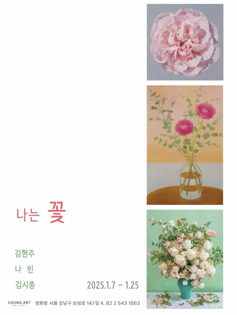 전시 개요 OVERVIEW 청화랑은 1월전시로 김시종, 김현주, 나빈 작가의 <나는 꽃> 전시를 개최합니다. 꽃을 사랑하는 세명의 작가들은 회화와 사진 등의 기법으로 섬세하게 작업을 하고 있습니다. 올한해 꽃처럼 활짝 피어나길 바라는 마음으로 기획한 이번 전시에 많은 관심부탁드립니다.